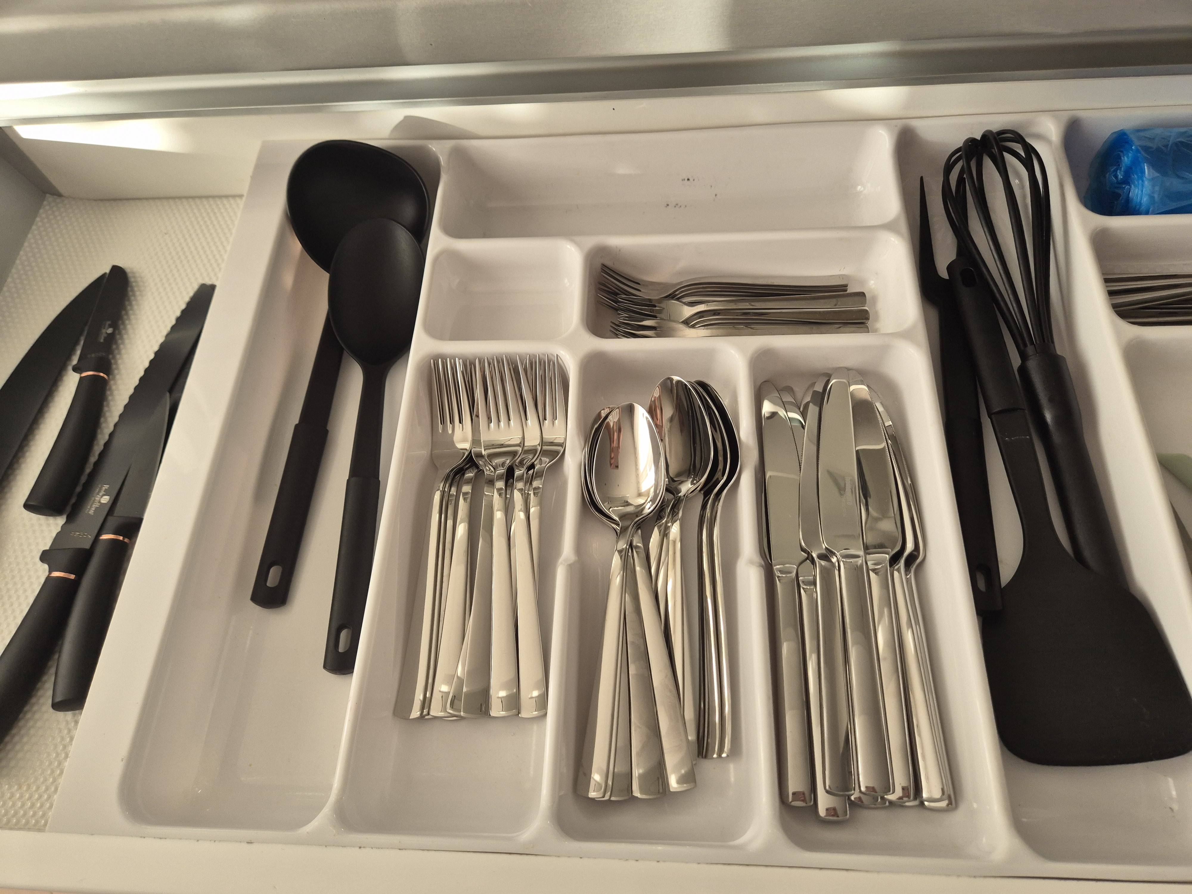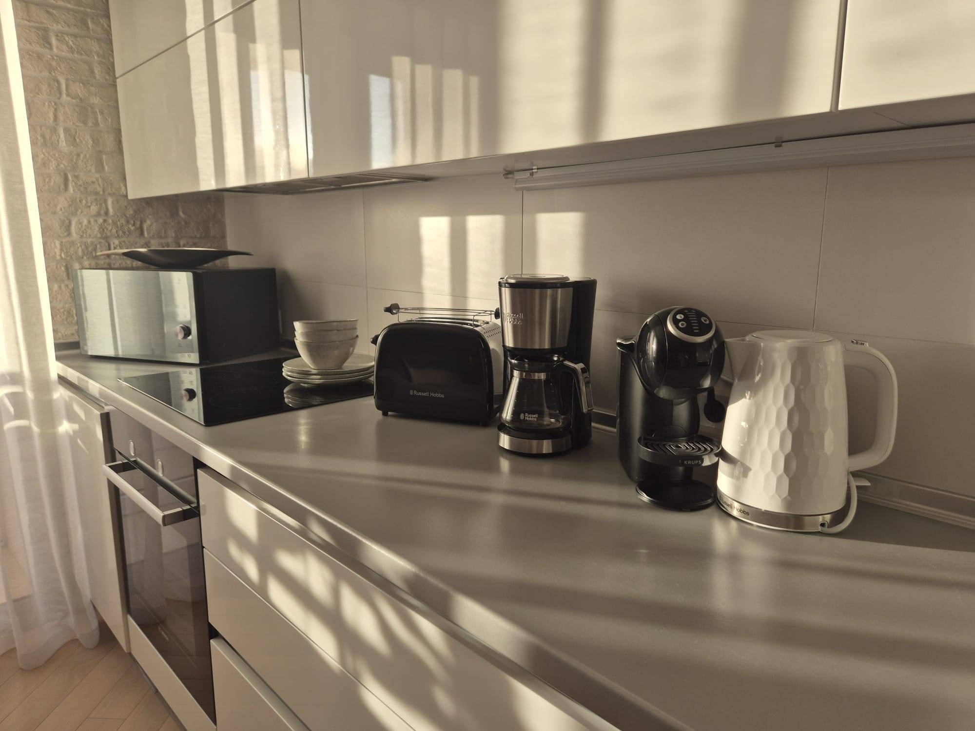 2) Полностью оборудованная кухня с холодильником, СВЧ-печью, индукционной плитой и электрическим чайником.