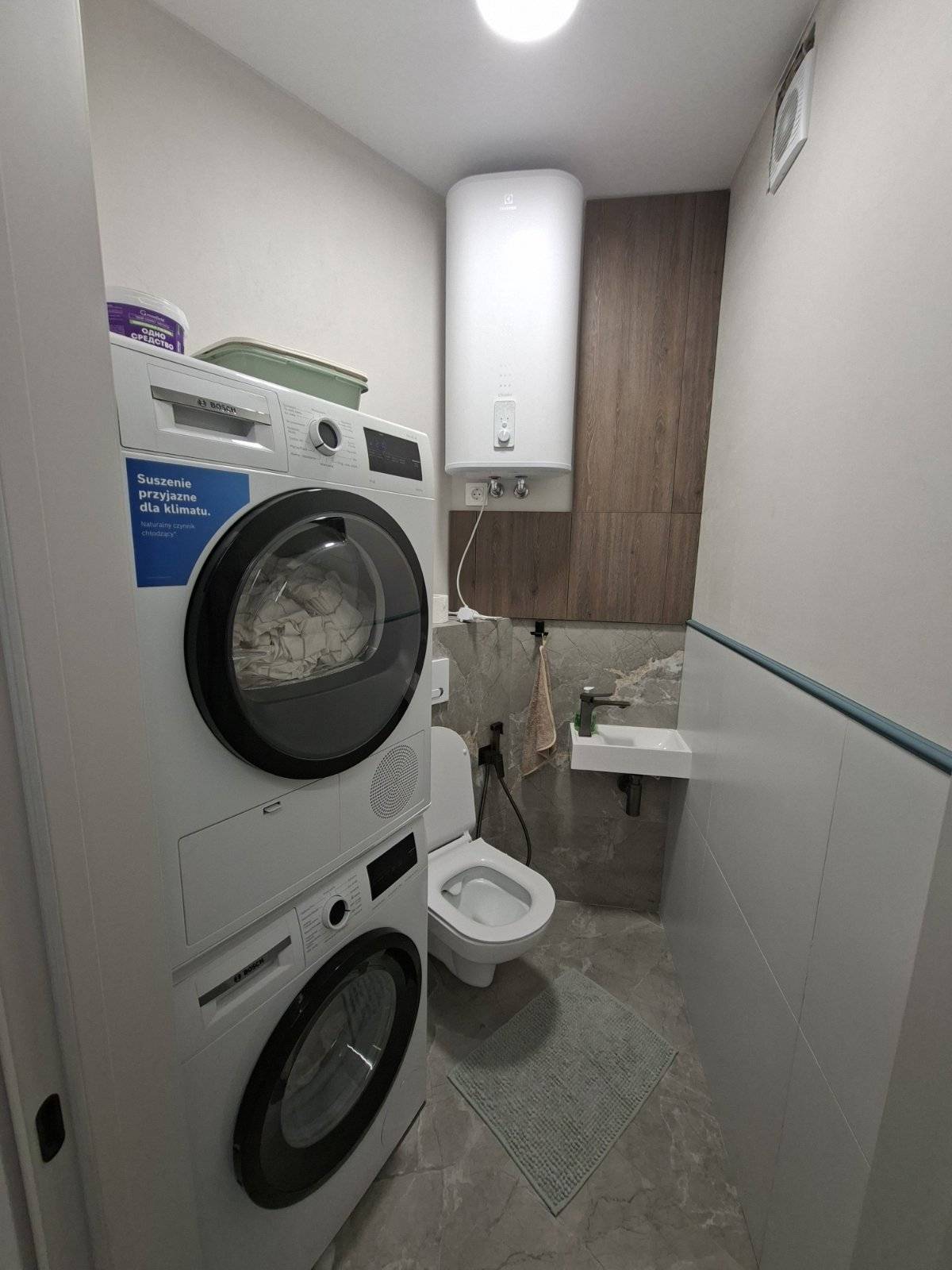 В квартире имеется вся бытовая техника: кондиционер, духовой шкаф, микроволновая печь, посудомойка, сушильная и стиральная машинки.