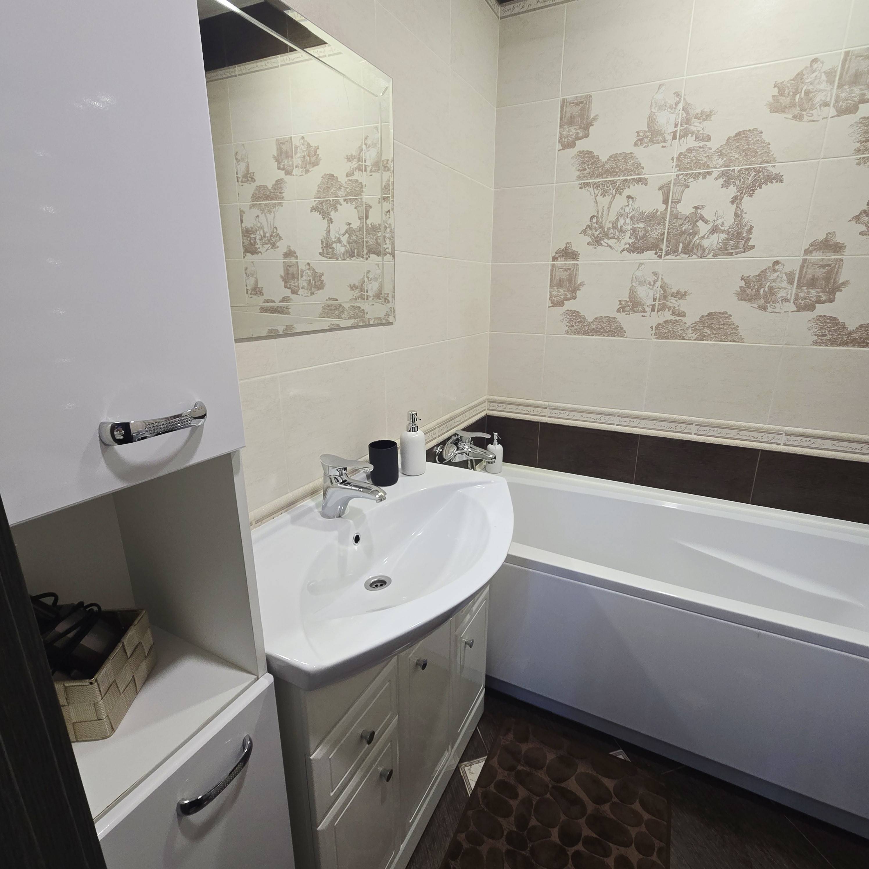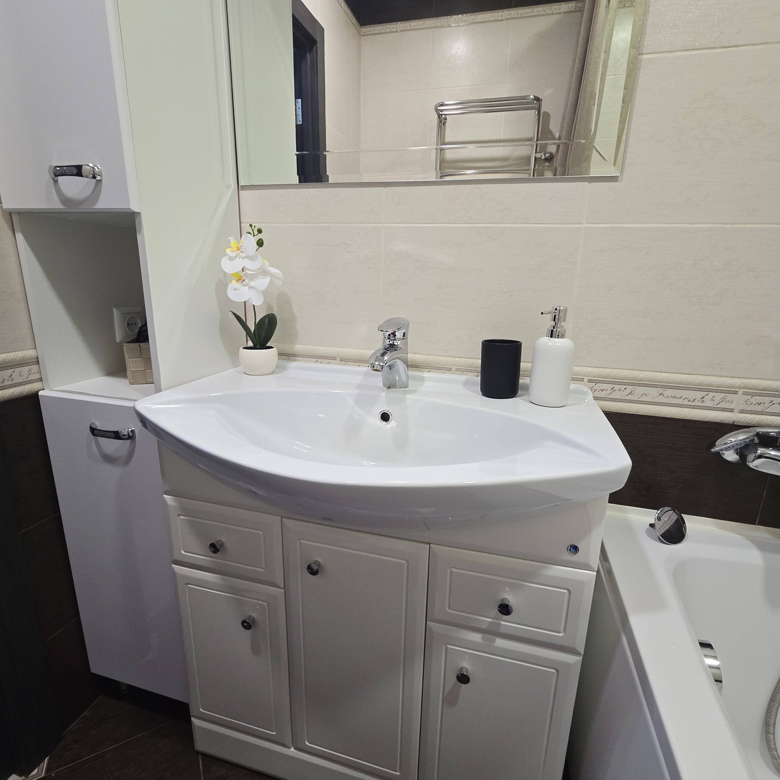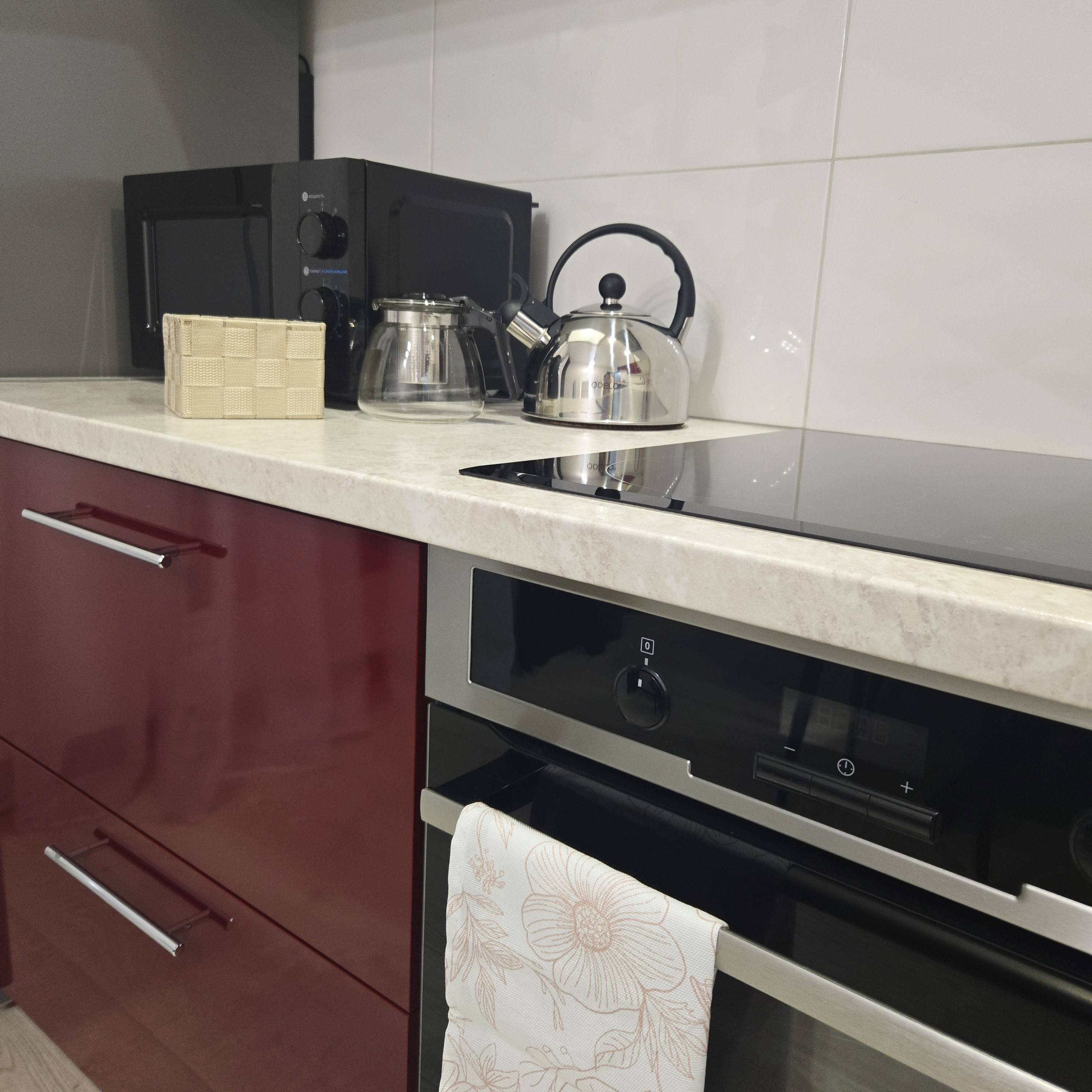 Для комфортного проживания есть всё необходимое: 2-спальная кровать с удобным ортопедическим матрасом, 2-спальный диван-кровать, телевизор, Wi-Fi, кабельное телевидение, кондиционер, холодильник, варочная панель, духовой шкаф, микроволновка, чайник, необходимая посуда, столовые приборы (соль, сахар, перец, чай, кофе, подсолнечное масло, лёд), утюг, гладильная доска, фен, стиральная машина, пылесос, два вместительных встроенных шкафа, одеяла, подушки, пледы, комплект постельного белья, комплект полотенец, мыло, гель душ.