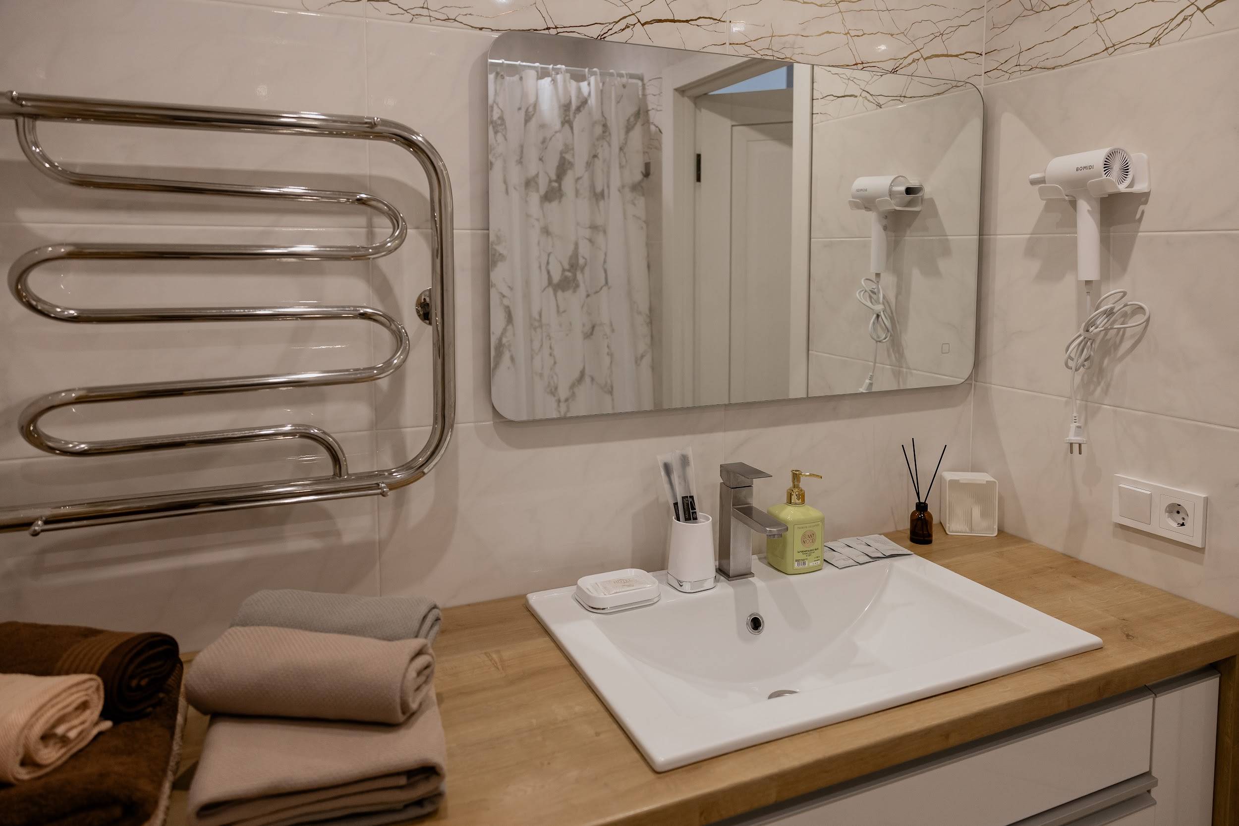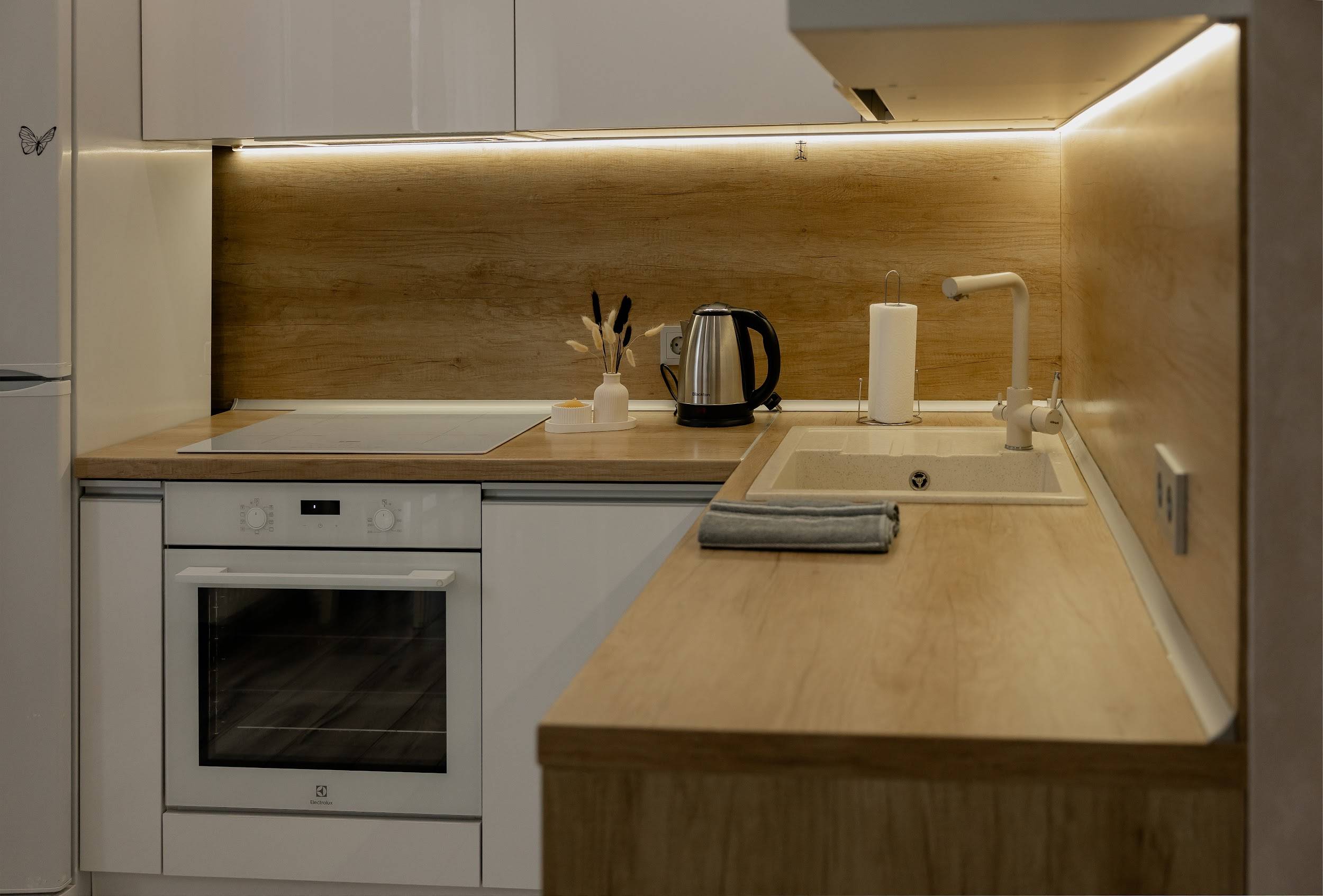 Квартира оснащена всем неоходимым: два телевизора, холодильк, варочная панель, микроволновая печь, посудомоечная машина с капсулой, элекрочайник, фен, утюг, гдильная доска, стиральная машина с порошком.