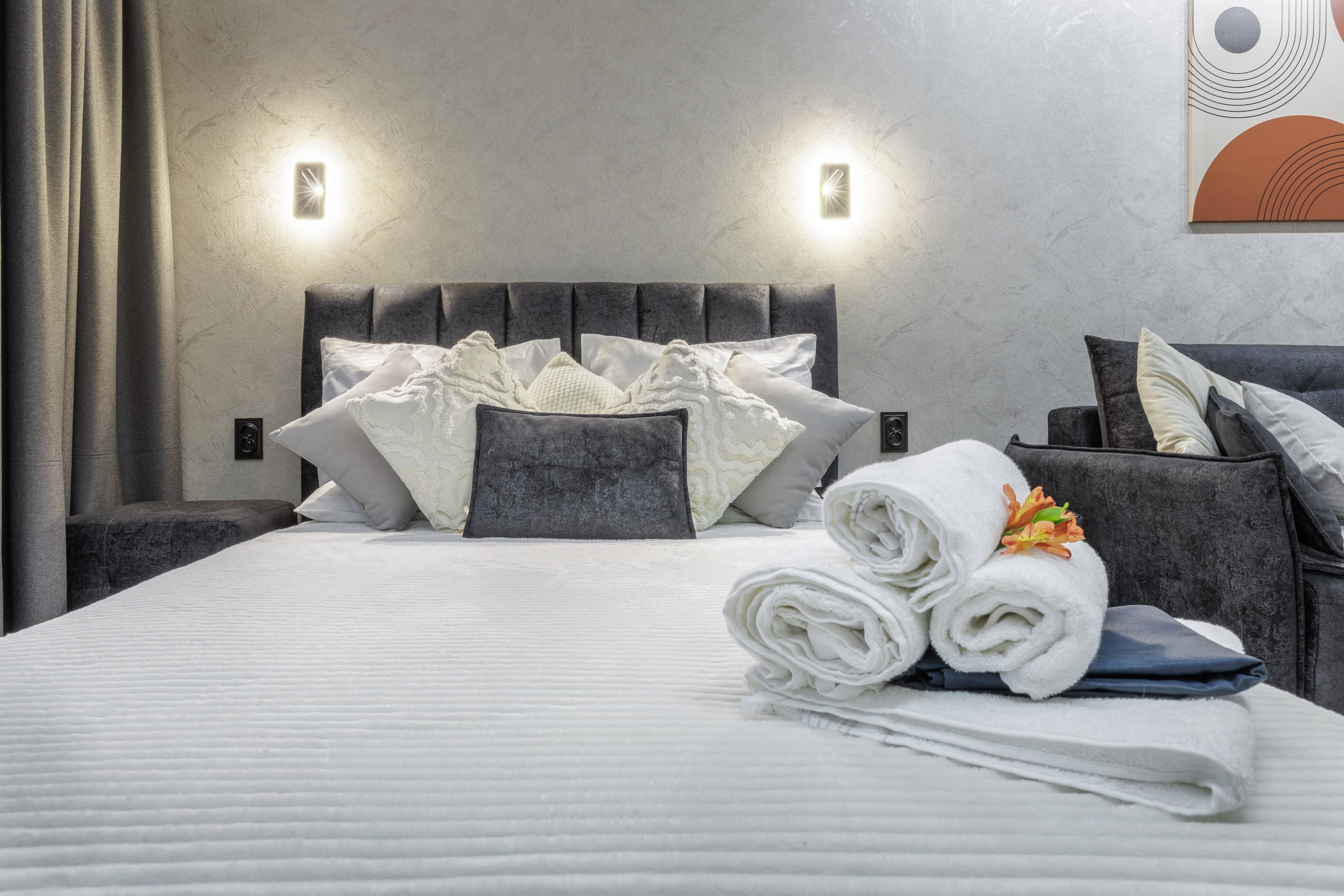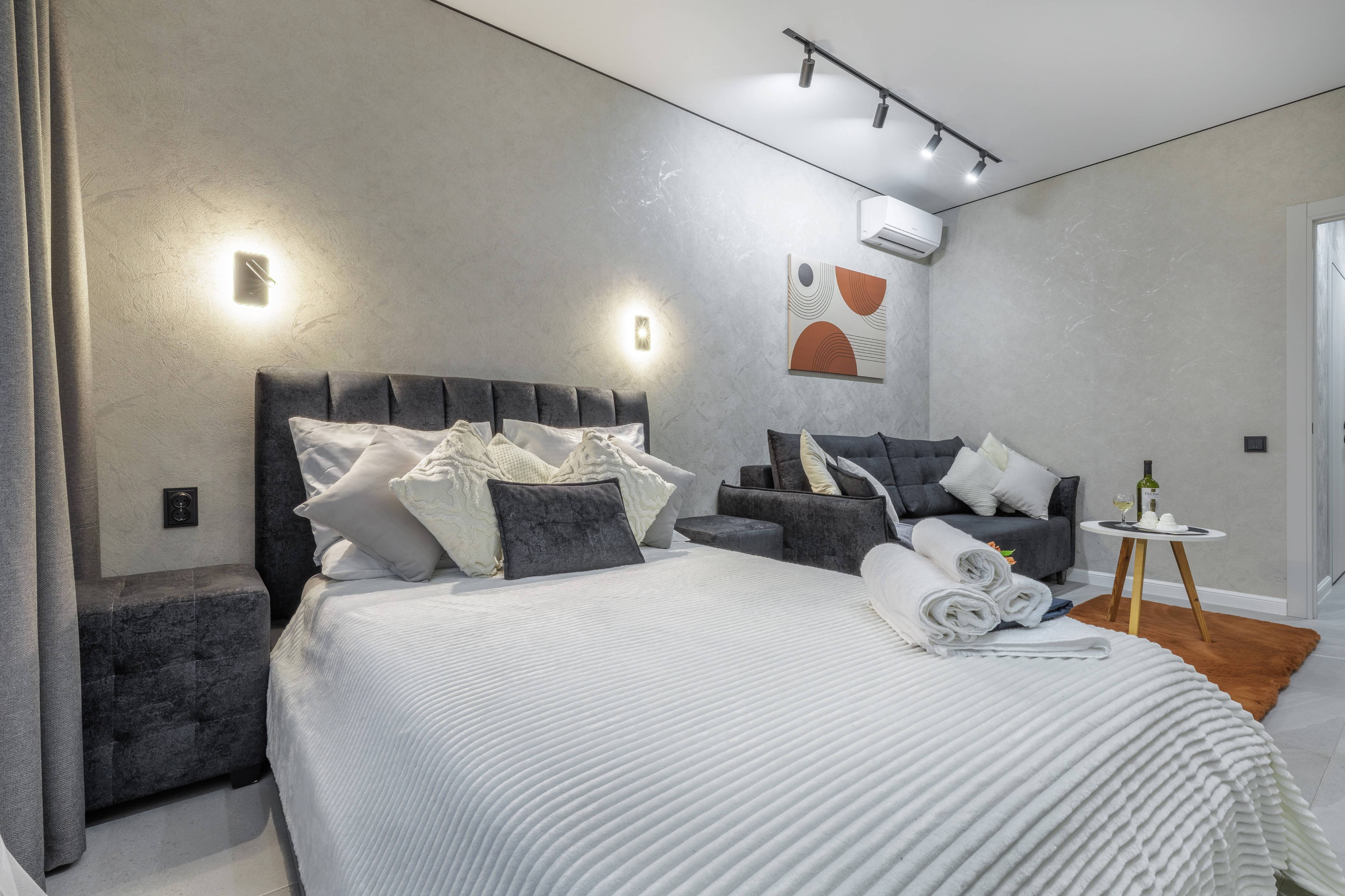 Имеется две двухспальные кровати, вместительный диван и кресло -кровать. Летом не будет жарко-установлен кондиционер. Современная кухня оборудована всей необходимой техникой, включая посудомоечную машину.Имеется парковочное место в подземном паркинге.Стоимость за проживание будет зависеть от времени и количества проживающих)