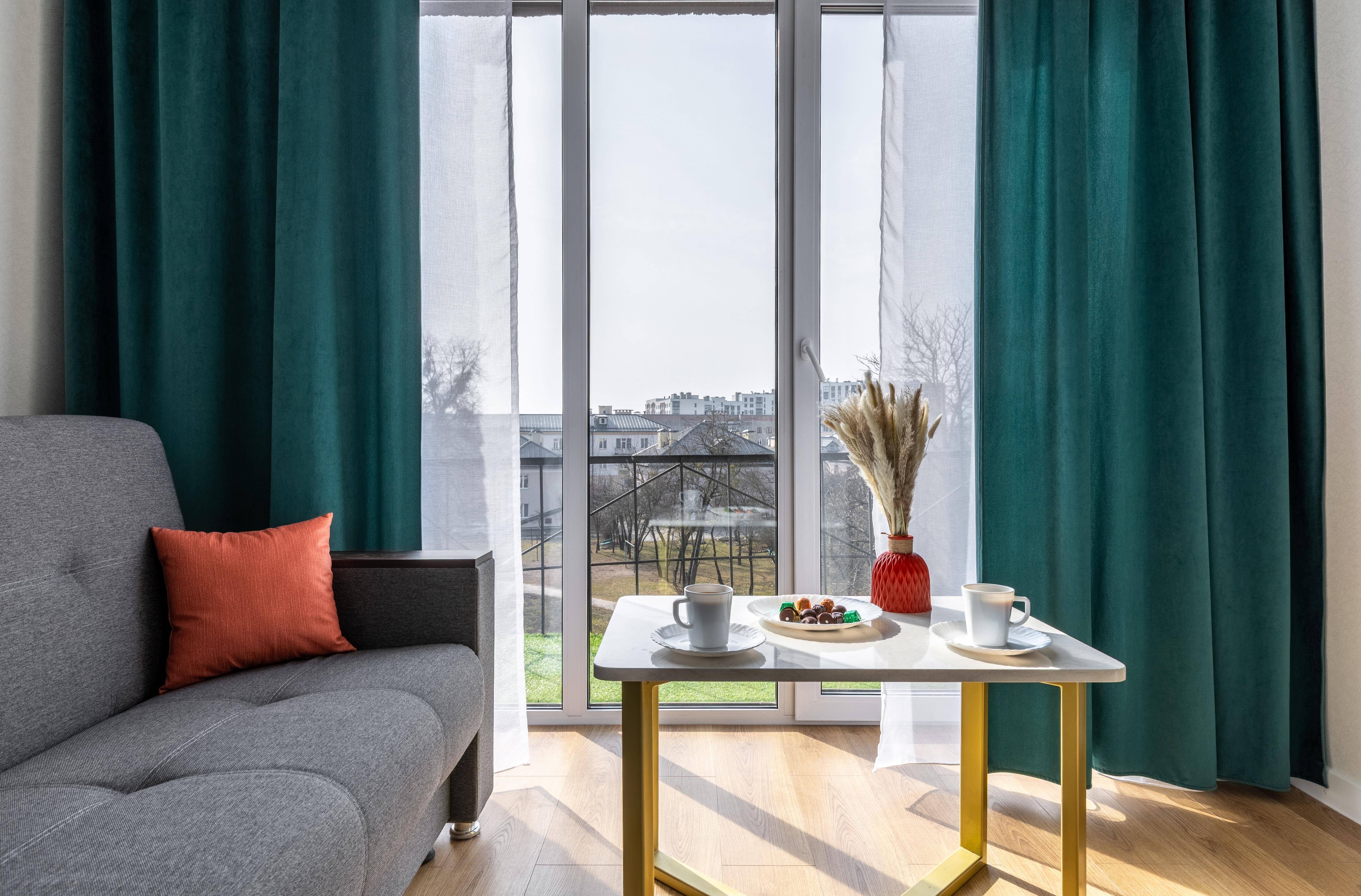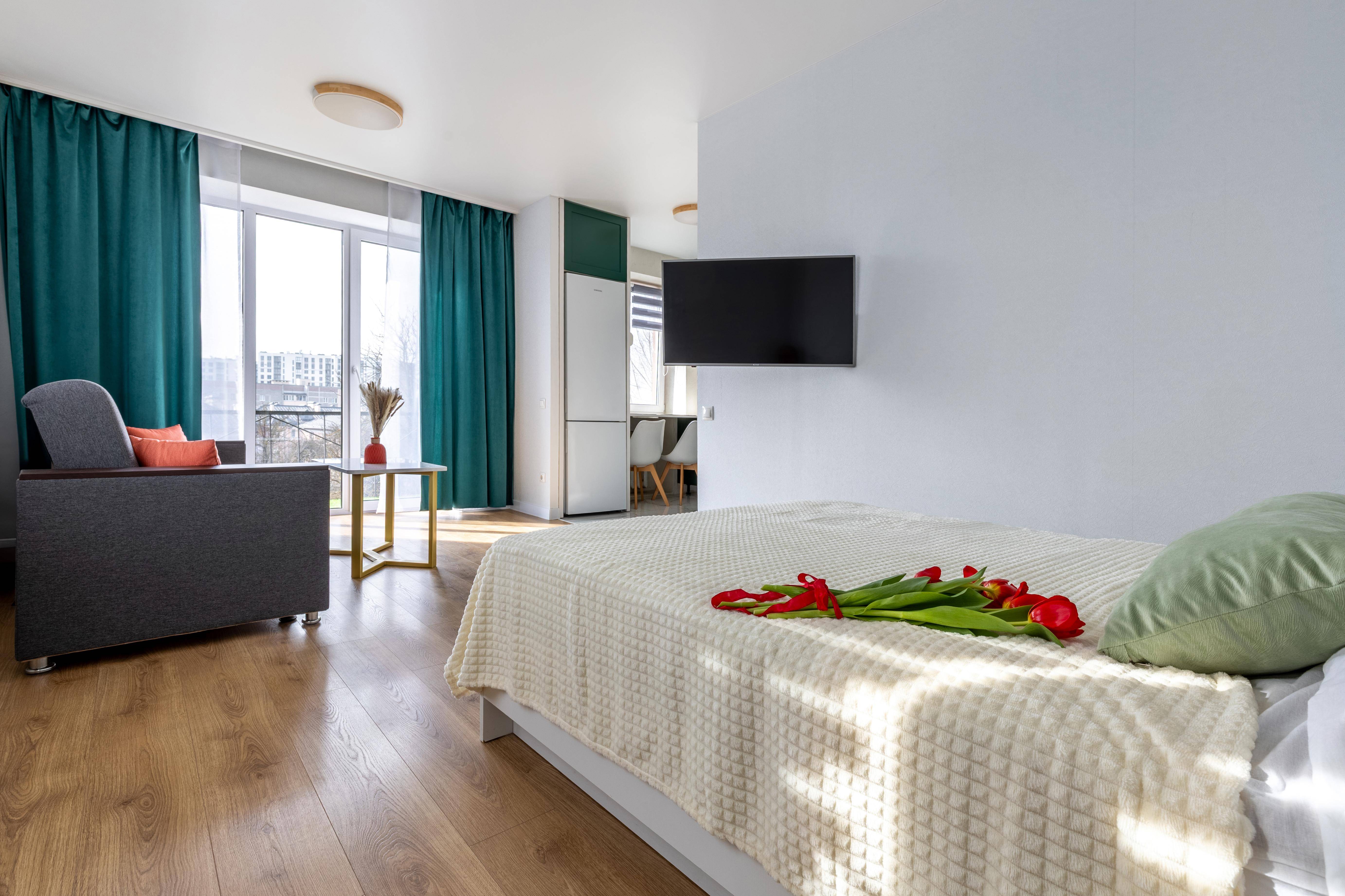 В стоимость входят: постельное белье, полотенца, чай, кофе, сахар, вся необходимая бытовая техника (чайник, микроволновая печь, утюг, фен, бойлер), посуда, ТВ, WI-FI, двуспальная кровать с ортопедическим матрасом и двуспальный диван. В пятницу и субботу, праздничные и выходные дни, а также в дни с высоким спросом (весенне-летний период, большие выходные, праздники), цена договорная и обсуждается дополнительно.
