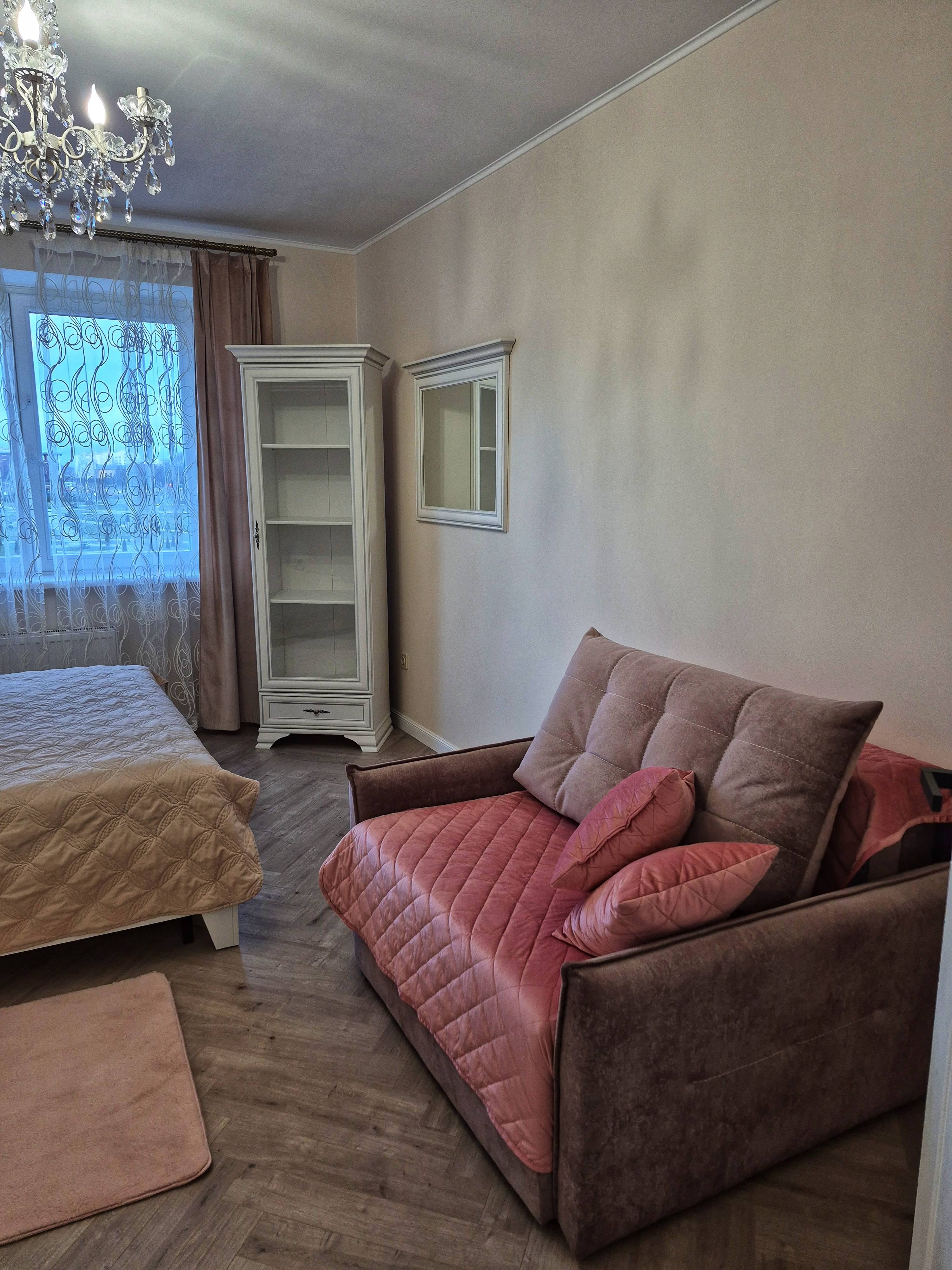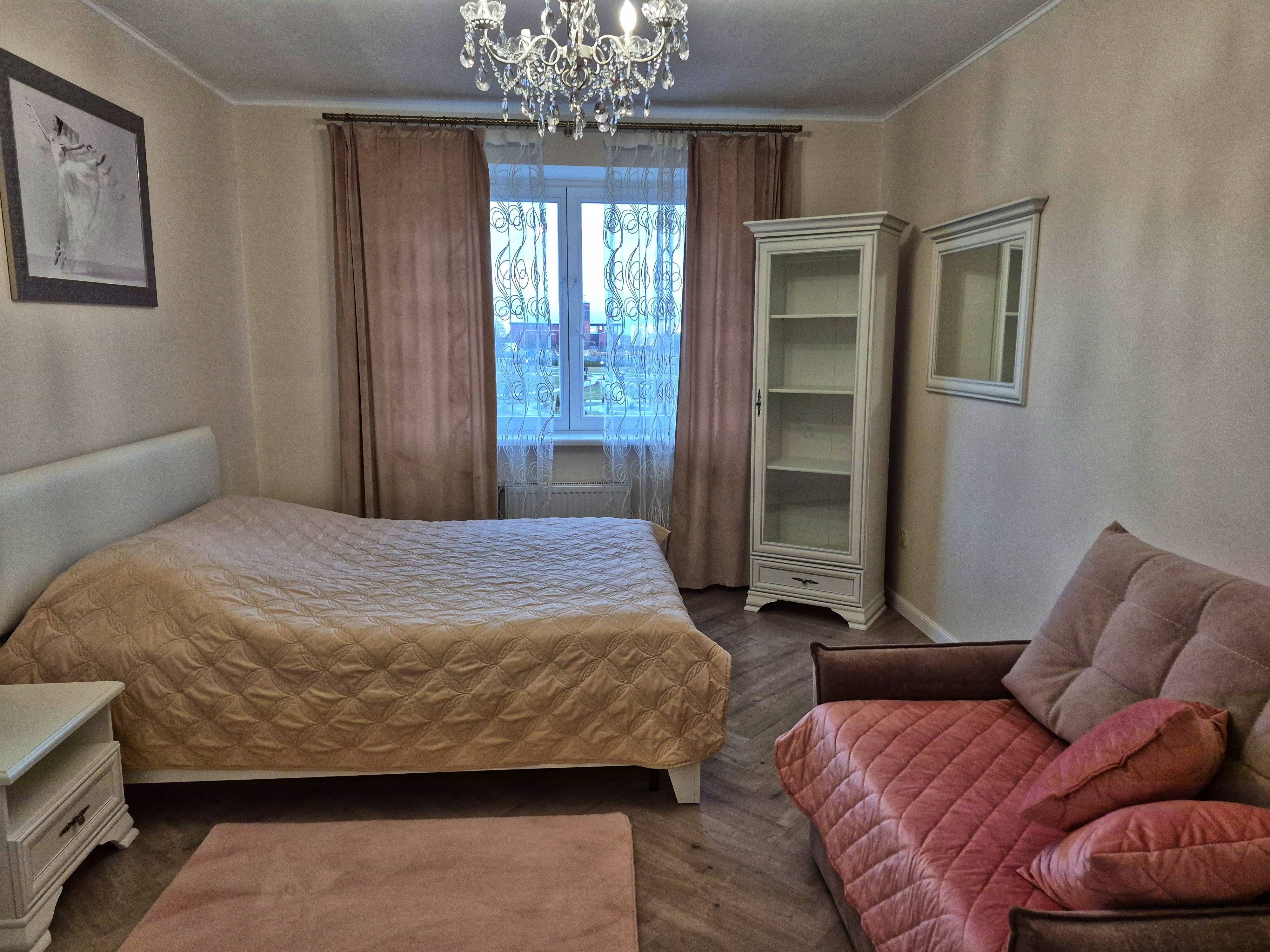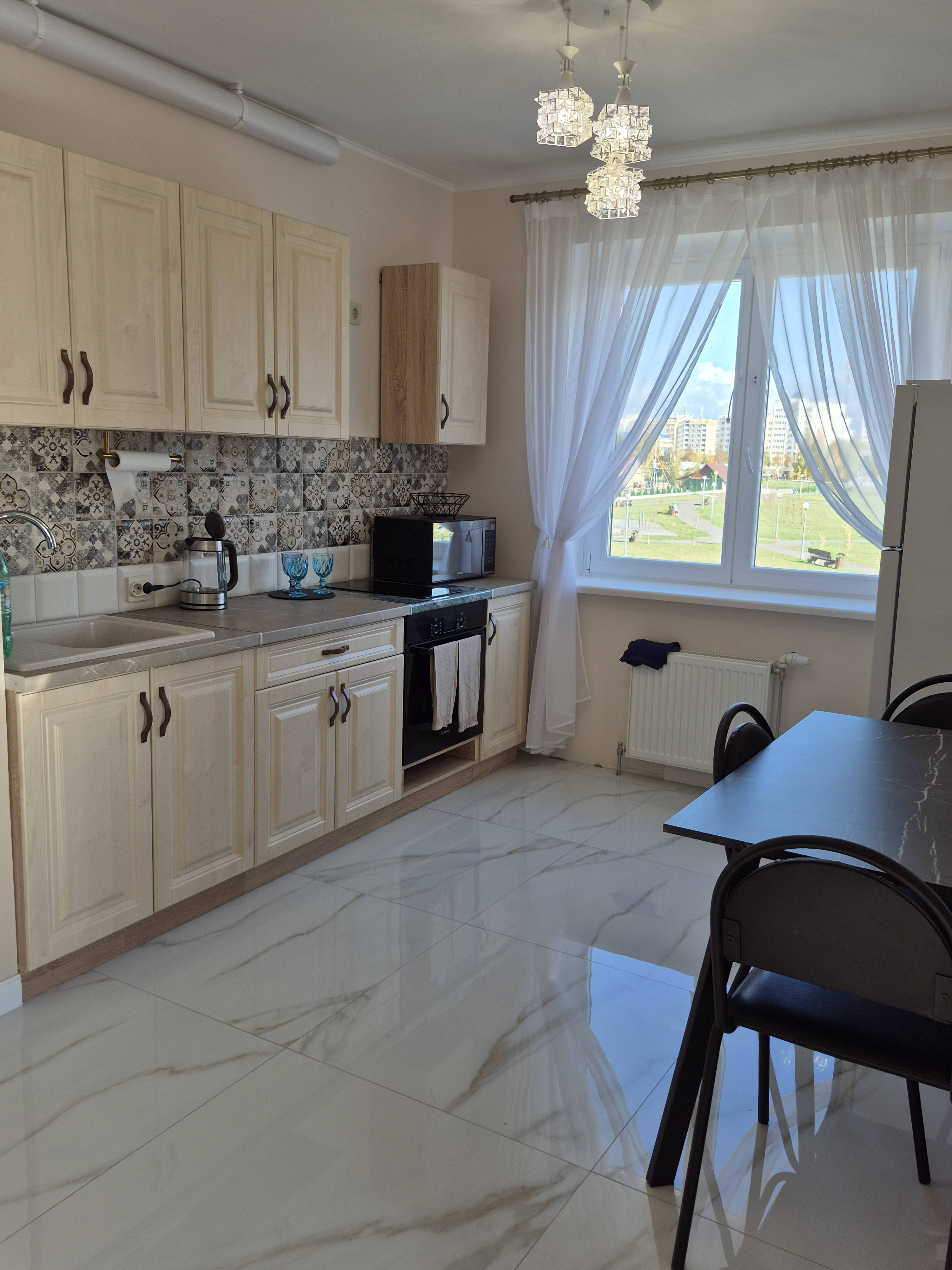Всё для комфортного проживания: СВЧ, холодильник электрический чайник, кофе, чай, комплект посуды, варочная панель, посуда, фен, утюг, гладильная доска, полотенца, комплект постельного белья. Новая мебель. Огромная автостоянка, парковочные места есть в любое время суток.