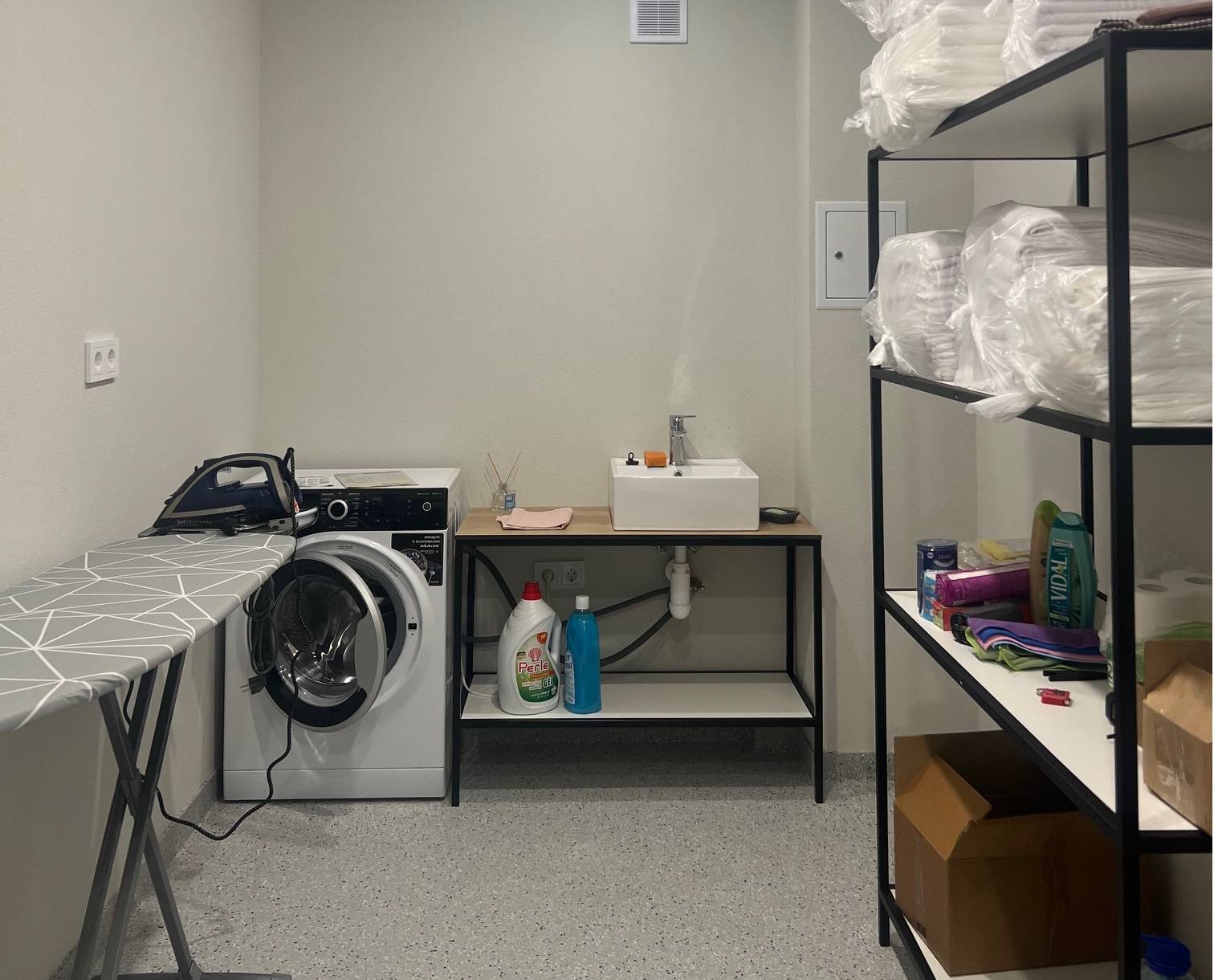 Прачечная: стиральная машина, сушка, утюг.