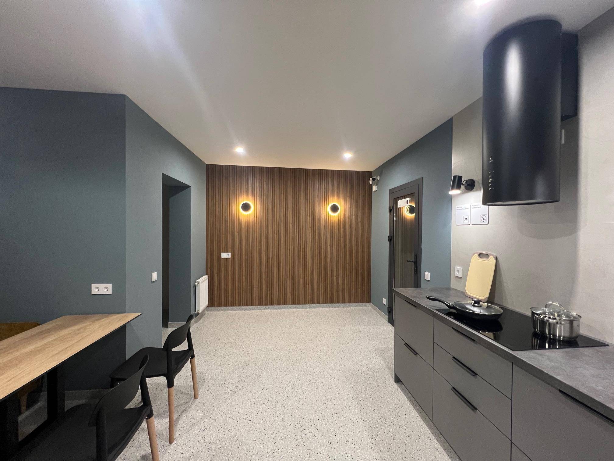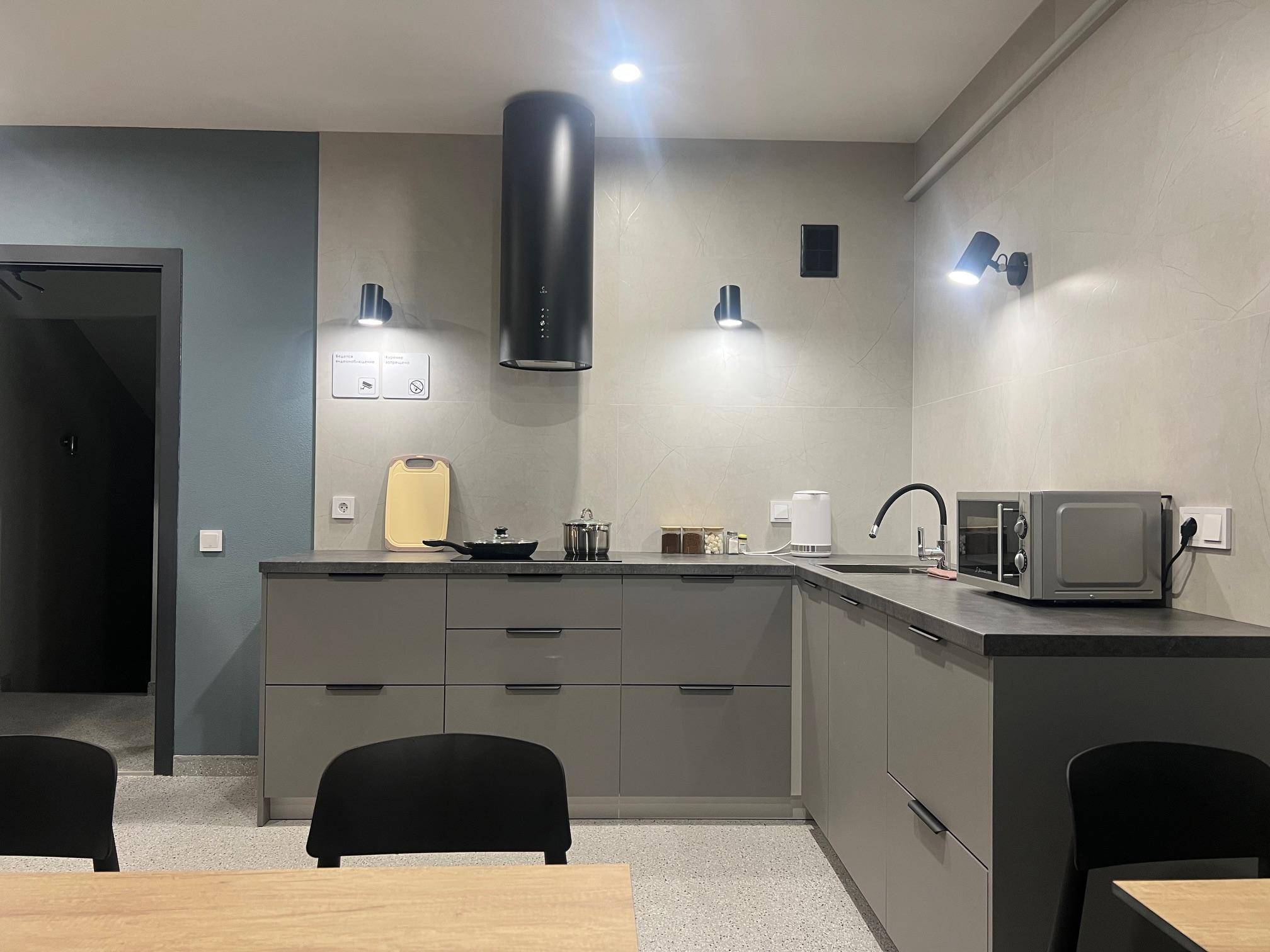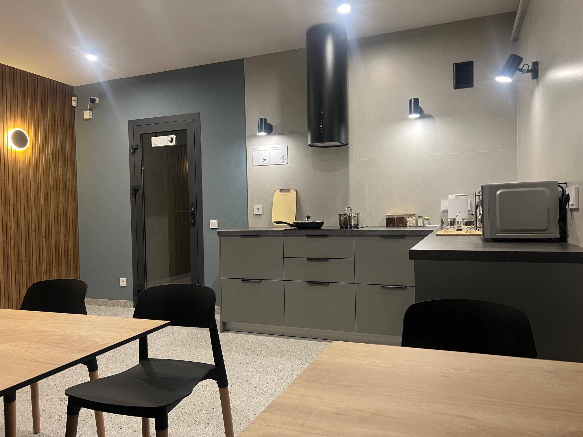 Кухня-столовая: индукционная плита, микроволновка, посудомоечная машина, обеденная зона.