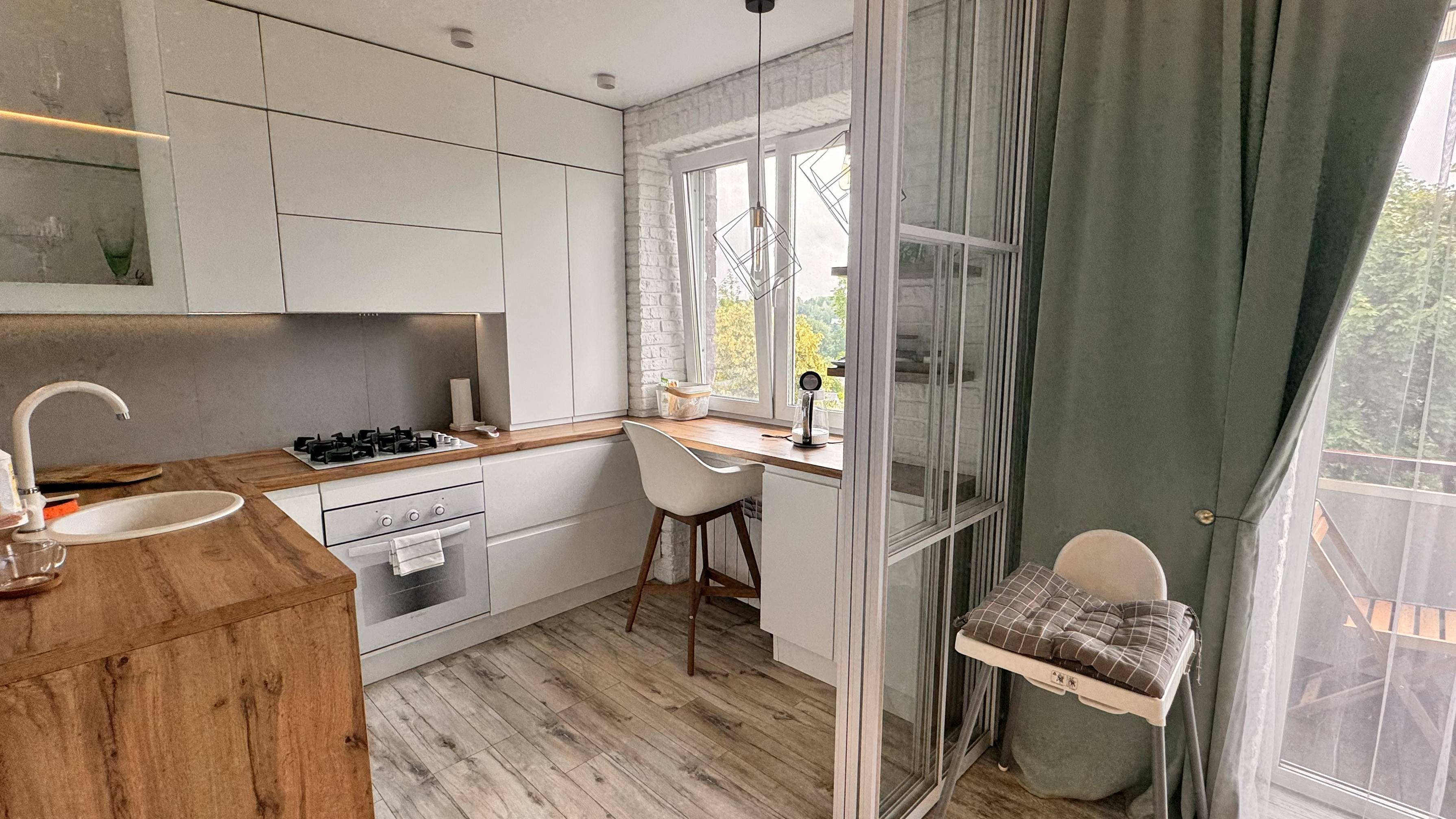 Полностью оборудованная кухня: духовой шкаф, газовая варочная панель, посудомоечная машина, микроволновка