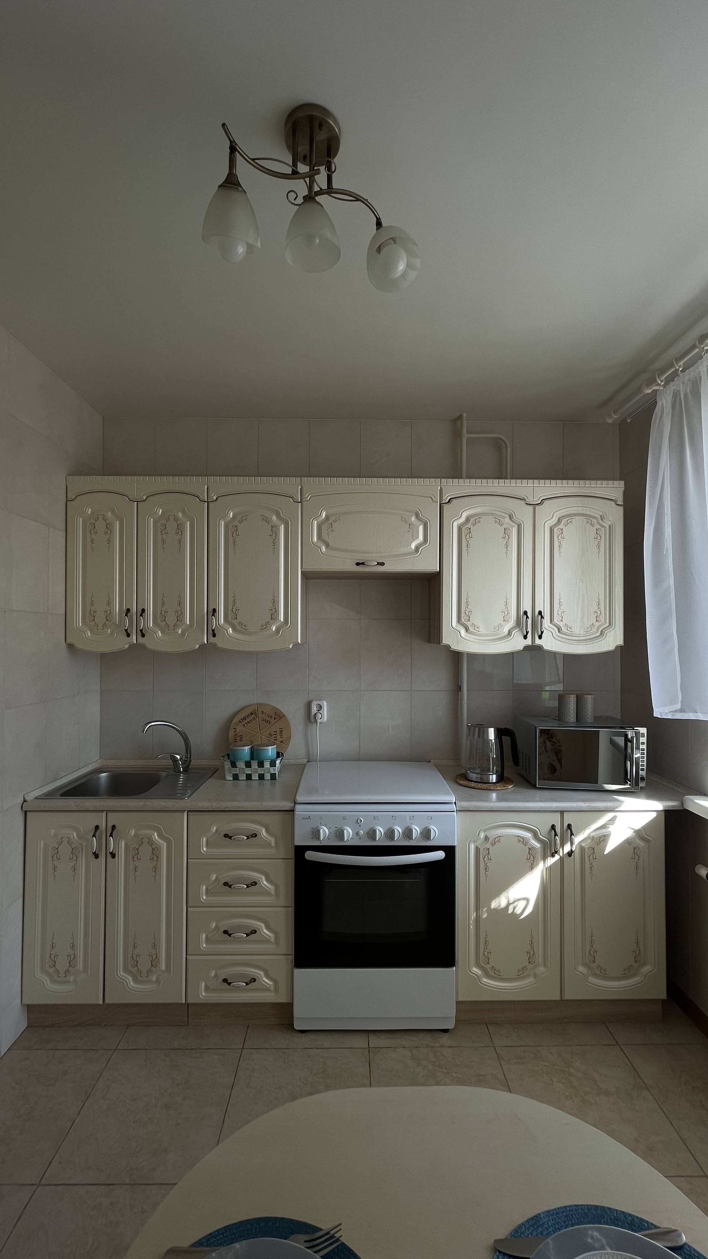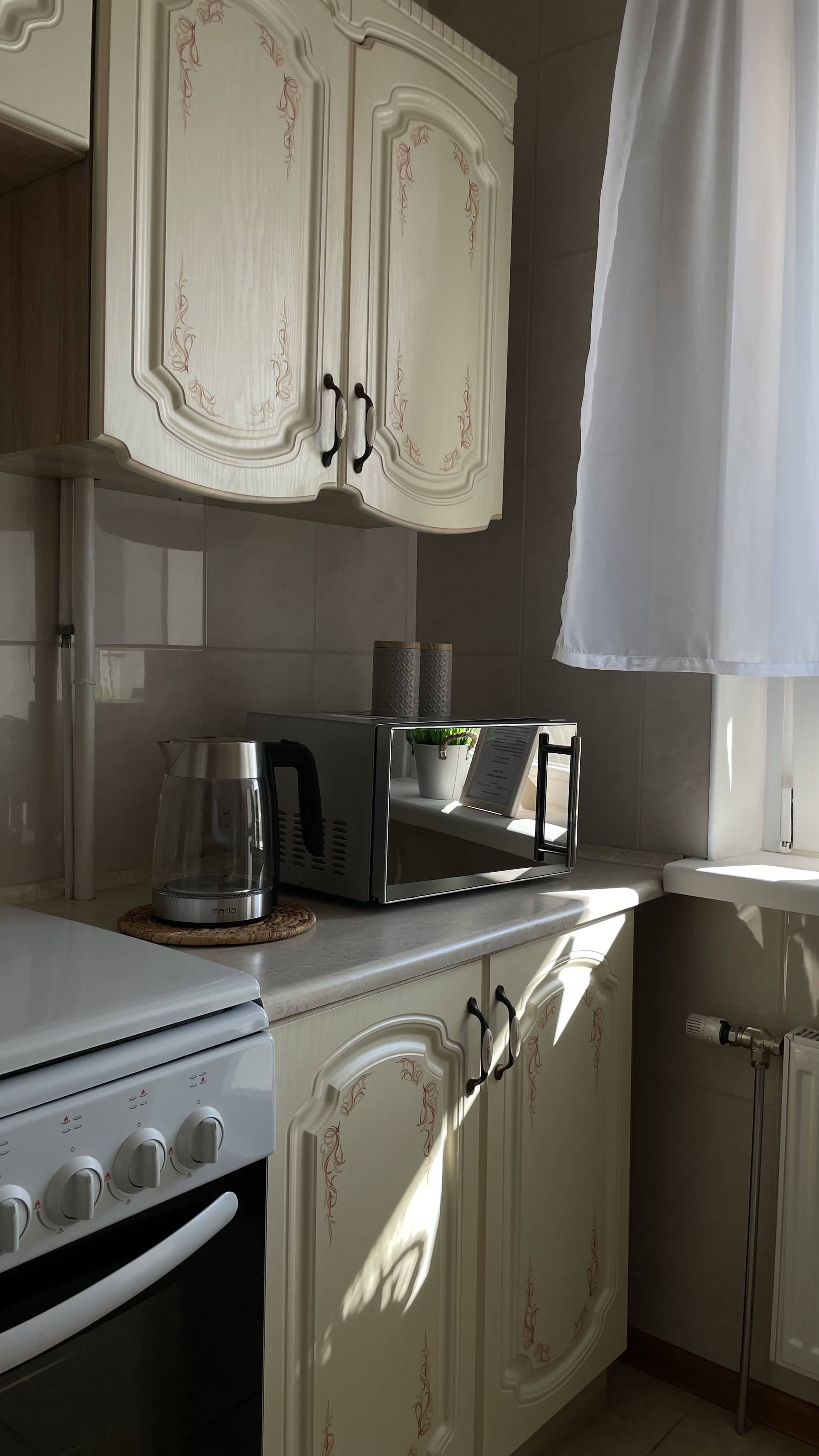 Кухня оборудована: газовая плита, холодильник, свч-печь, электрический чайник, посуда для приготовления и сервировки. В наличии чай, кофе, сахар, соль.