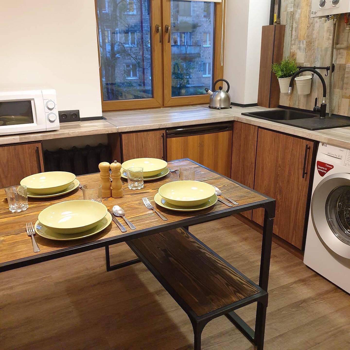 Кухня оборудована: газовая плита, холодильник, свч-печь, чайник, посуда для приготовления и сервировки. В наличии чай, кофе, сахар, соль.