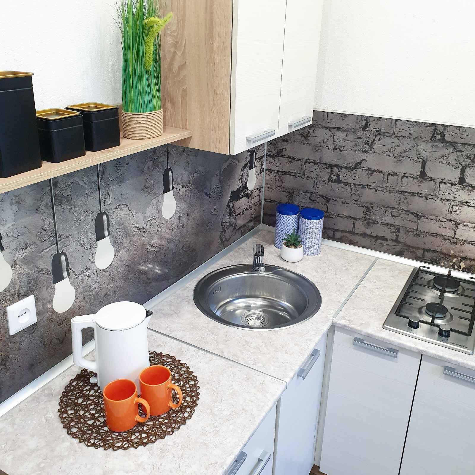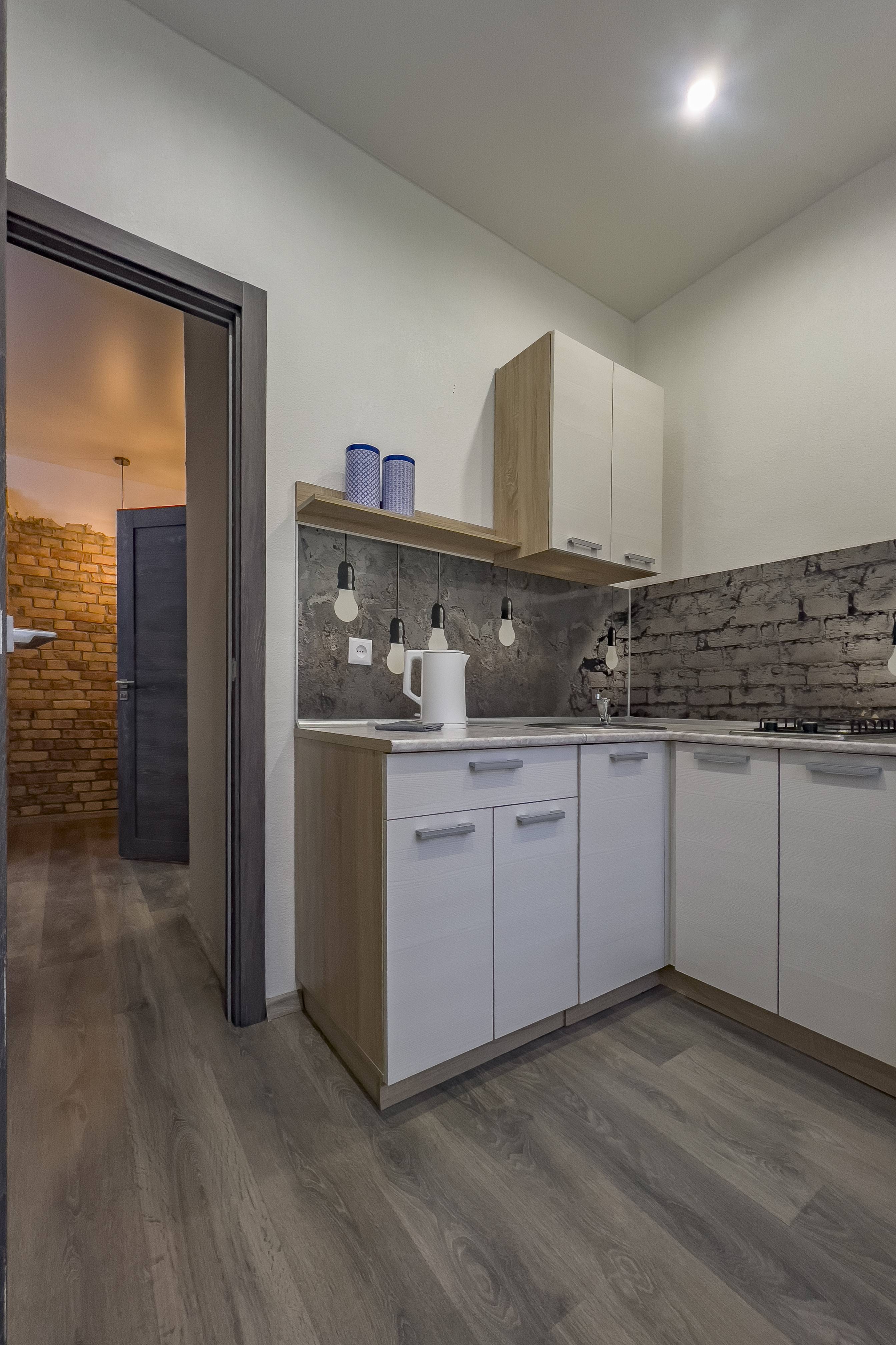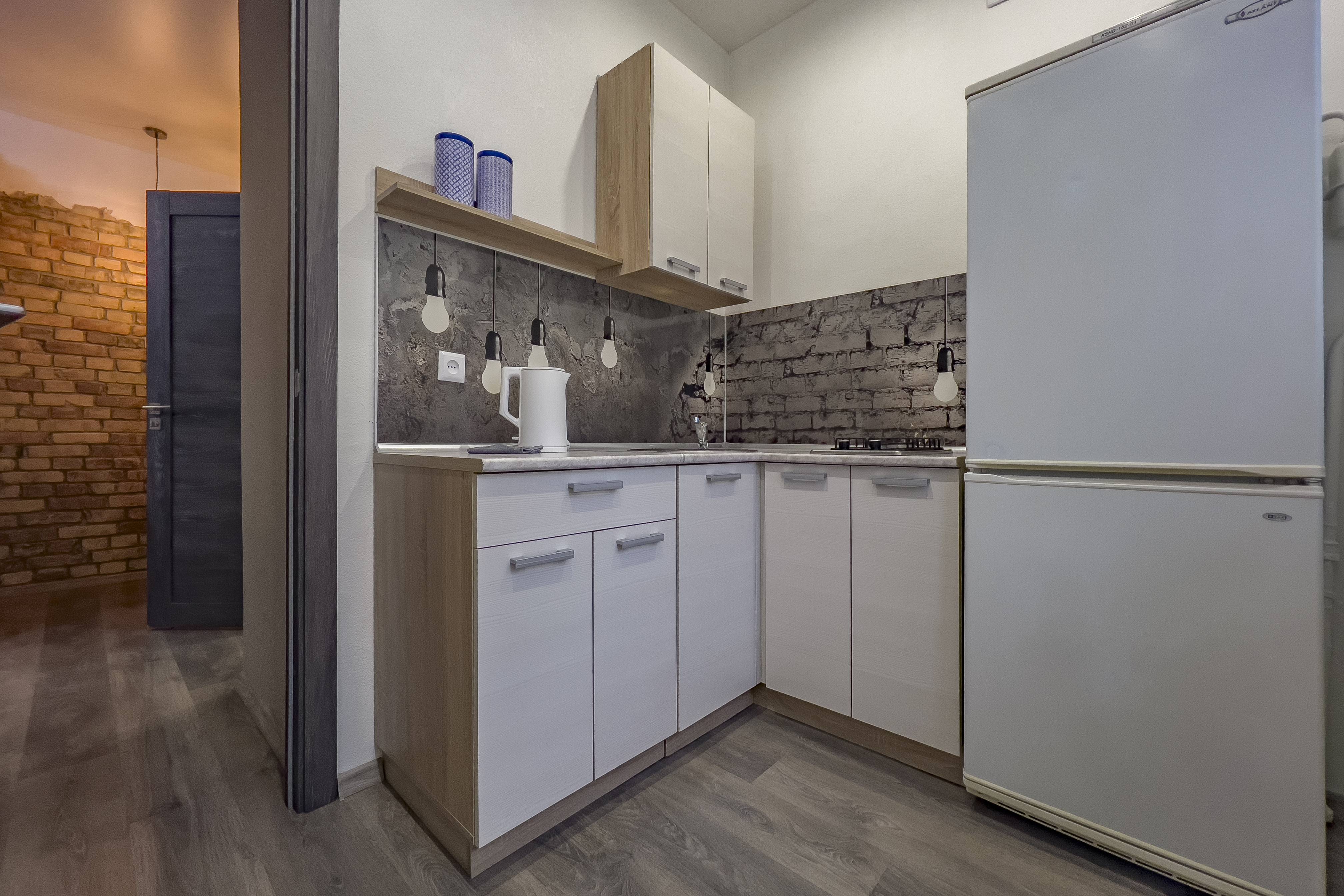 Кухня оборудована: газовая плита, холодильник, свч-печь, электрический чайник, посуда для приготовления и сервировки. В наличии чай, кофе, сахар, соль.