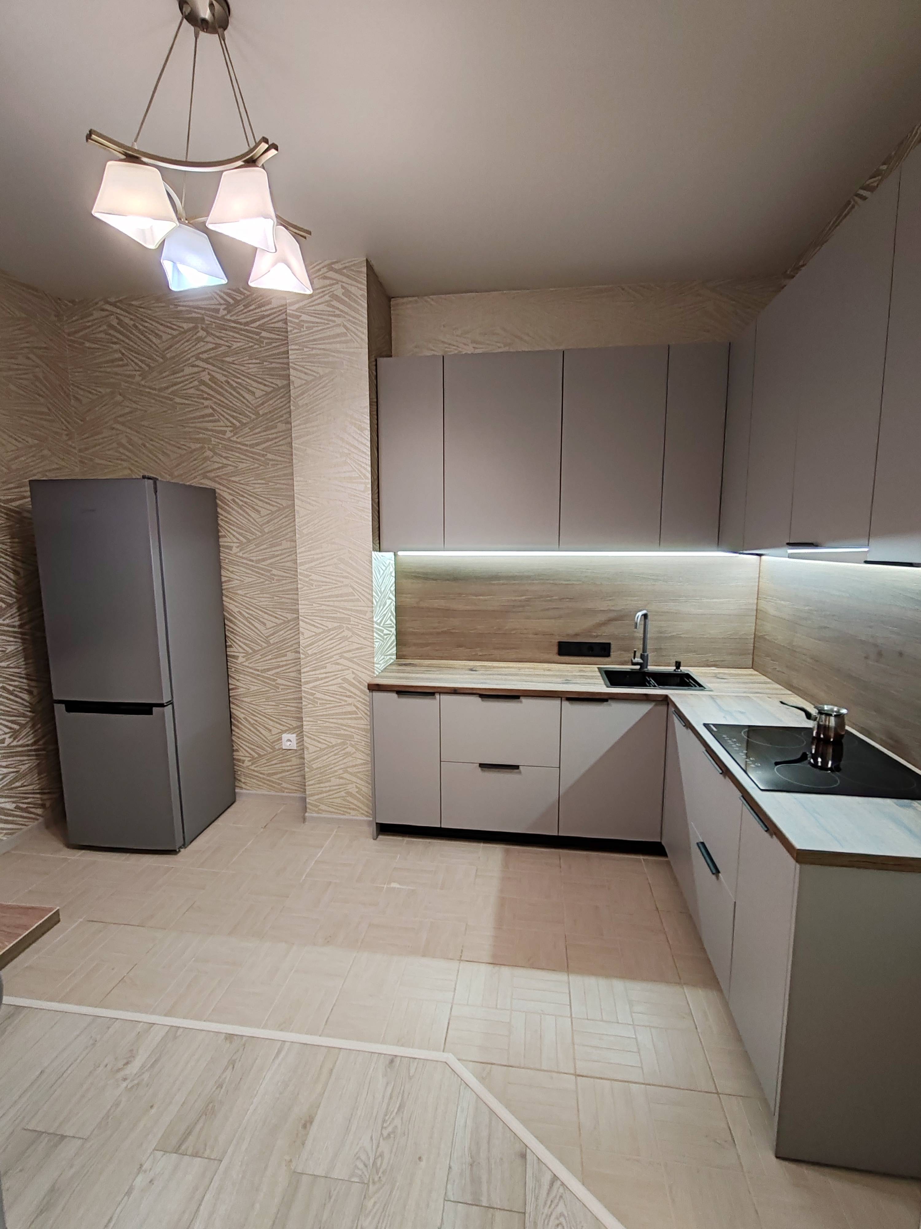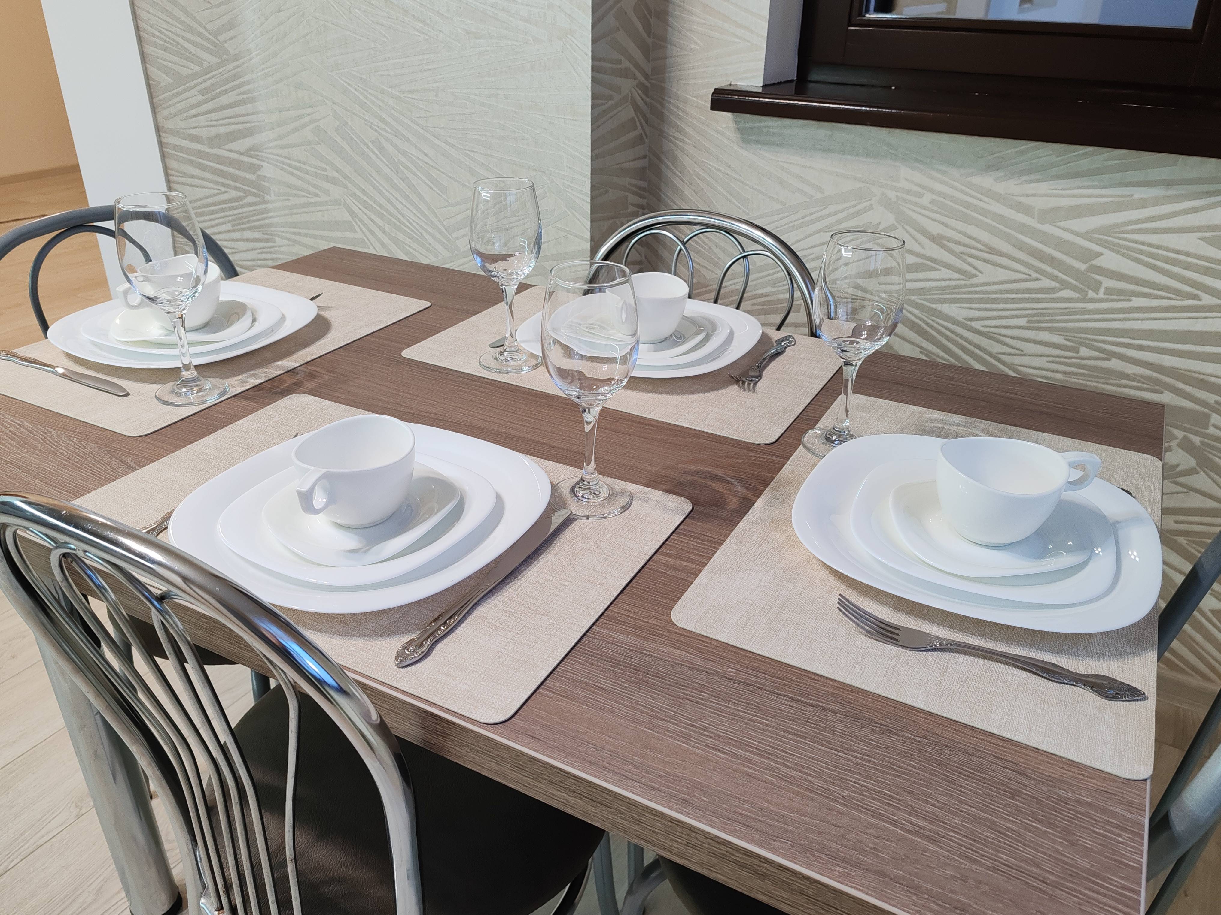 Кухня полностью оборудована всем необходимым: холодильник, СВЧ-печь, посудомоечная машина, электроплита, электрочайник, вся необходимая посуда.