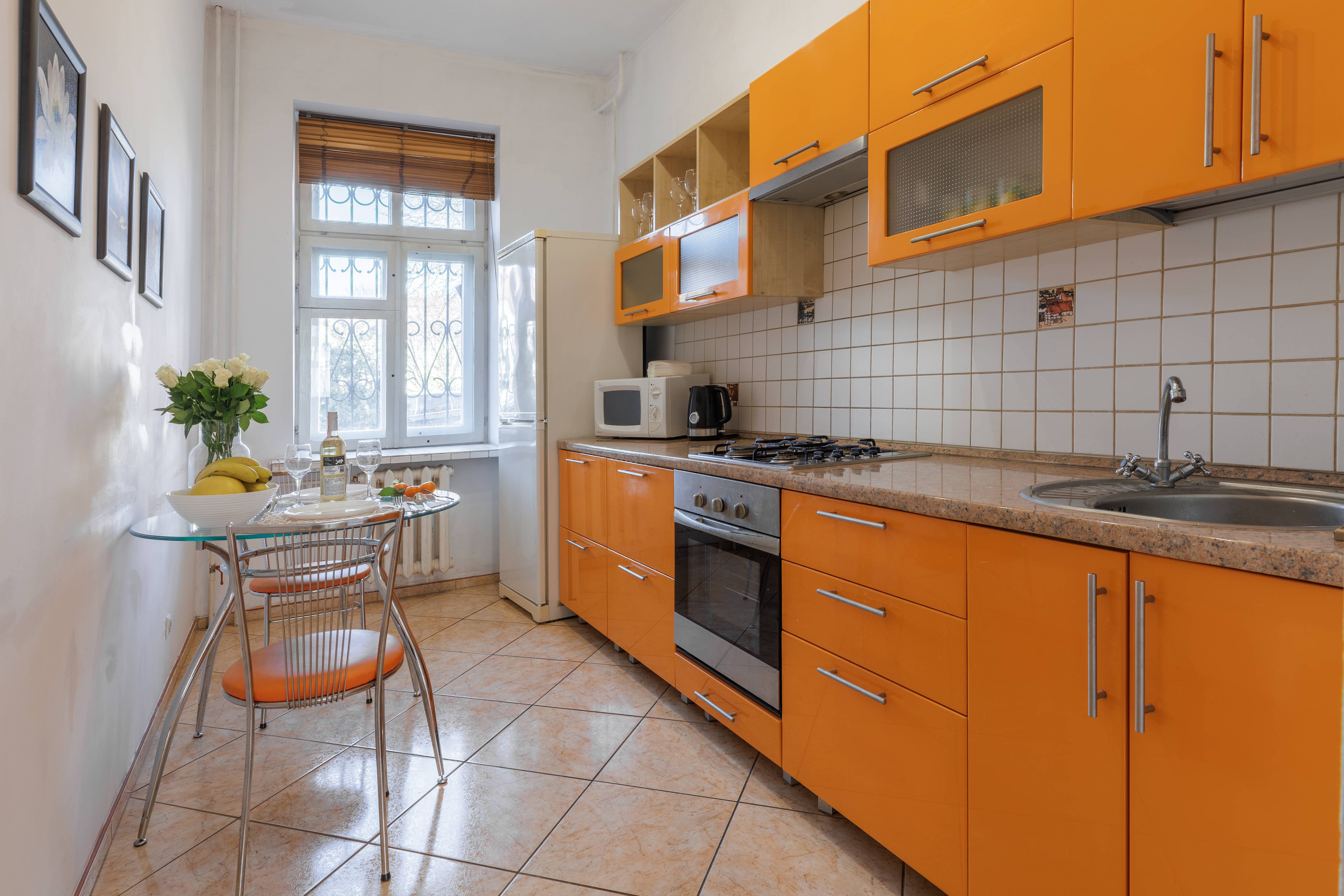 На кухне плита, микроволновая печь, эл. чайник, духовой шкаф, посуда для приготовления и сервировки, холодильник.