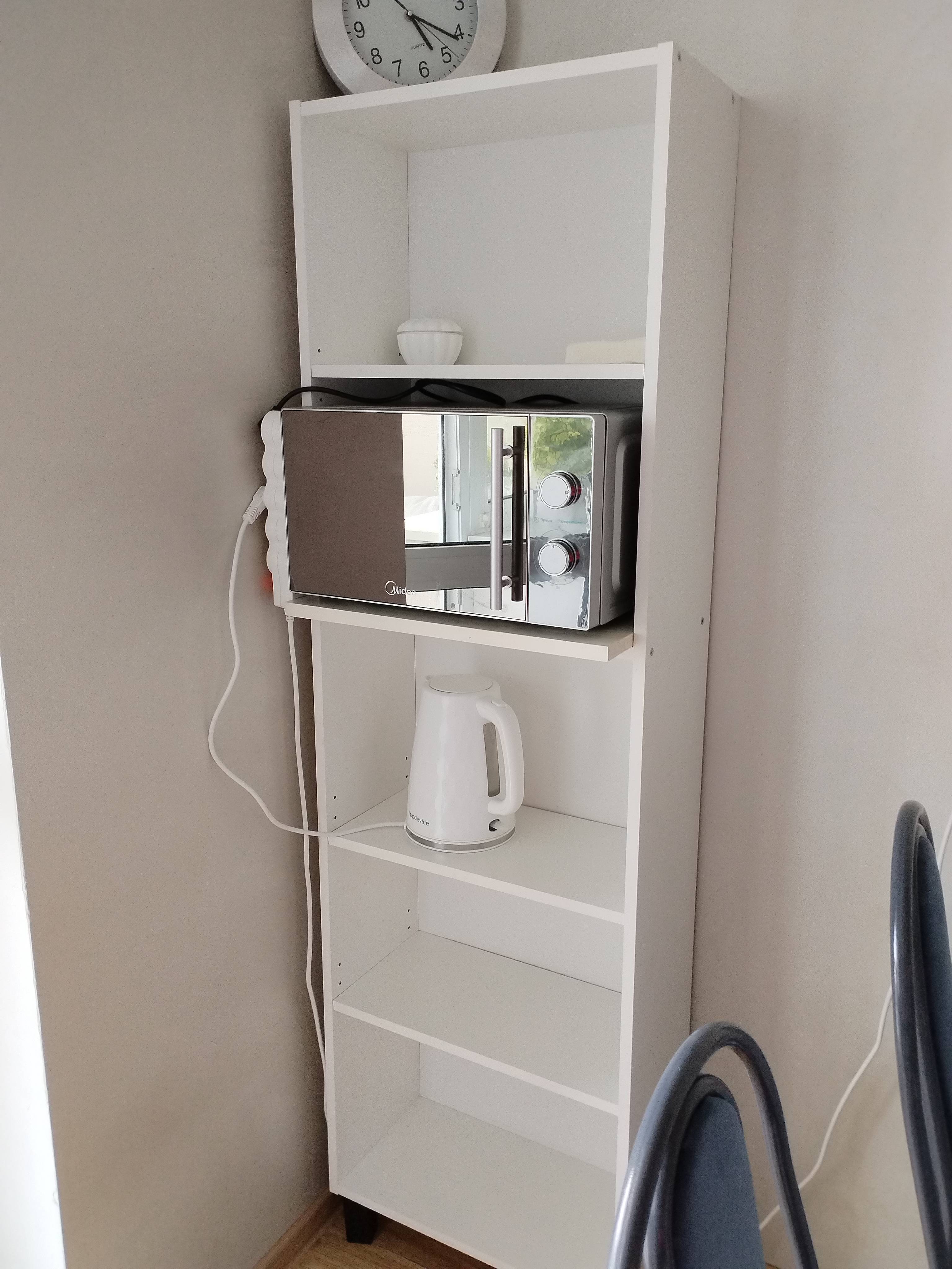 Вся необходимая бытовая техника, кухонная посуда и сковорода, кастрюли, чайник.