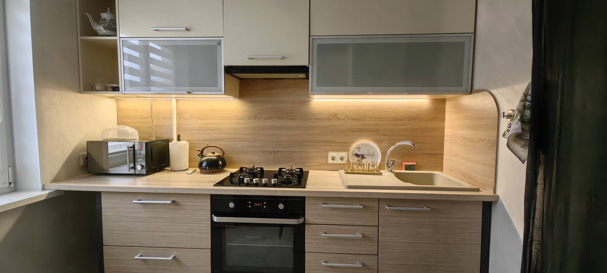 - Просторная кухня с новой мебелью и техникой (плита, холодильник, микроволновка, посуда).