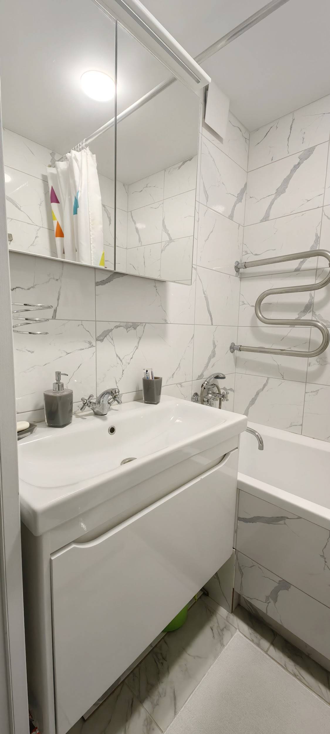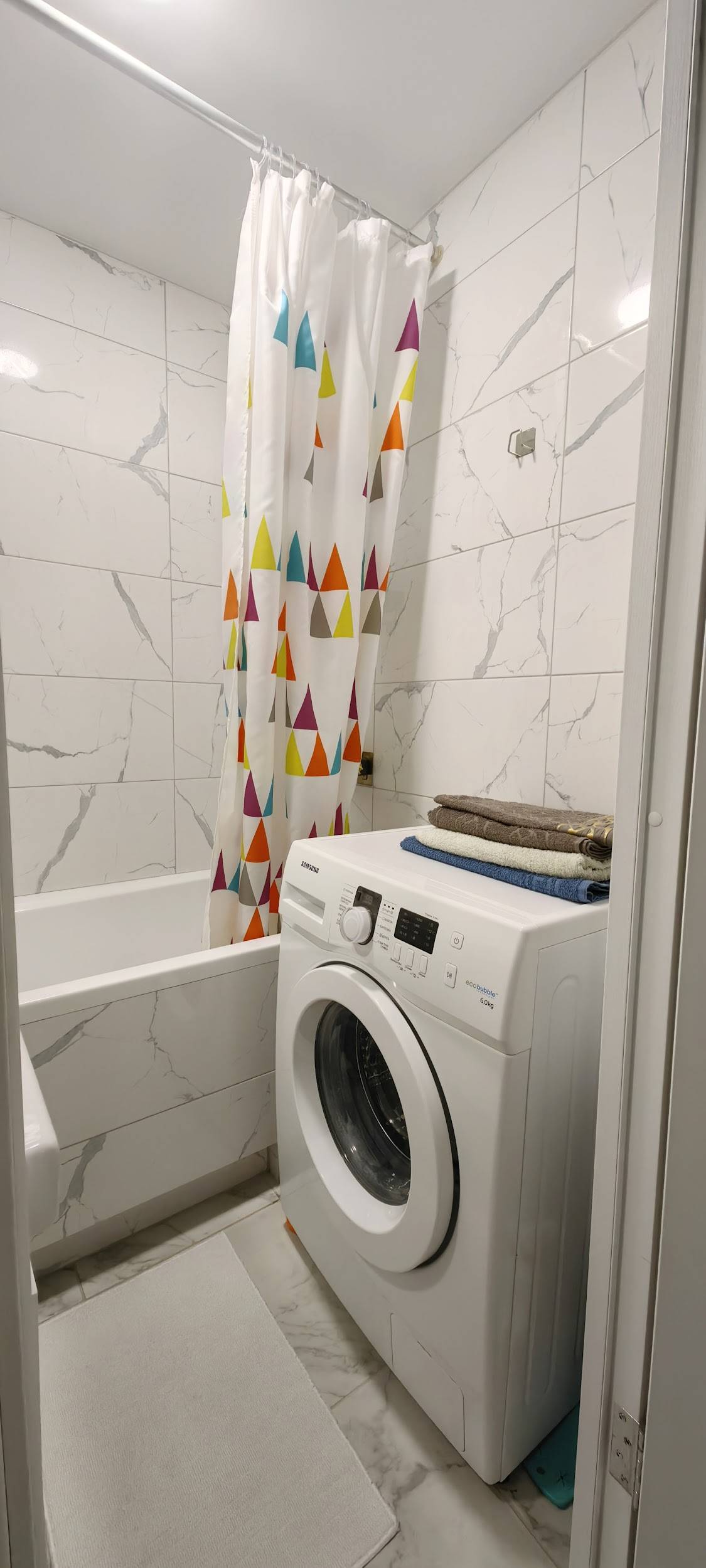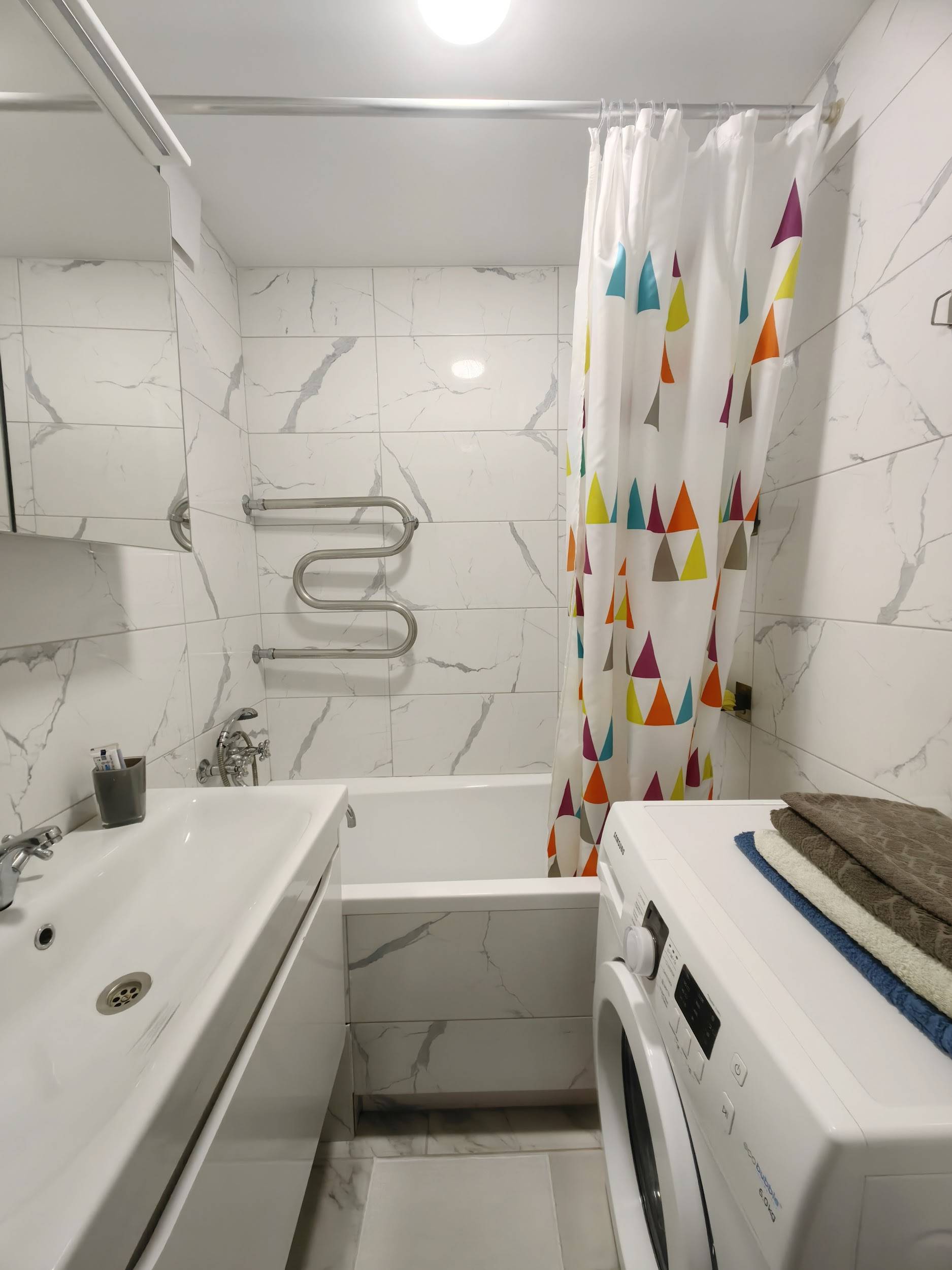 Уютная ванная комната с современной сантехникой и стиральной машиной. В квартире есть утюг, гладильная доска, фен.