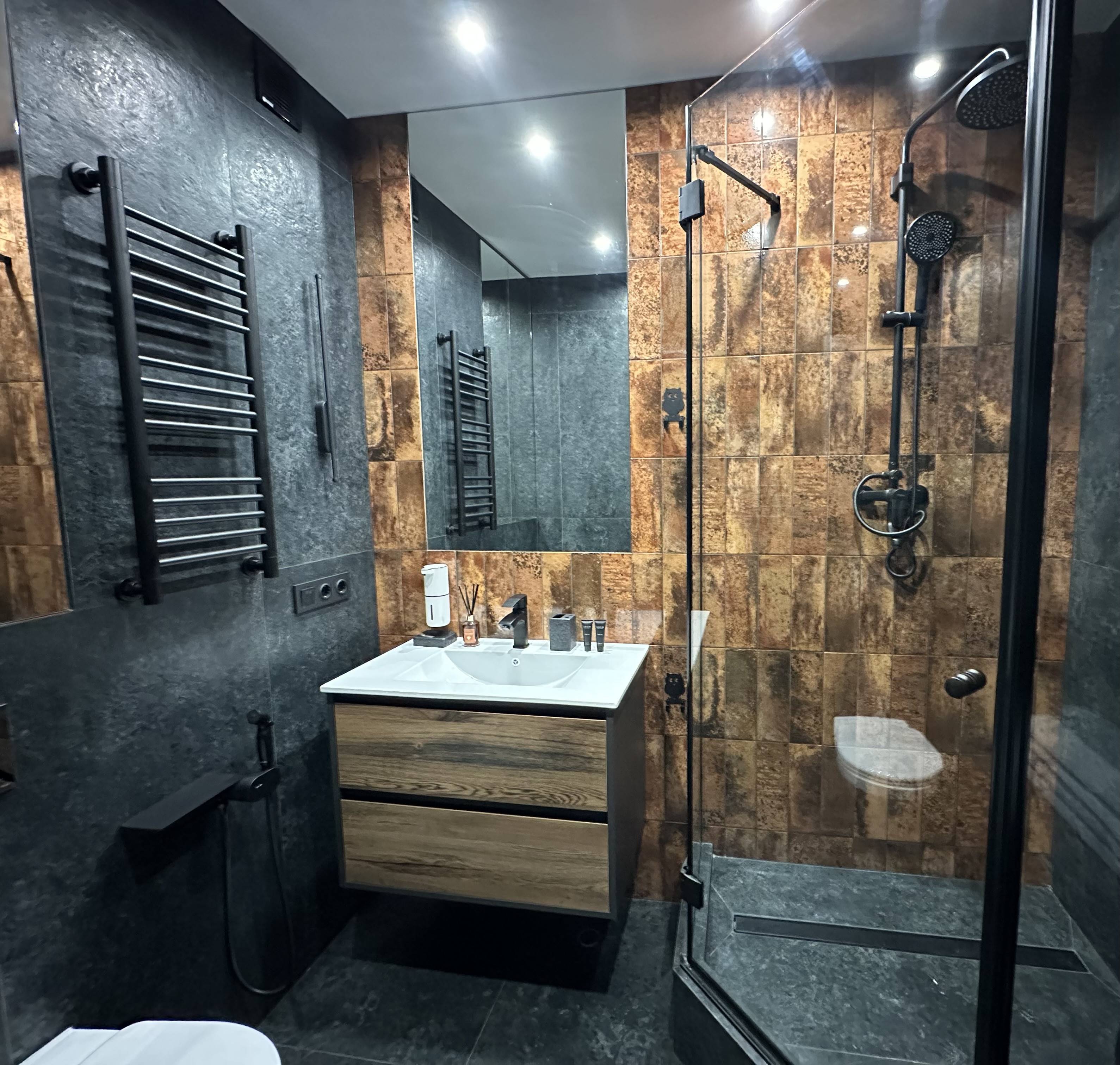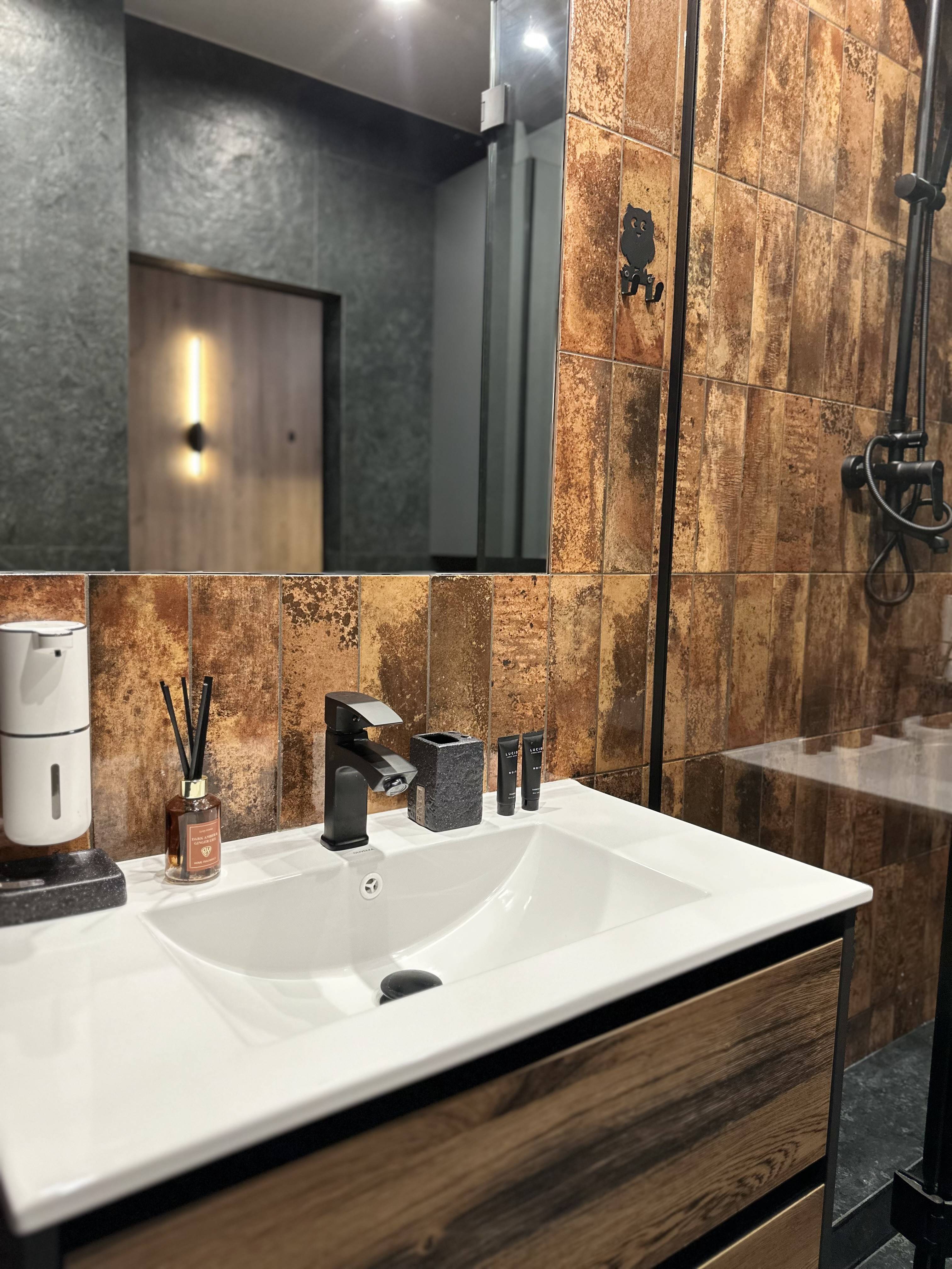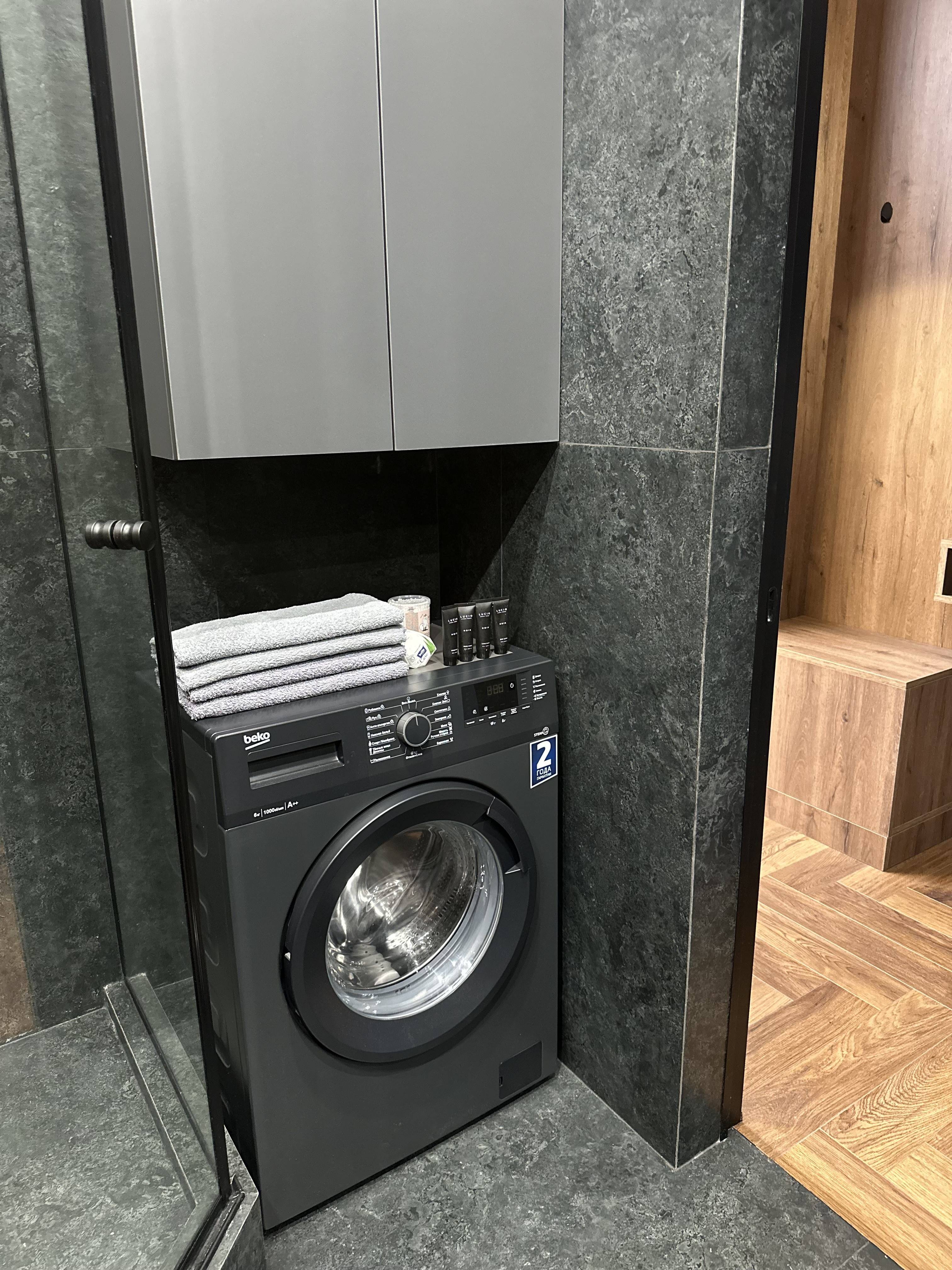 Просторная ванная комната (комплект полотенец, шампунь, гель для душа, фен.)