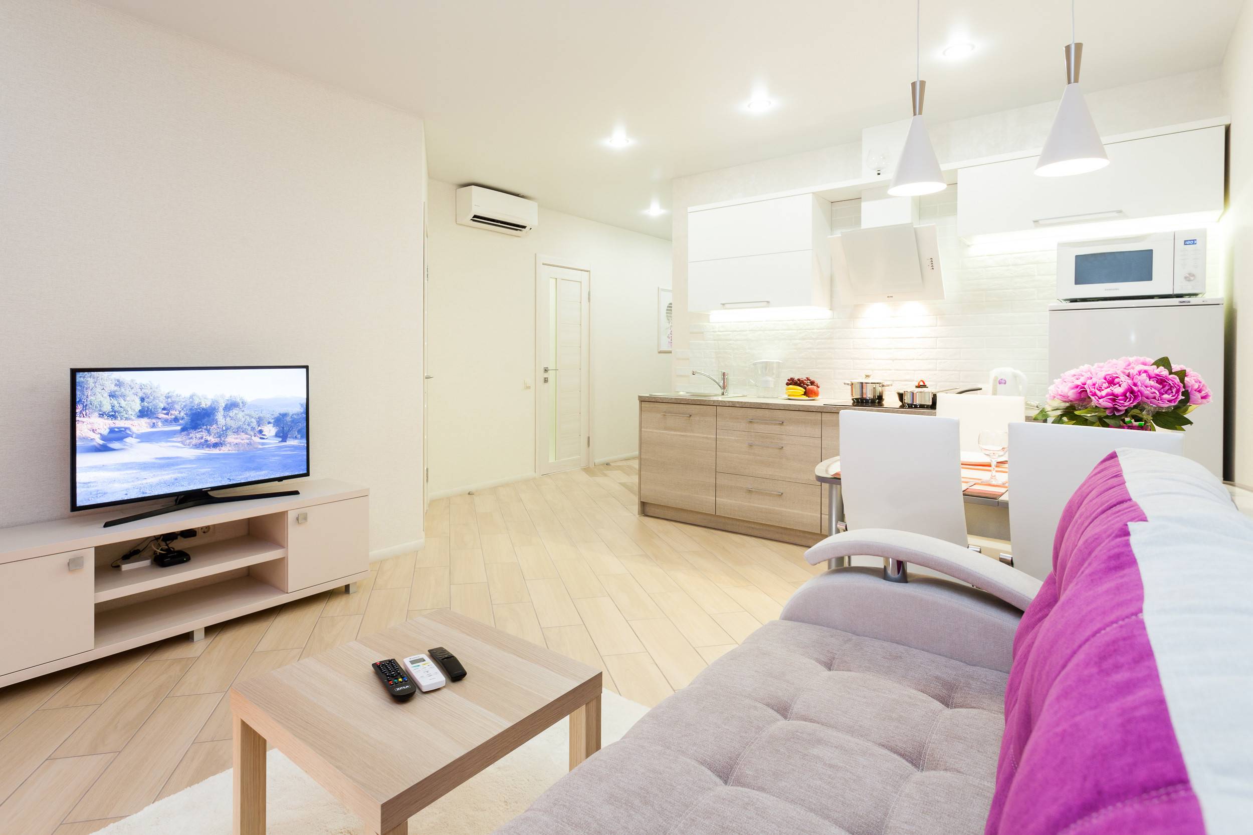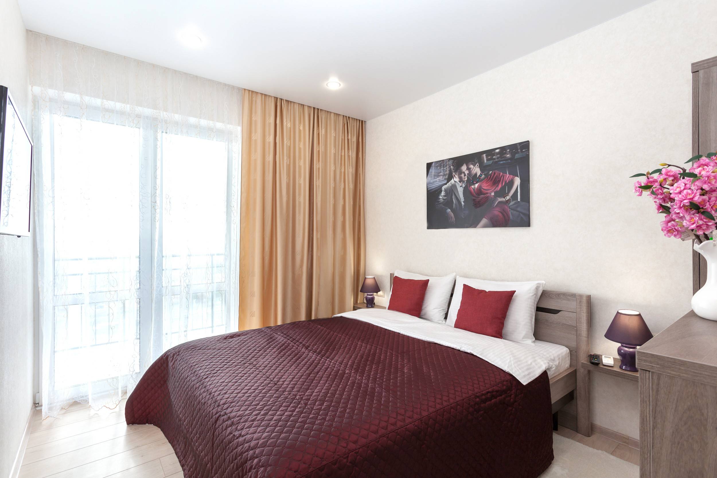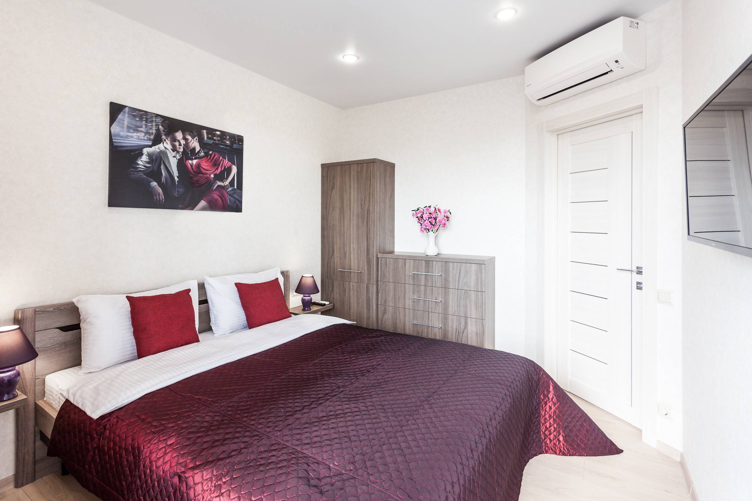 Апартаменты находятся в центре города в новостройке. В апартаментах выполнен современный ремонт в соответствии с последними модными тенденциями. К Вашим услугам предоставляется уютная гостиная с мягкой мебелью и ЖК-телевизором, объединенная с функциональной кухней. Имеется 2 кондиционера, вся необходимая мебель, микроволновка, холодильник, электрочайник, посуда для приготовления пищи. Светлая спальня с большой кроватью и телевизором подарит Вам тепло и уют домашнего очага. Для Вашего комфорта мы предусмотрели наличие некоторых приятных мелочей: безлимитный интернет Wi-Fi, бойлер, средства личной гигиены, полотенца, фен, утюг, гладильная доска, кофе-чай и чистая питьевая вода. Вы будете очарованы атмосферой в этом доме: при входе Вас встретит консьерж, а с лоджии с витражным остеклением с высоты 22 этажа откроется прекрасный вид на ночной город.
