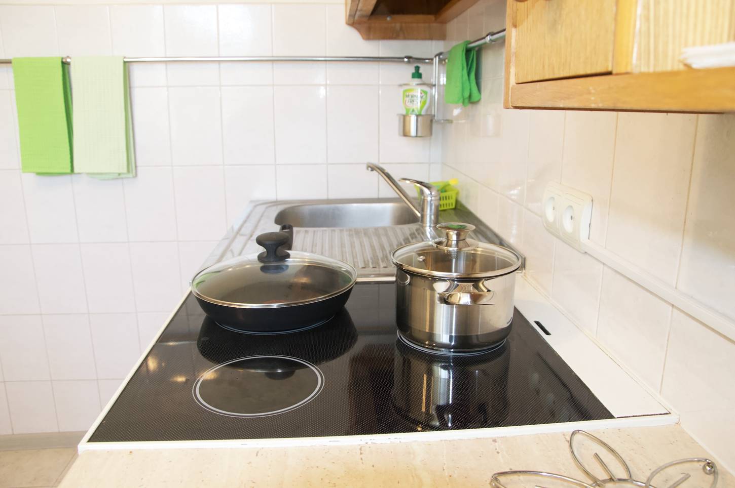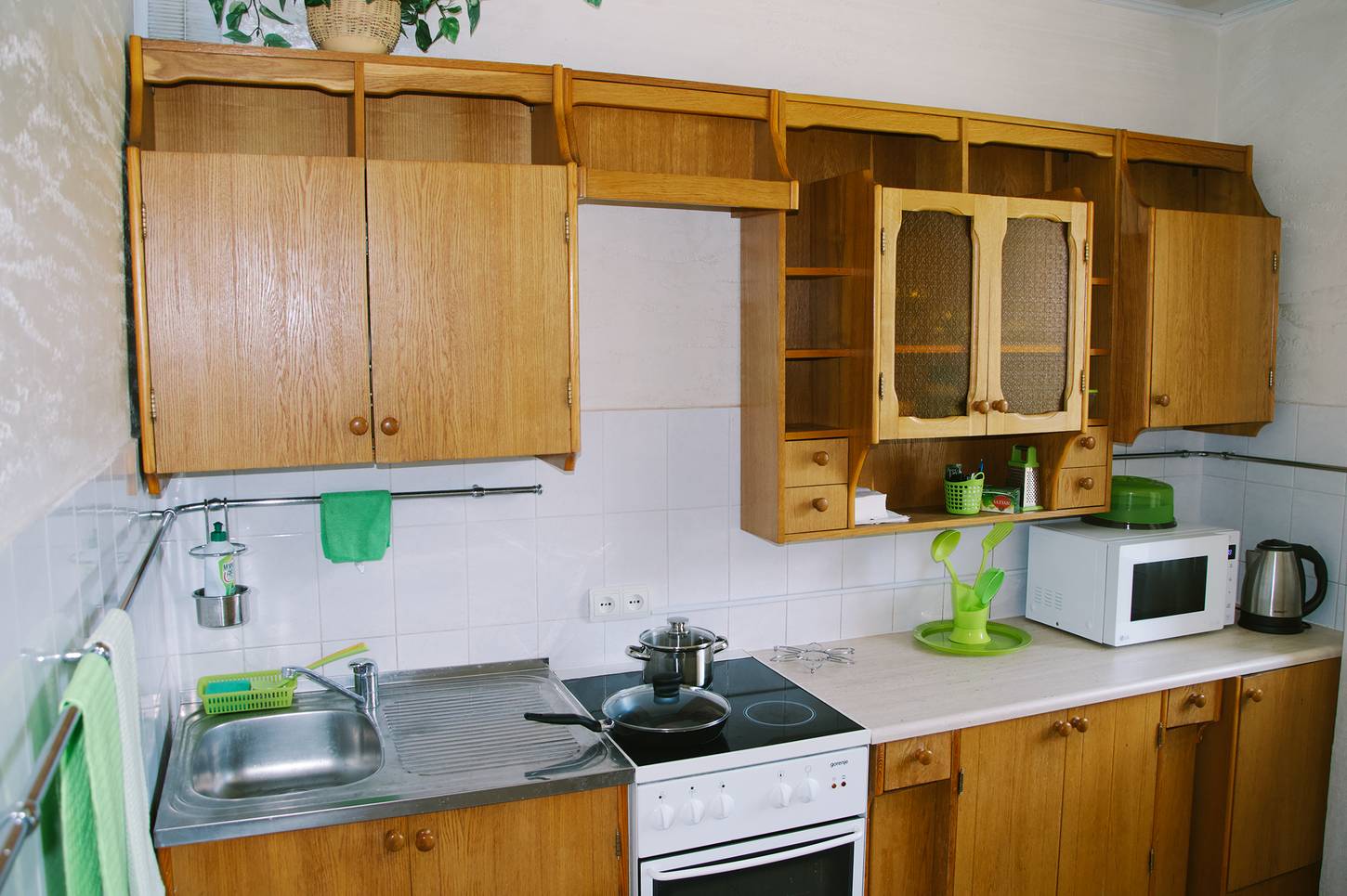 - кухонные принадлежности (гейзерная кофеварка, сковородки, кастрюли и многое другое), чай, кофе, соль и сахар, масло подсолнечное