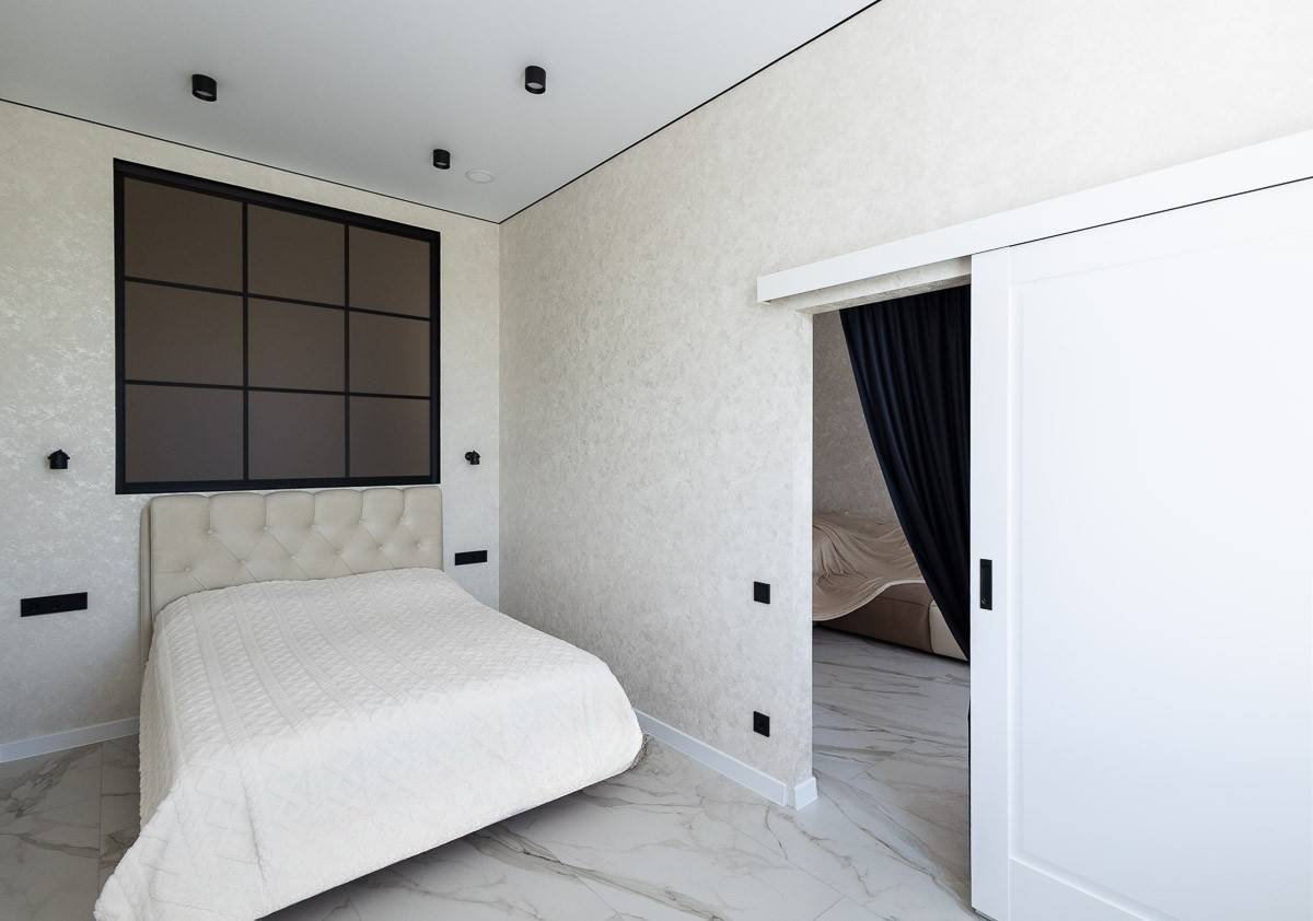 Комфортная спальня с двуспальной кроватью и гостиная с зоной отдыха.