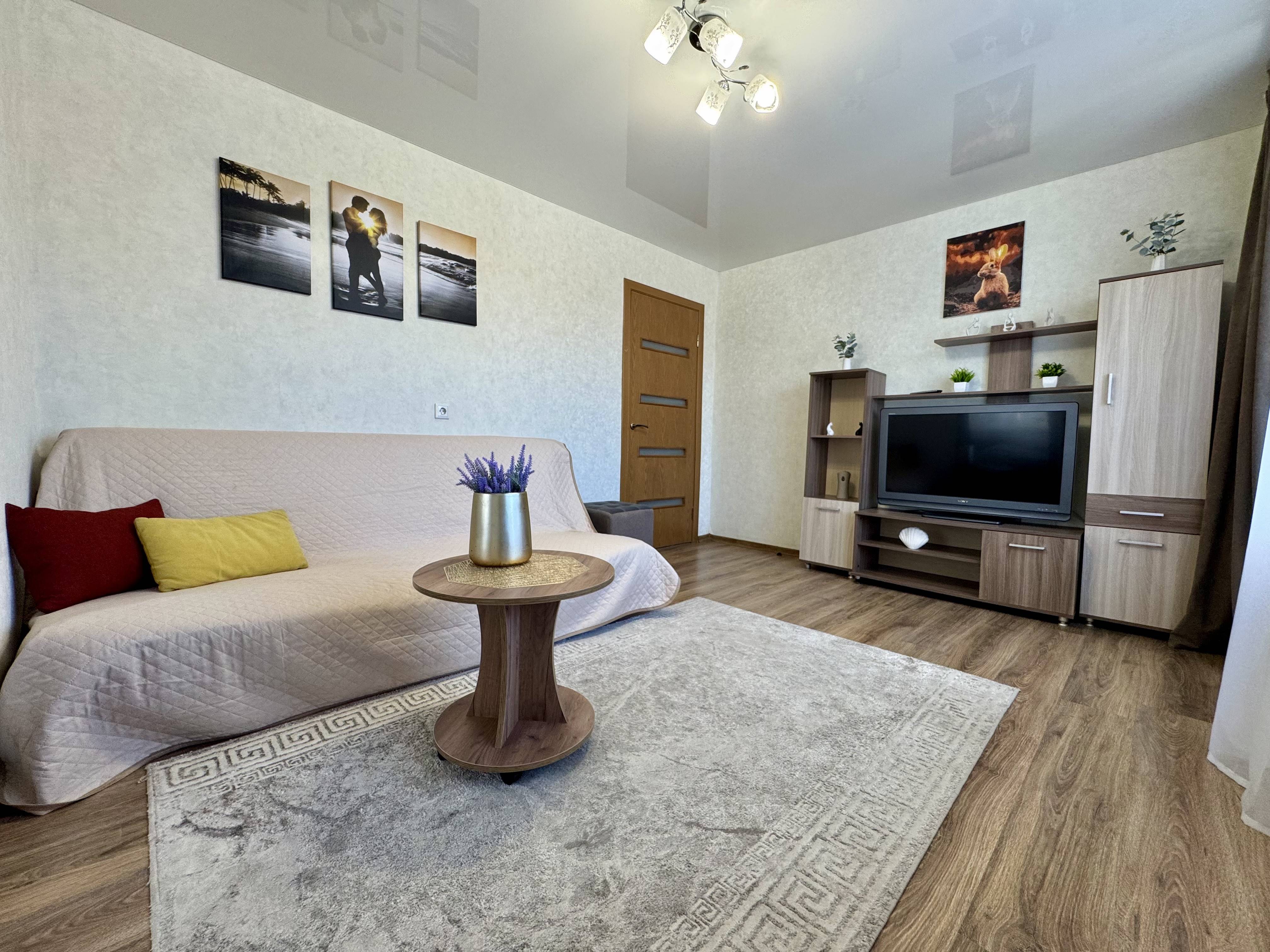 Гостиная: зона отдыха с диваном, который раскладывается в дополнительное спальное место, и большим телевизором.