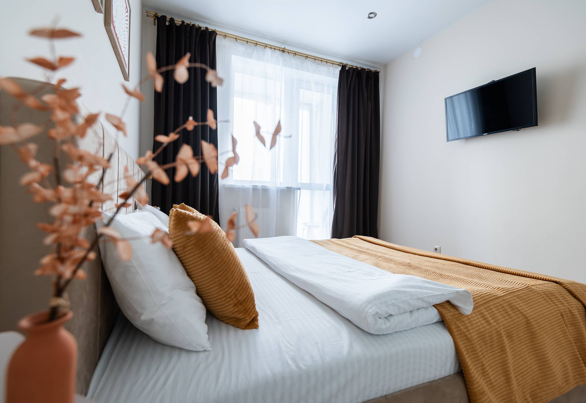 • удобная двуспальная кровать и диван с качественным постельным бельём