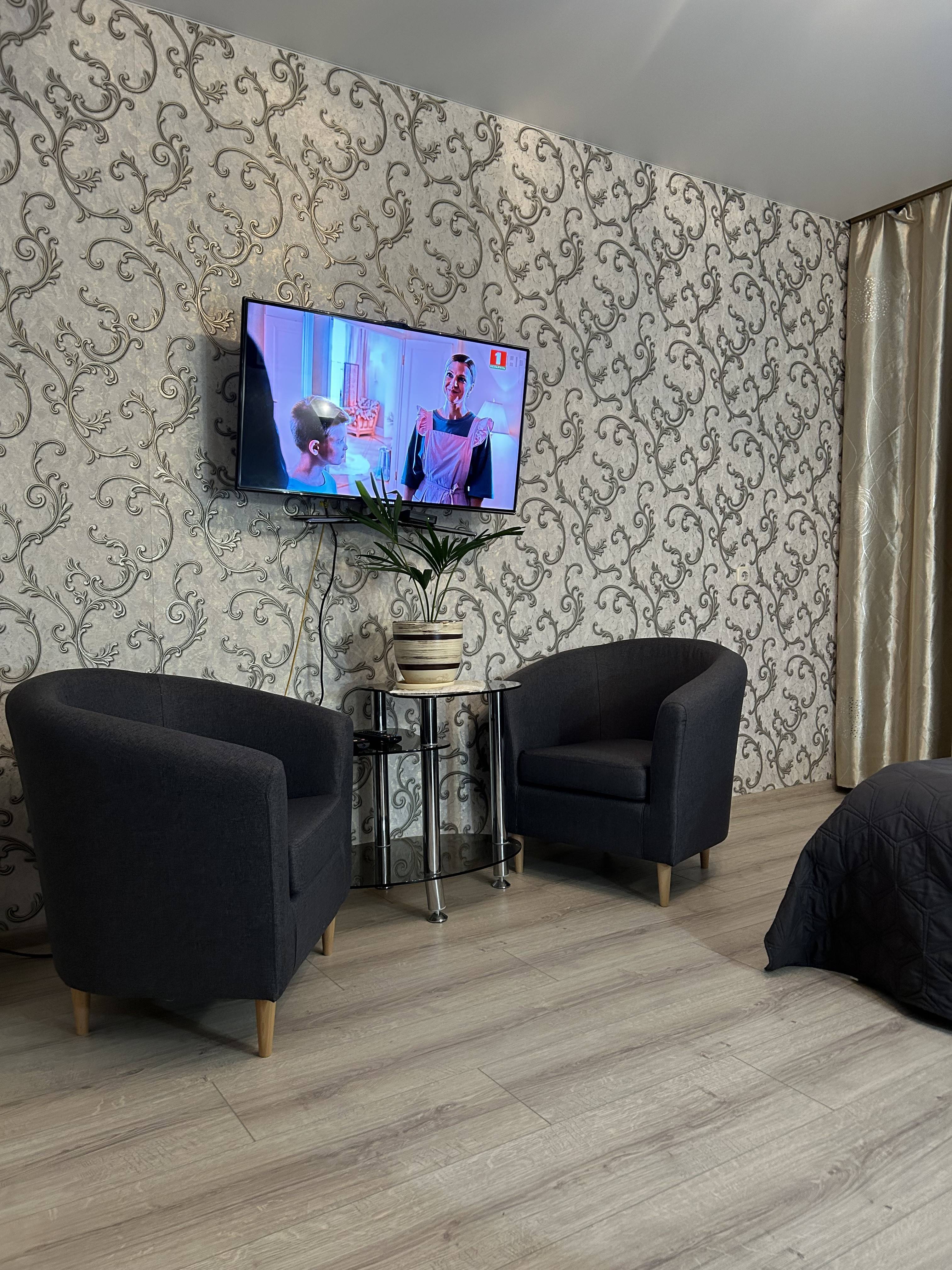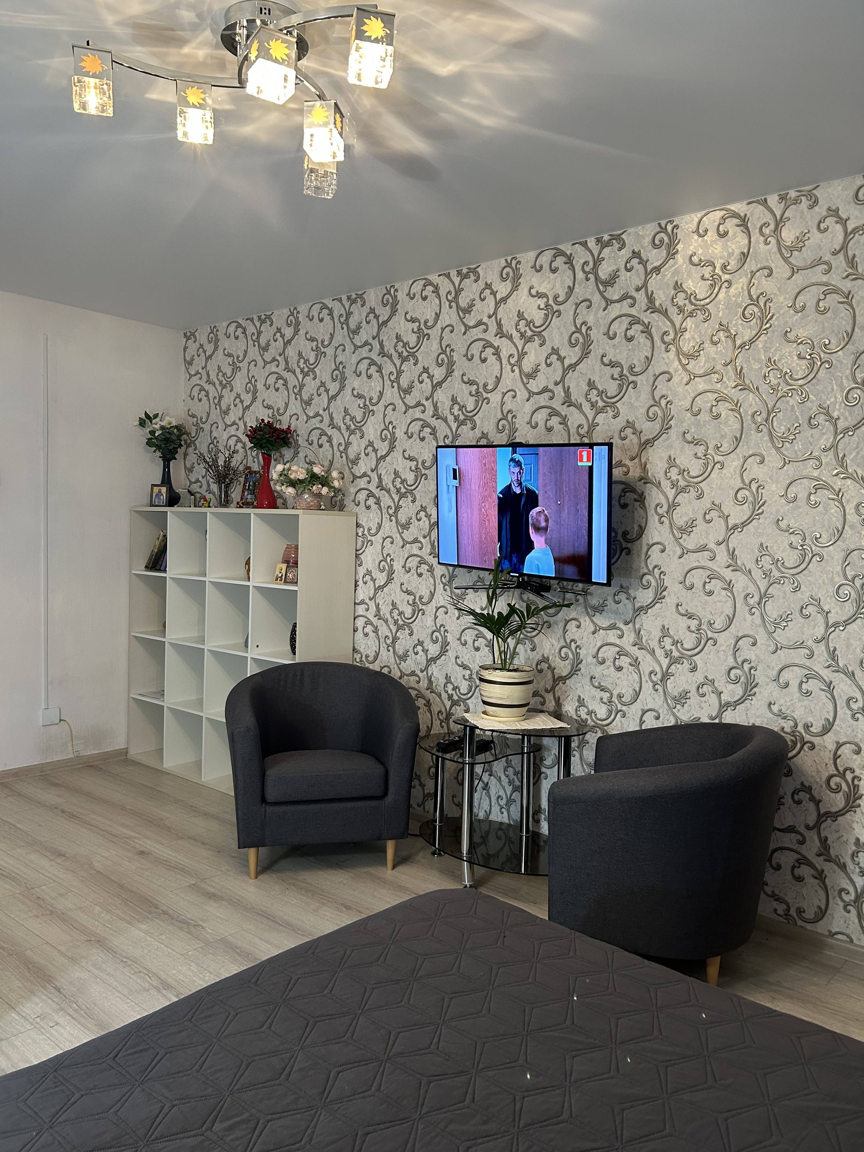 В Квартире есть 2 сп кровать ,2сп диван , посуда , СВЧ печь ,эл чайник,постельное белье, комплект полатенец,фен,утюг, стиральная машина ,WI-FI,ZALA TB