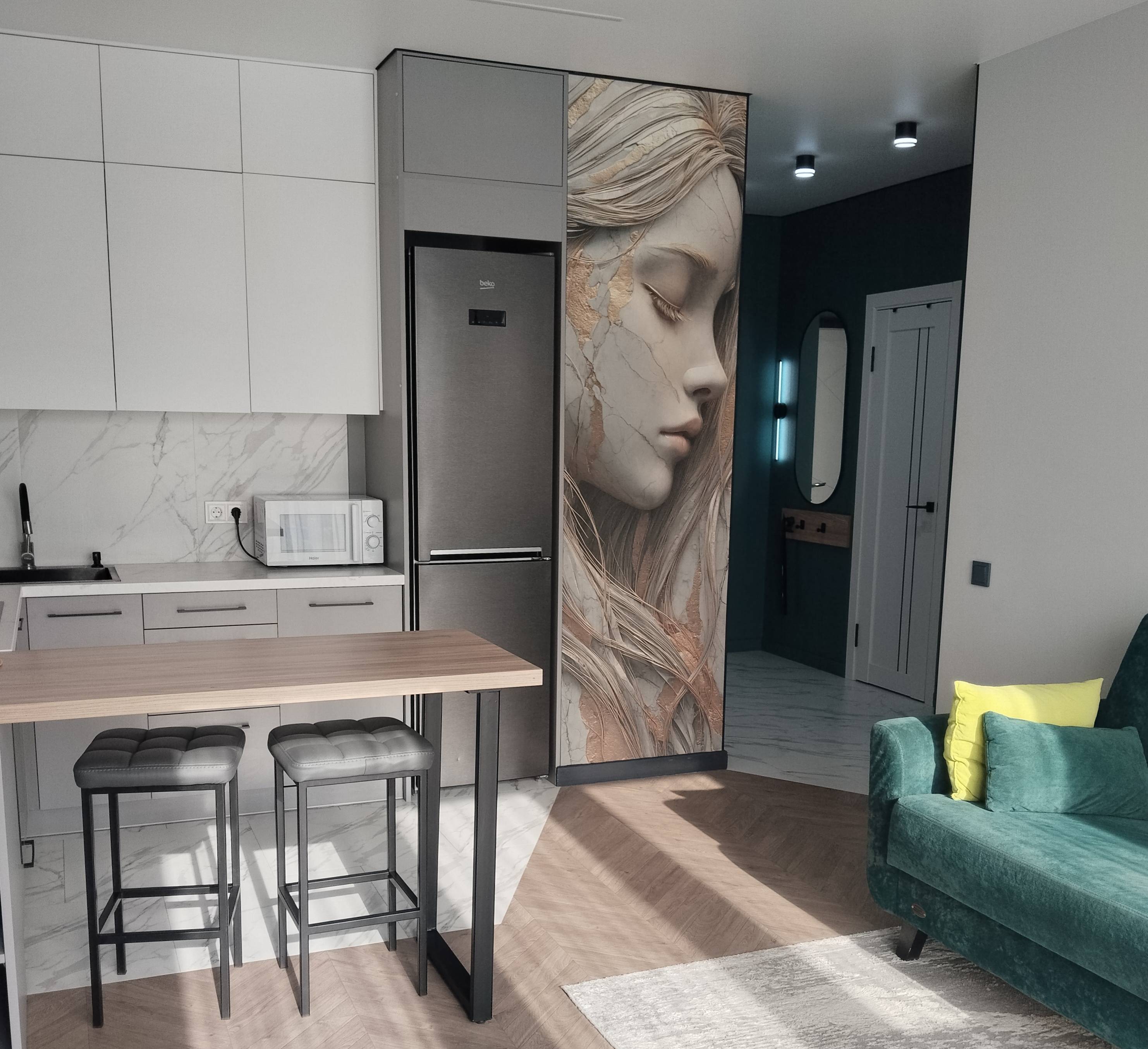 Квартира с шикарным ремонтом, отдельная спальня (с выходом на балкон), совместная кухня-гостинная. В каждом уголке данной квартиры прослеживается рука мастера-дизайнера ( даже на балконе и в санузле очень красиво ). Мебель везде новая. На кухне есть всё для приготовления еды ( холодильник, микроволновка, чайник, плита, посудомоечная машина и соответственно вся посуда). В гостиной большой телевизор, работает wi-fi. Имеется стиральная машина, что очень удобно. Так как окна панорамные, с 22 этажа вид (особенно вечером) на Минск-Мир - прекрасный! Проживал 4 суток, остался очень доволен данным жильем. Заселение и выселение безконтактное, тоже удобно и не нужно подстраиваться под встречу с хозяином. Мне для работы нужны были отчётные документы о проживании, без всяких проблем хозяйка мне их подготовила. Рядом метро "Аэродромная", ТЦ "Авиа Молл", и куча всяких кафе. Огромное спасибо хозяйке за возможность пожить в этой квартире!!!