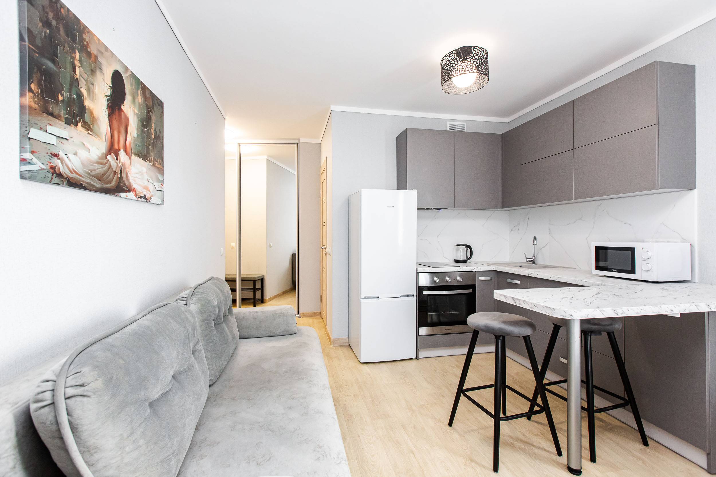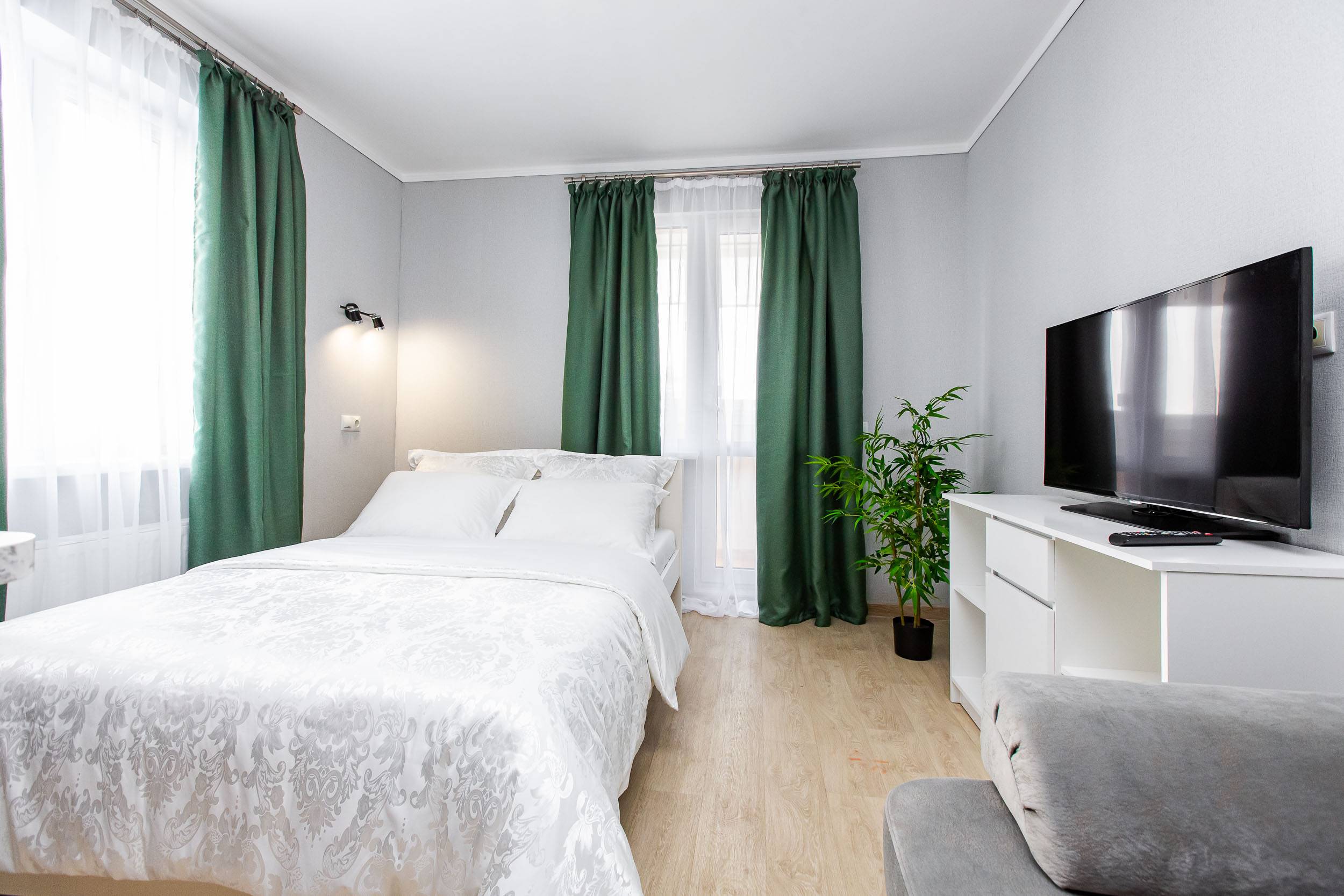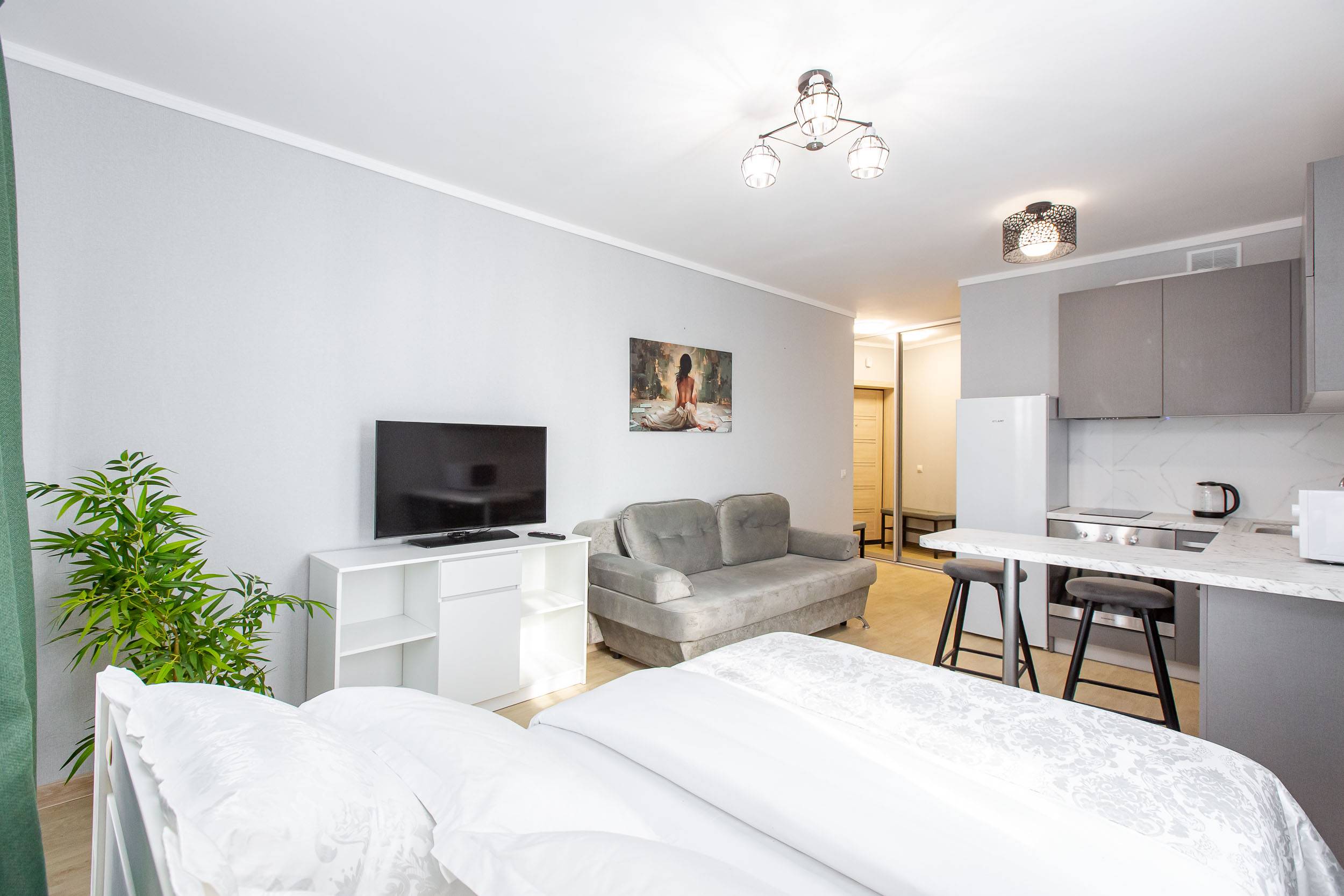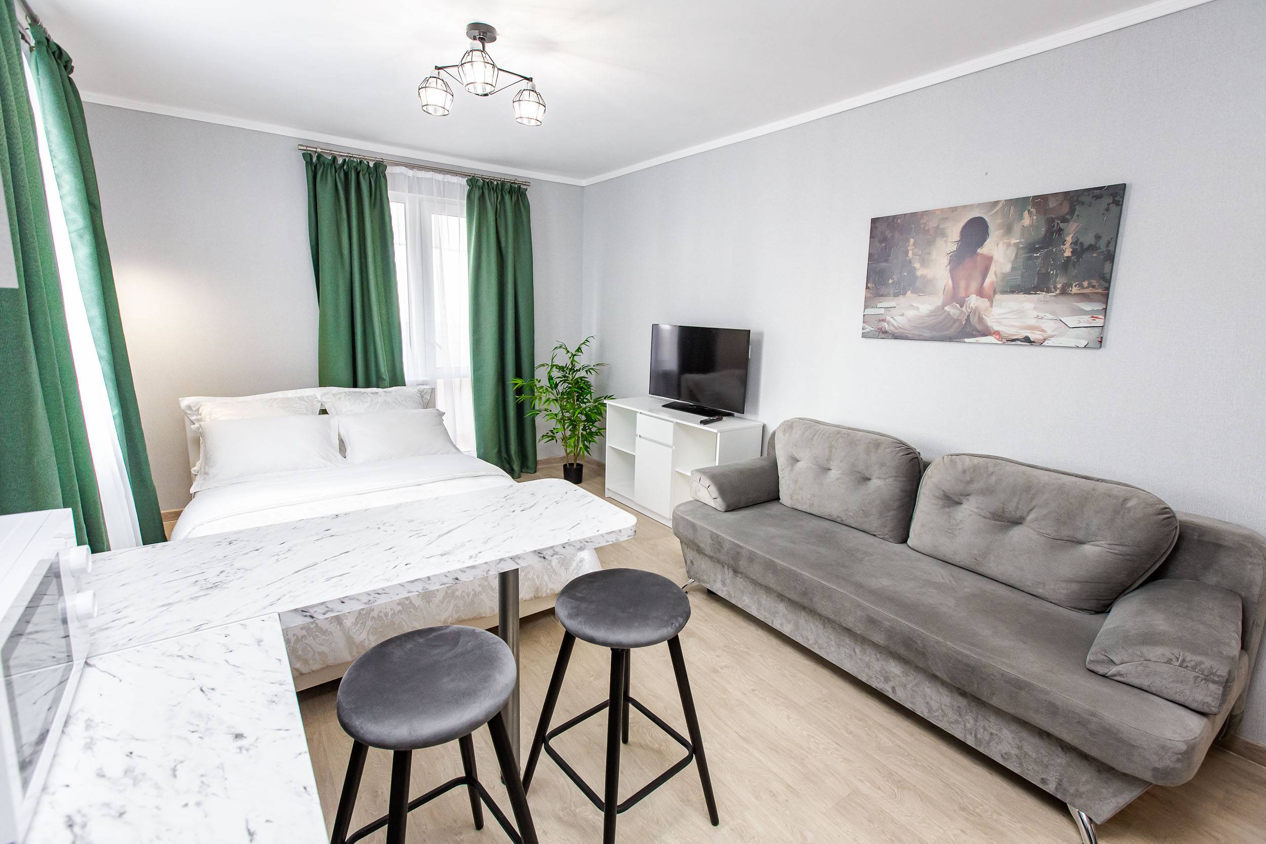 Уютная квартира-студия по адресу ул.Грушевская, 21, расположенную на 14 этаже современного и нового дома. Это идеальное место для комфортного проживания в центре города. В вашем распоряжении большая двуспальная кровать, которая обеспечит вам крепкий сон и отдых, а также удобный диван для расслабления после насыщенного дня.