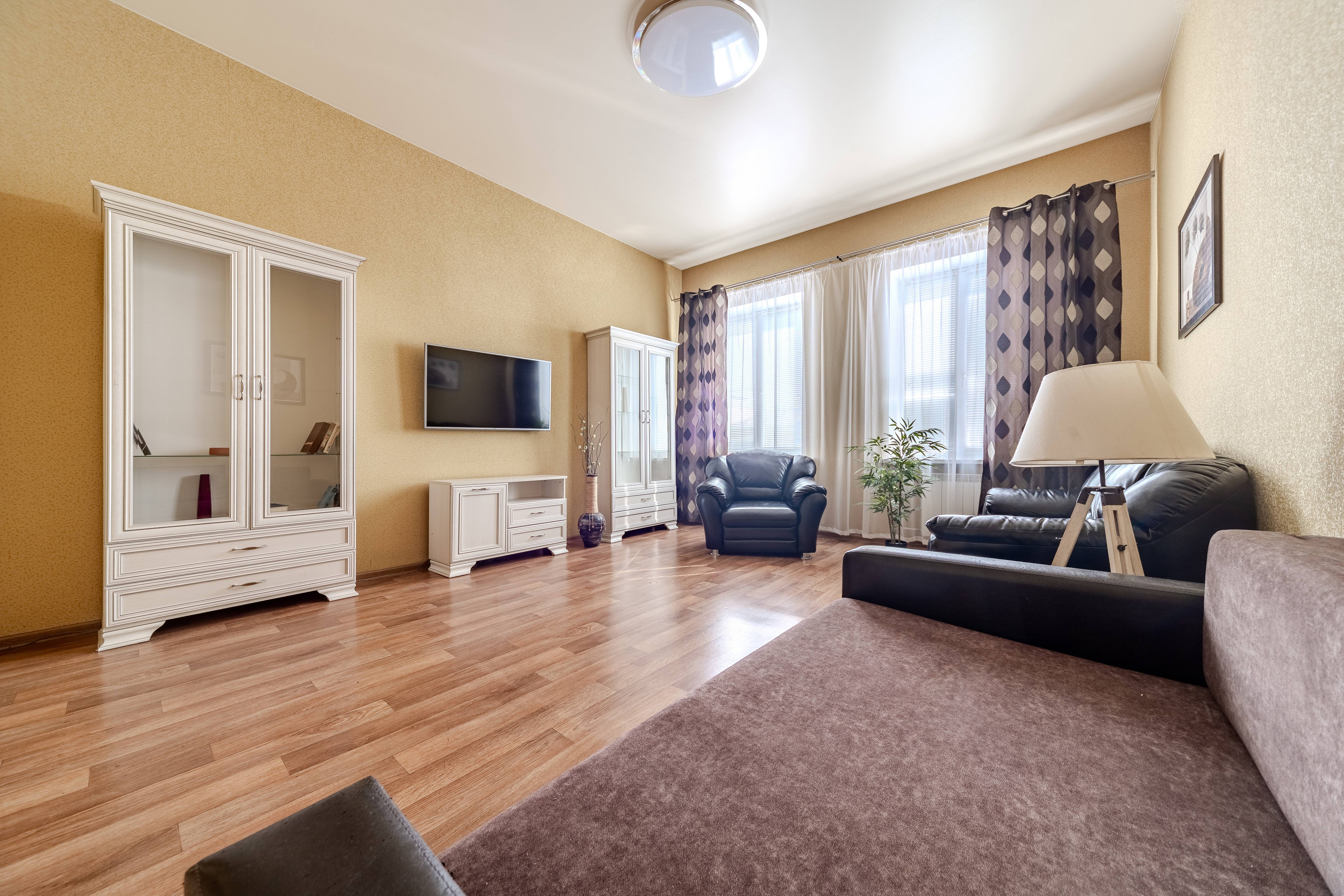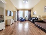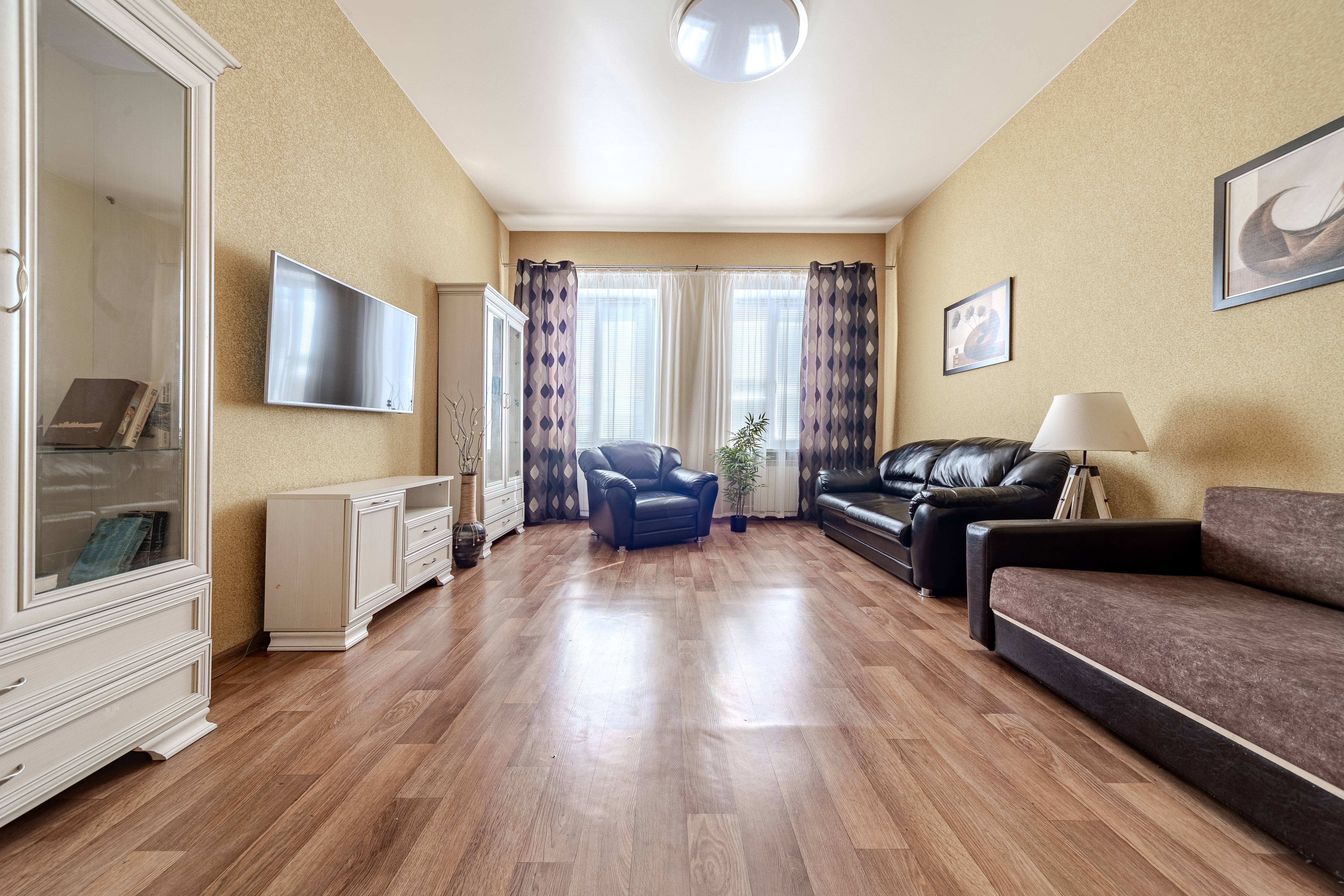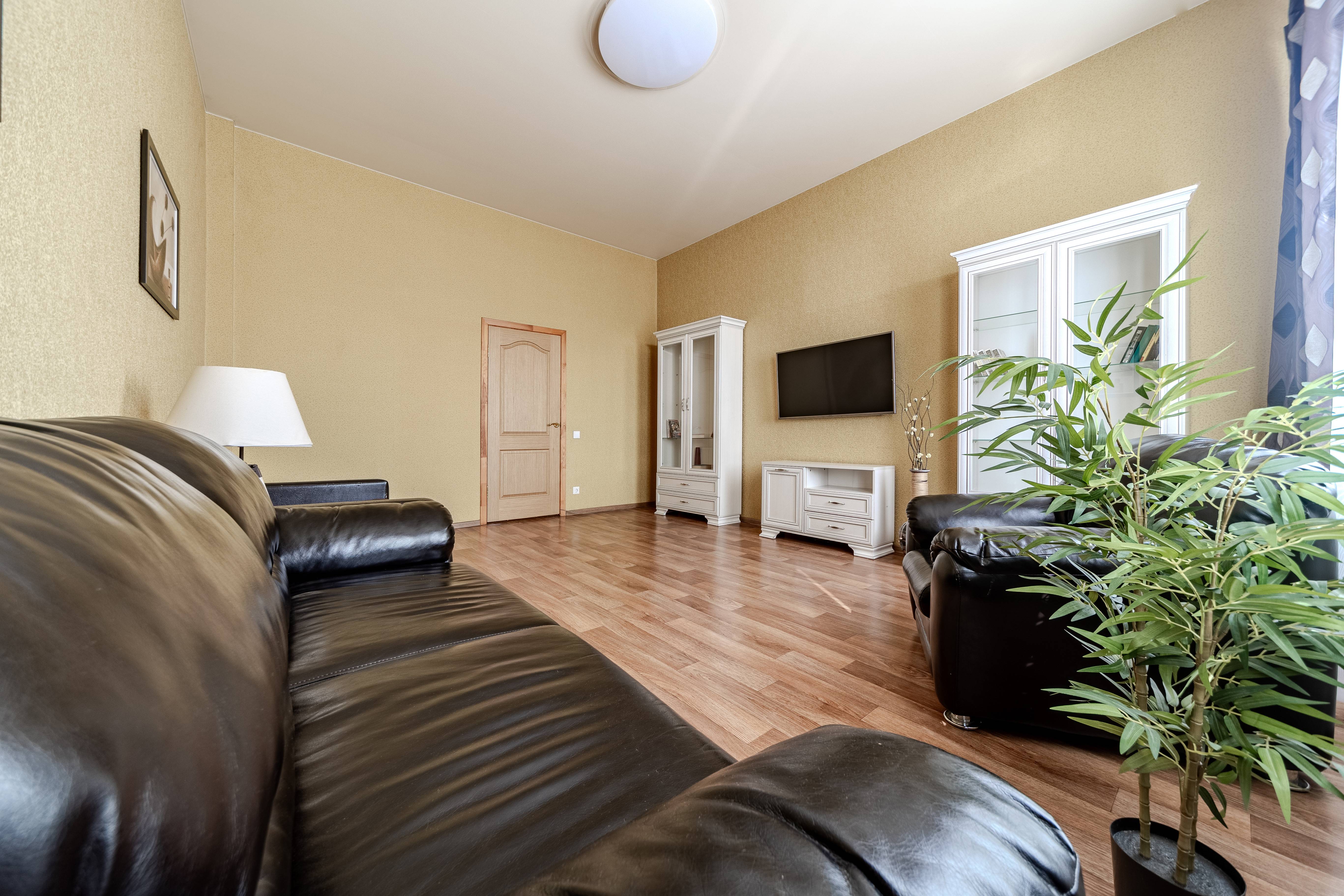 В квартире три изолированных спальни, каждая из которых оборудована большой двуспальной кроватью, что обеспечит вам спокойный и комфортный отдых. Просторная гостиная оформлена в современном стиле и является идеальным местом для общения и отдыха после насыщенного дня.