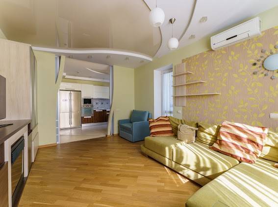 Большой комфортный угловой диван в гостиной и кресло-кровать