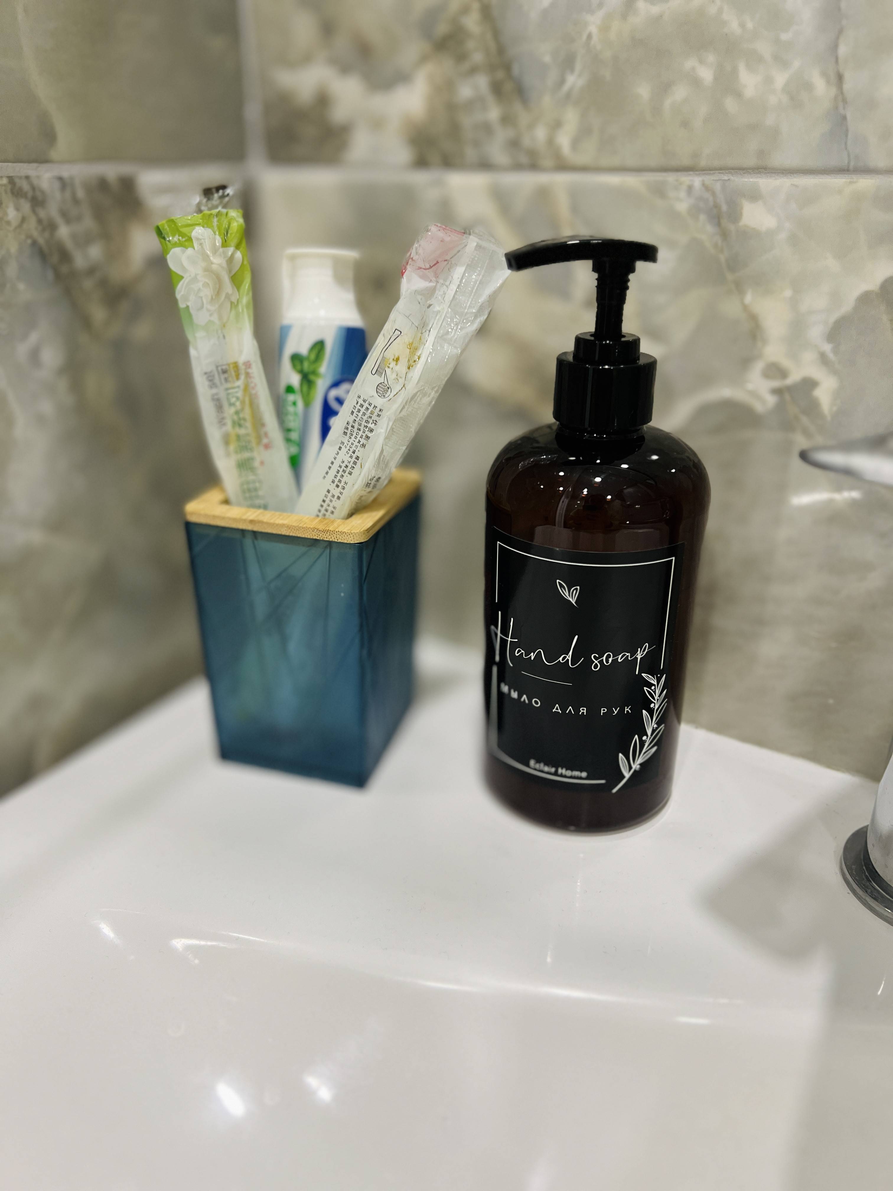 ванная с шампунями, гелями, одноразовыми зубными щетками, феном;