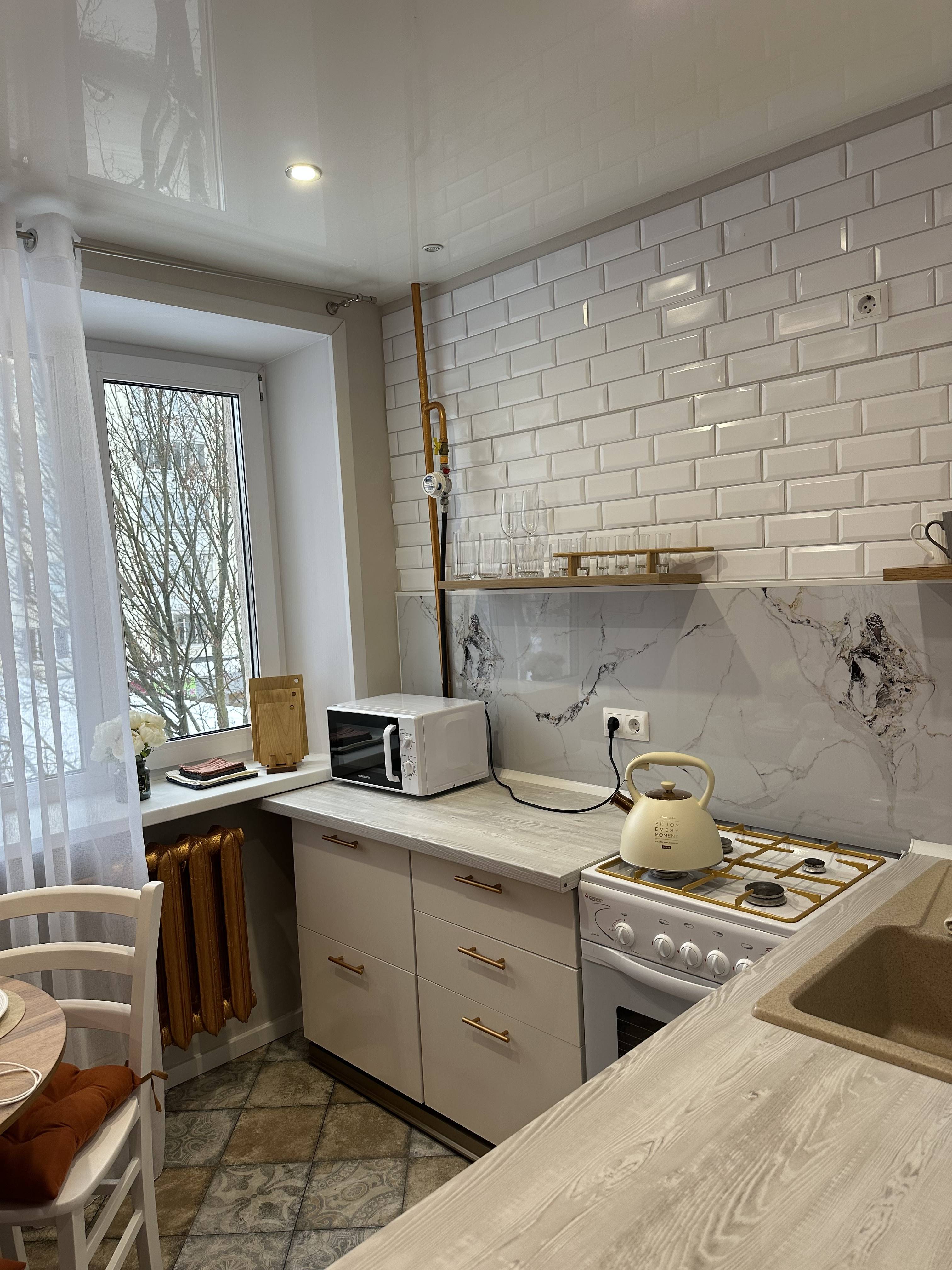 Мы постарались продумать всё до мелочей. От хороших бокалов под игристое, классических фарфоровых тарелок до полного набора уходовой домашней косметики и предметов личной гигиены для дам.