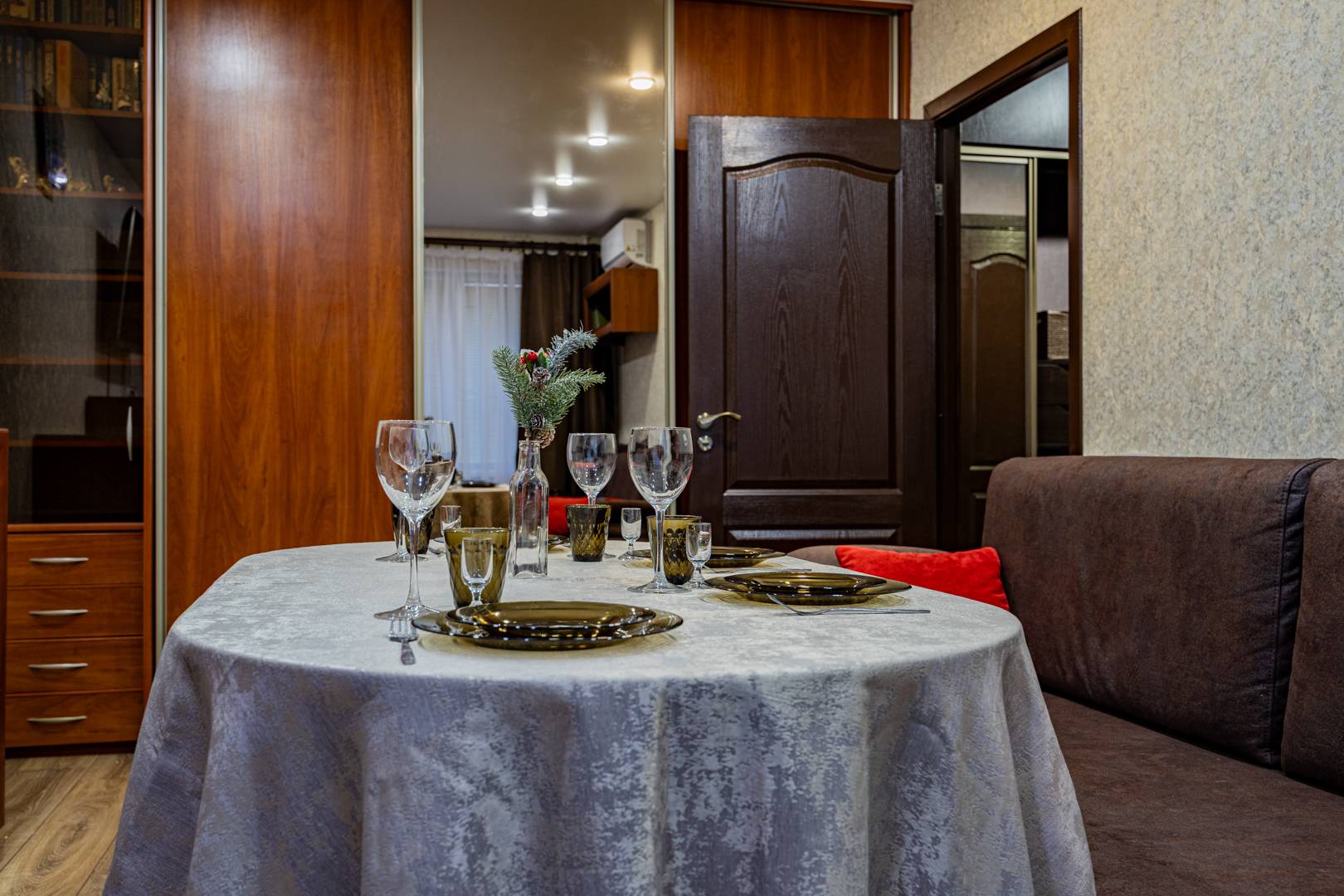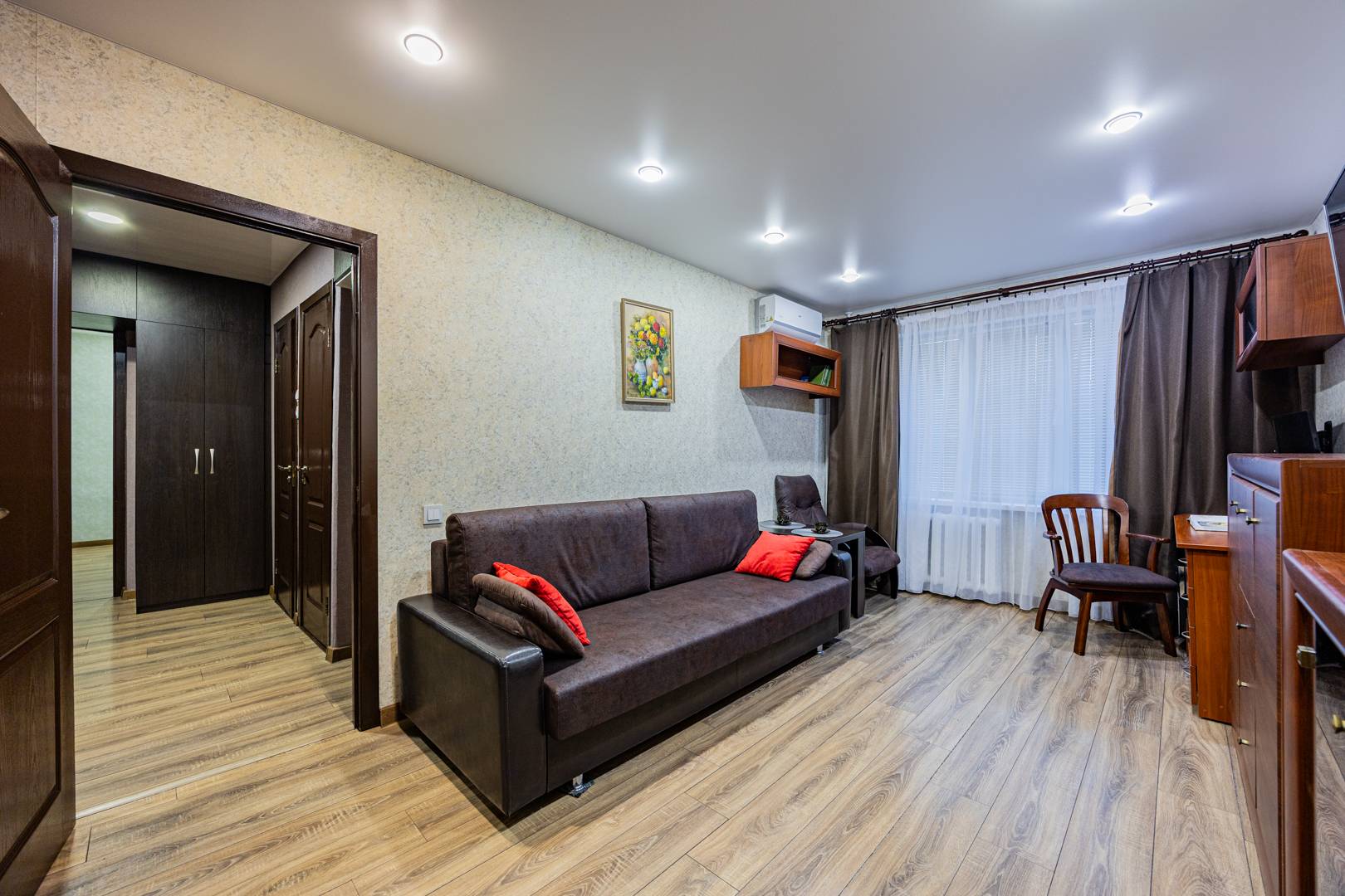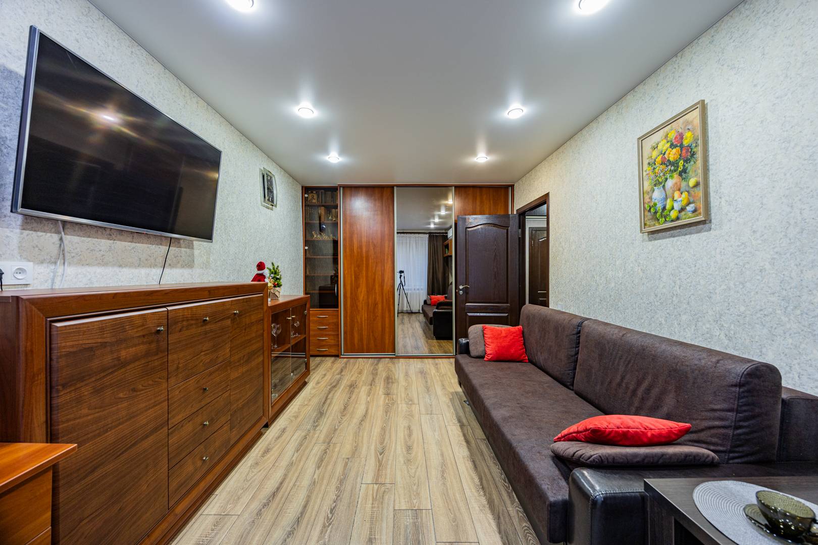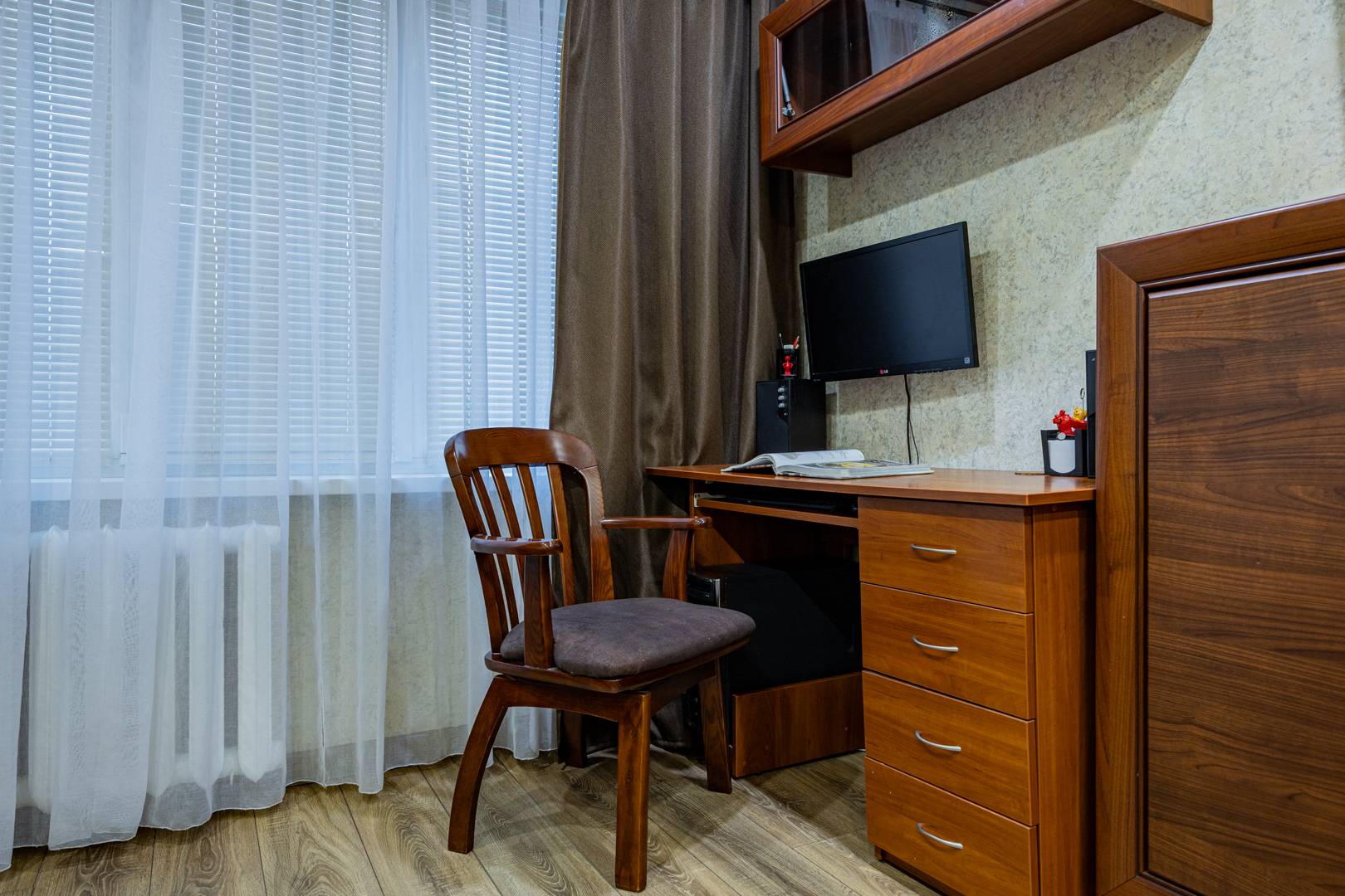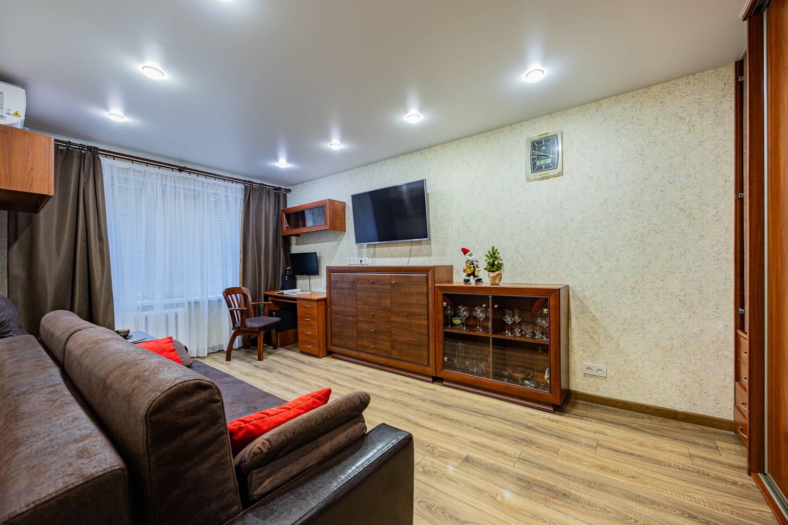 • Вторая комната — диван с ортопедическим основанием, встроенный шкаф, рабочий стол, стол-книга, телевизор и др. мебель.