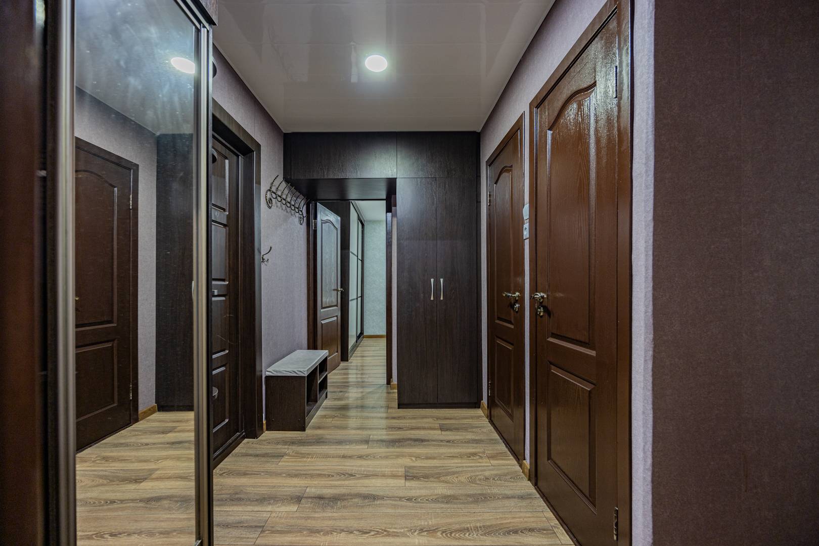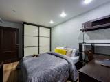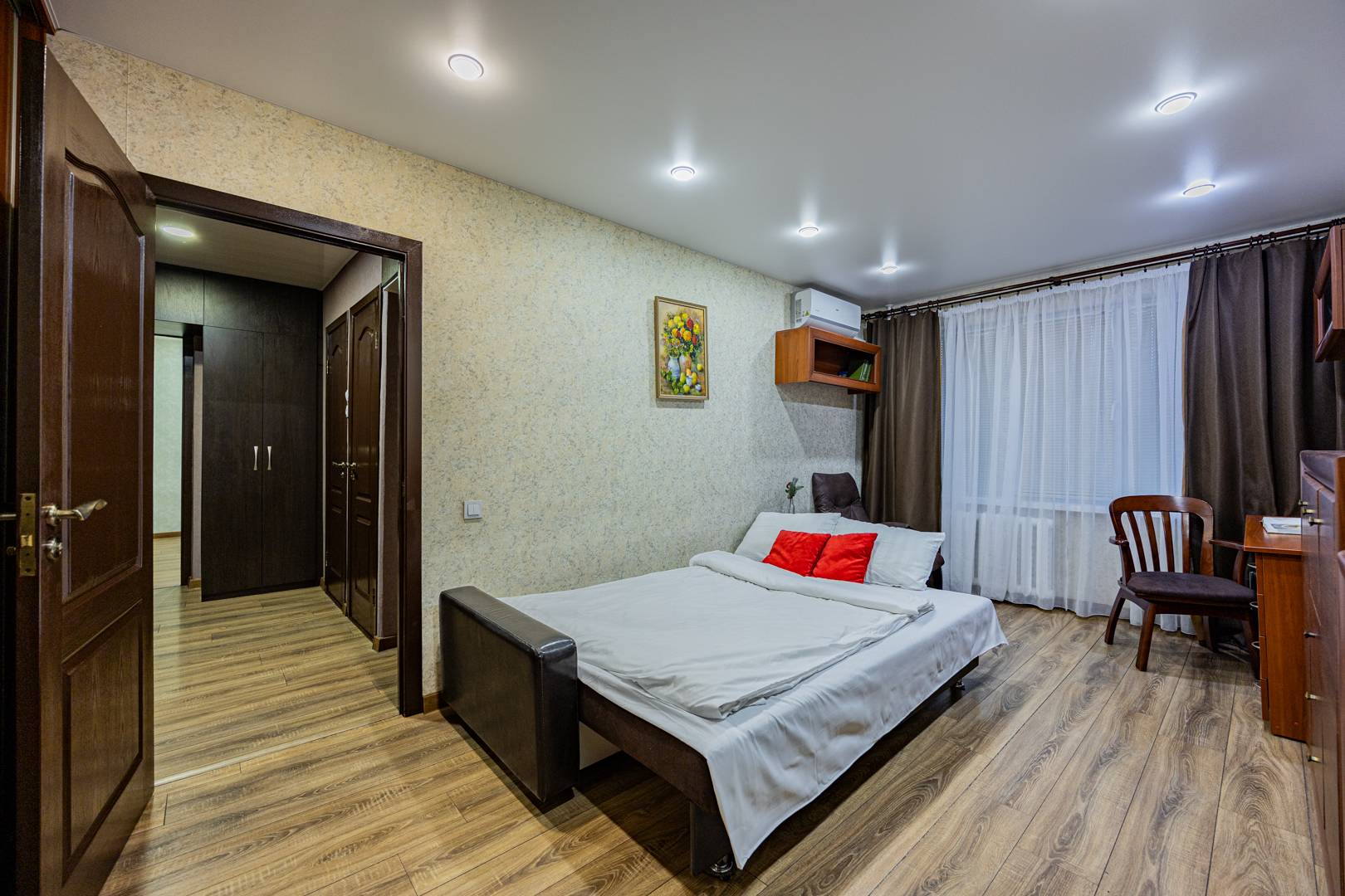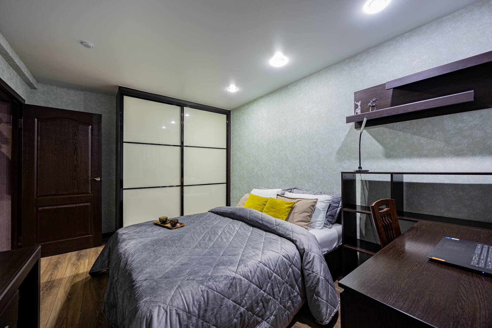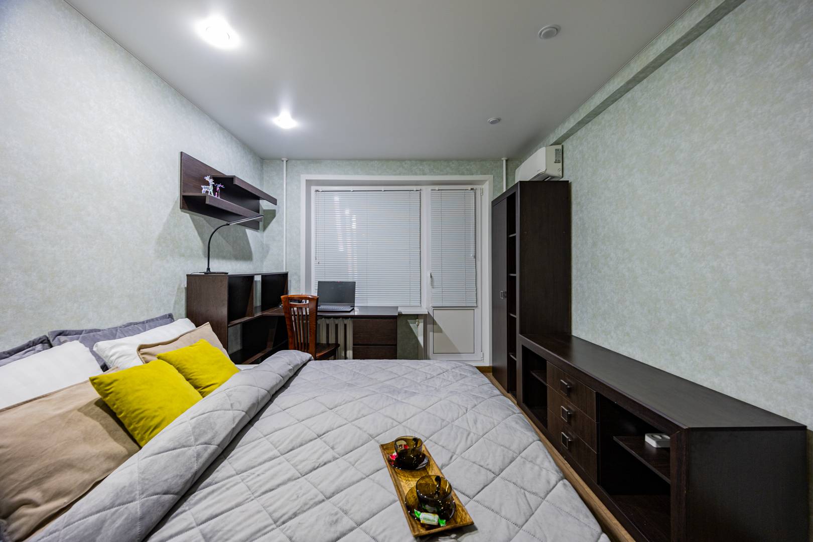• Спальня — двуспальная кровать, встроенный шкаф, рабочий стол и др. мебель.