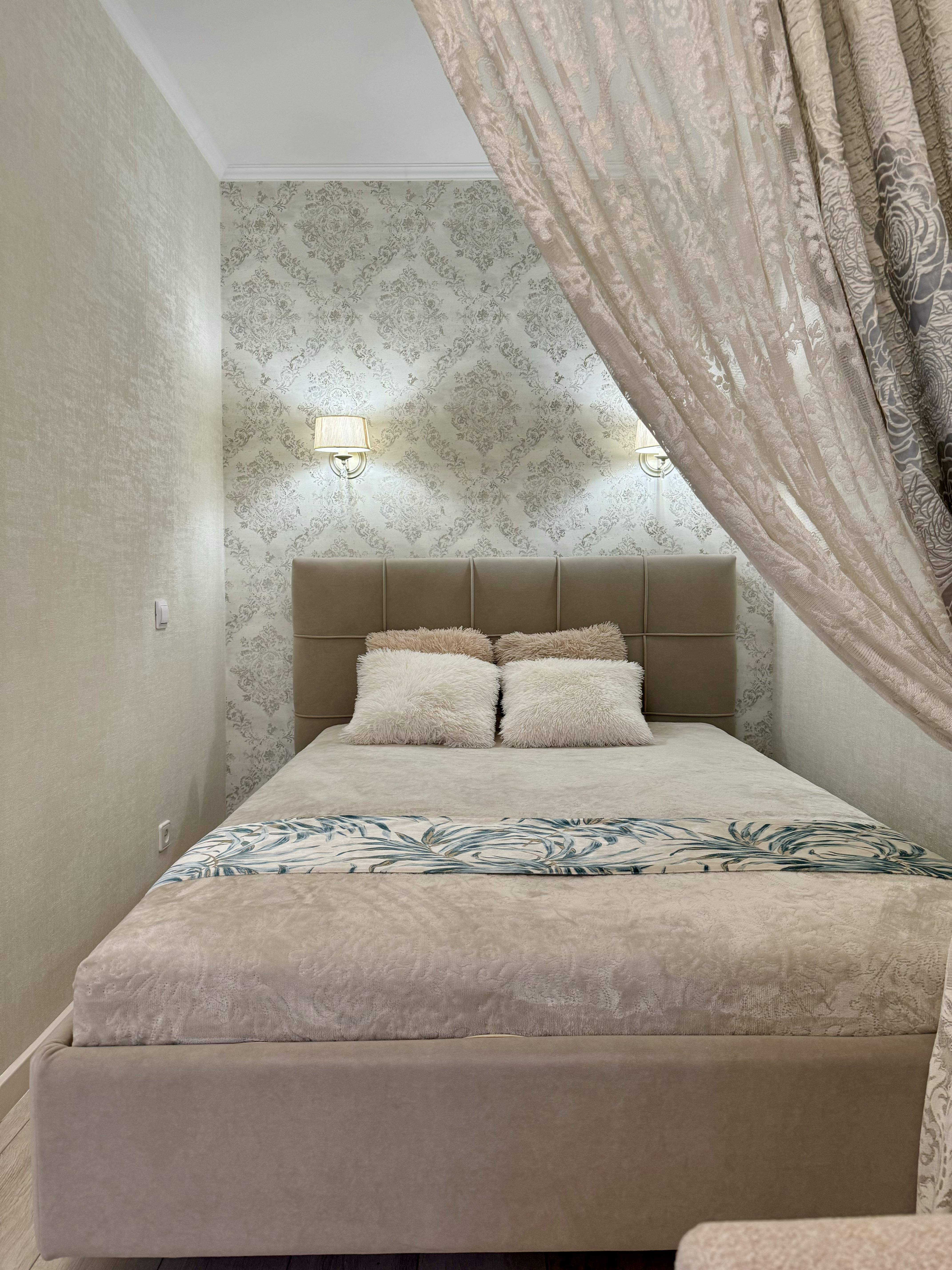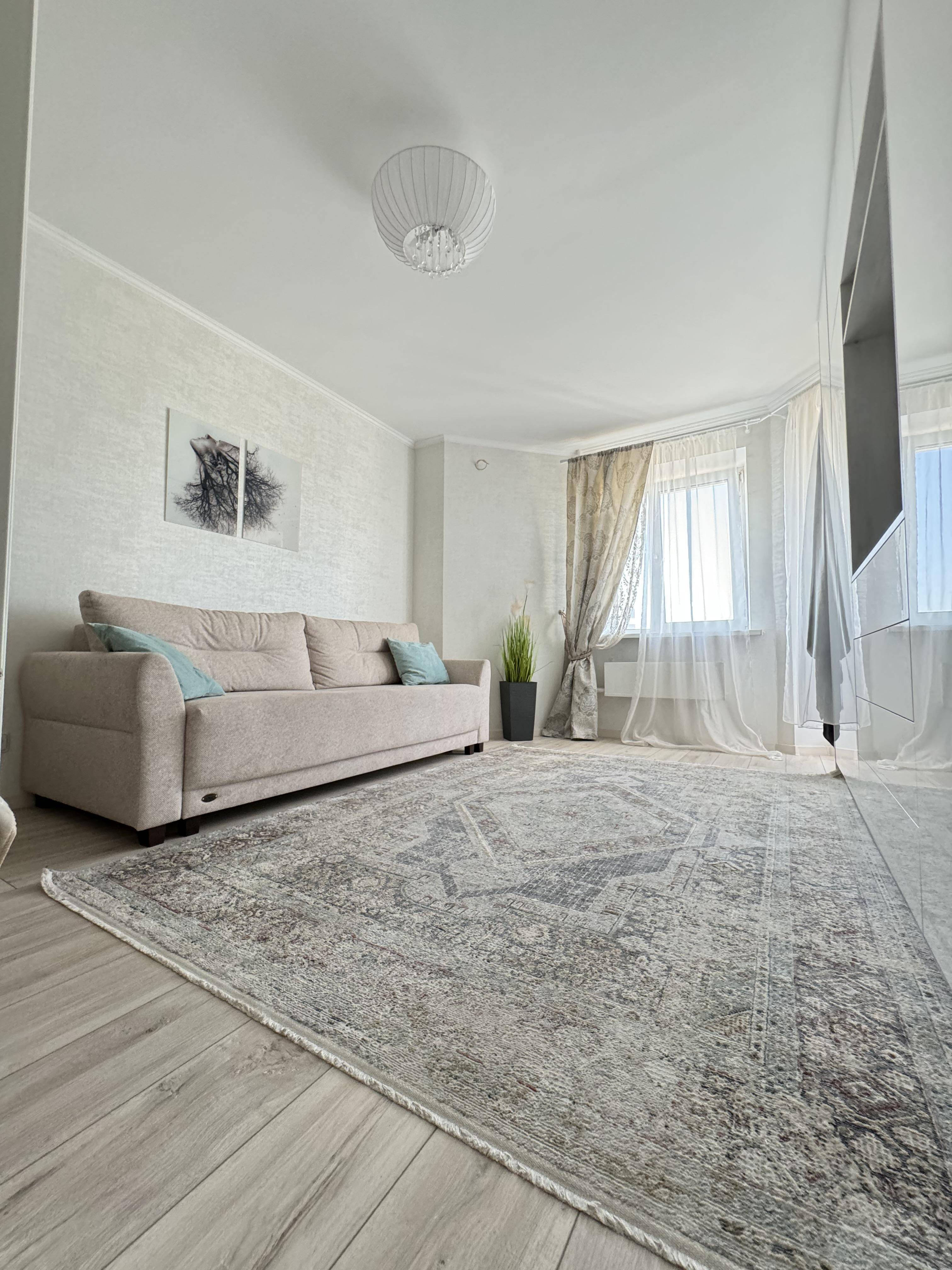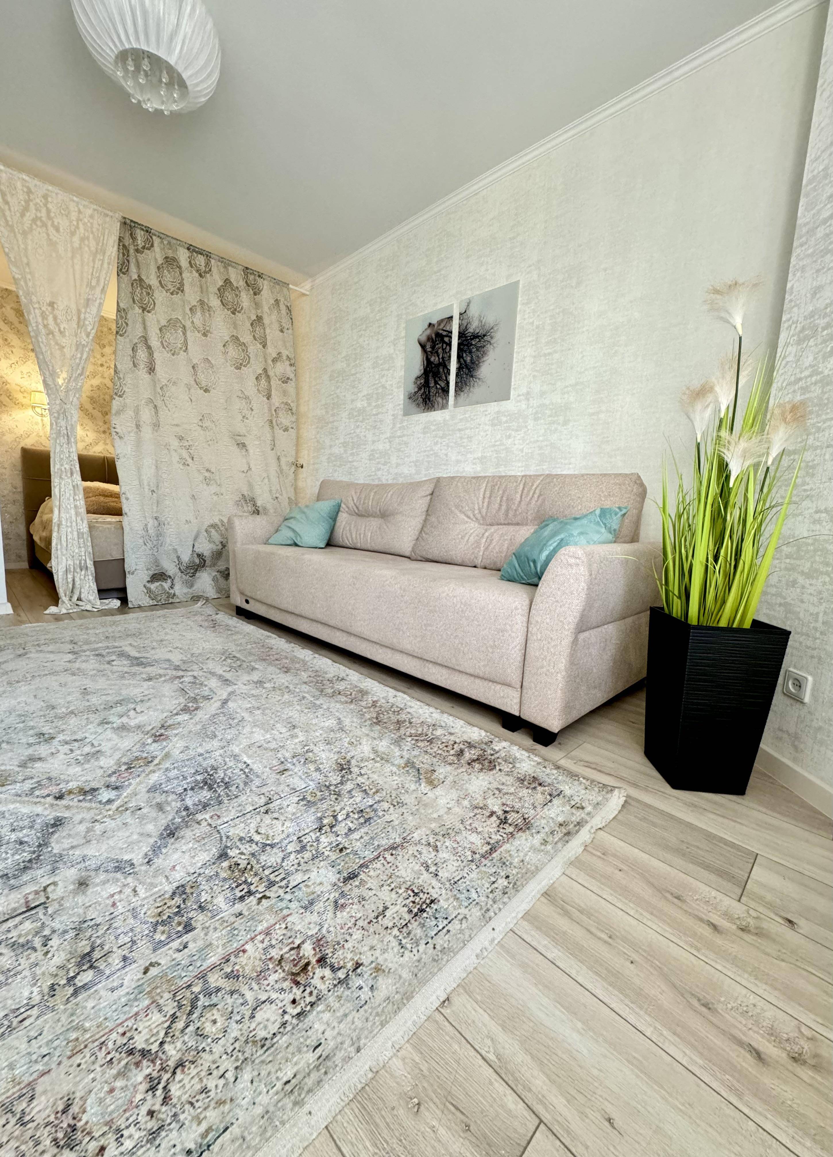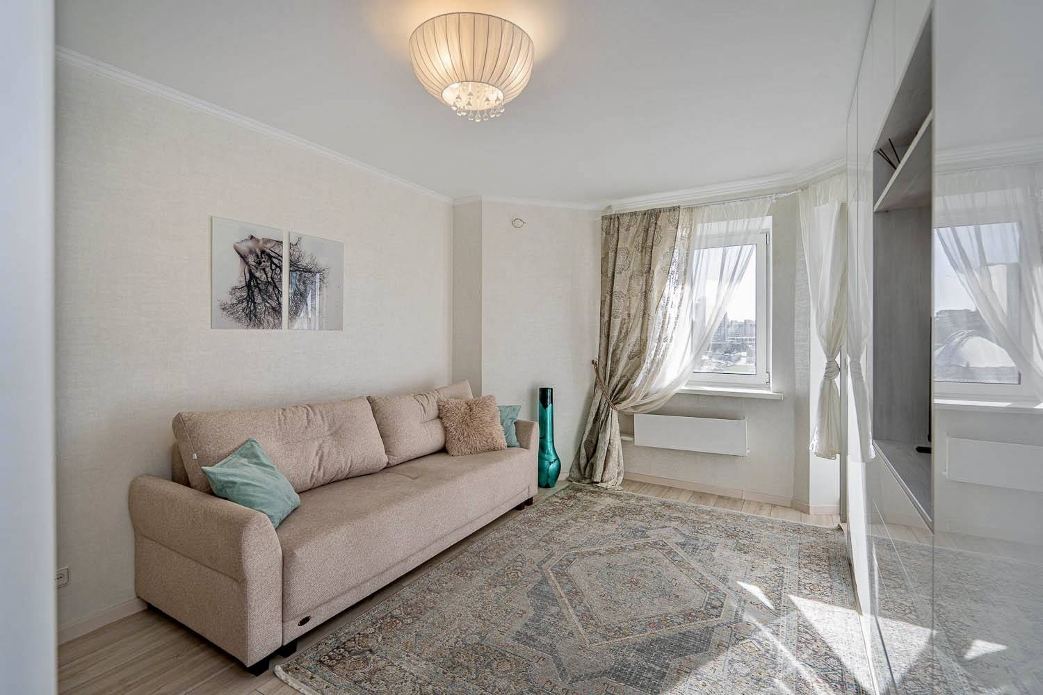 Стильный интерьер выполнен в спокойных тонах. Двуспальная кровать с ортопедическим основанием и большой раскладной диван для удобства гостей представлены в гостиной.