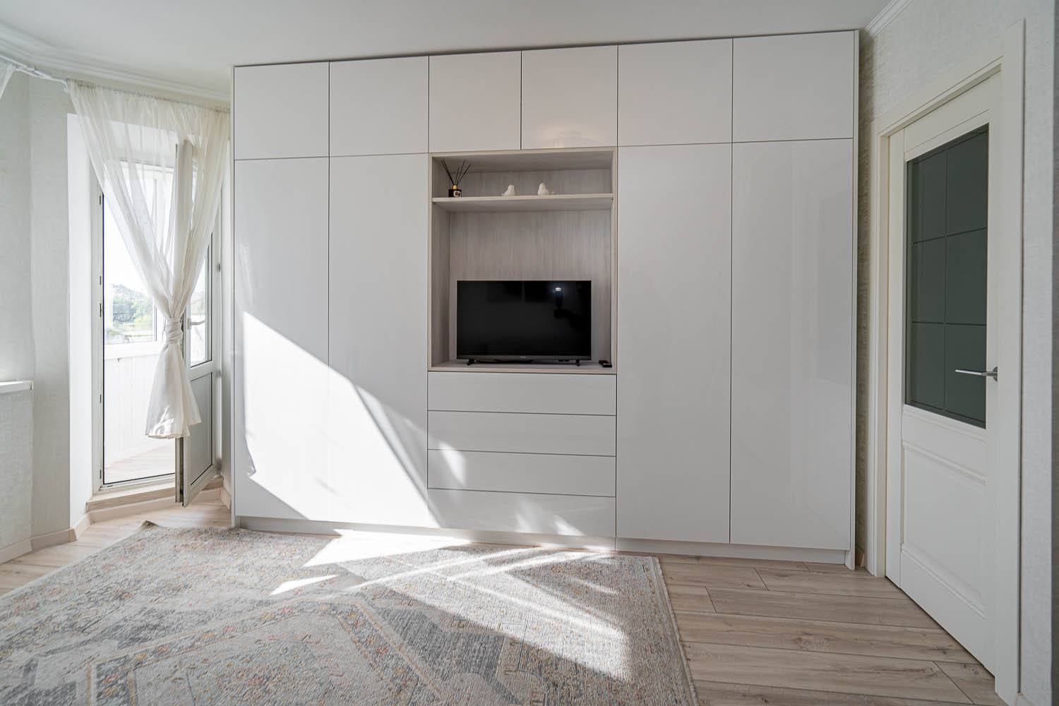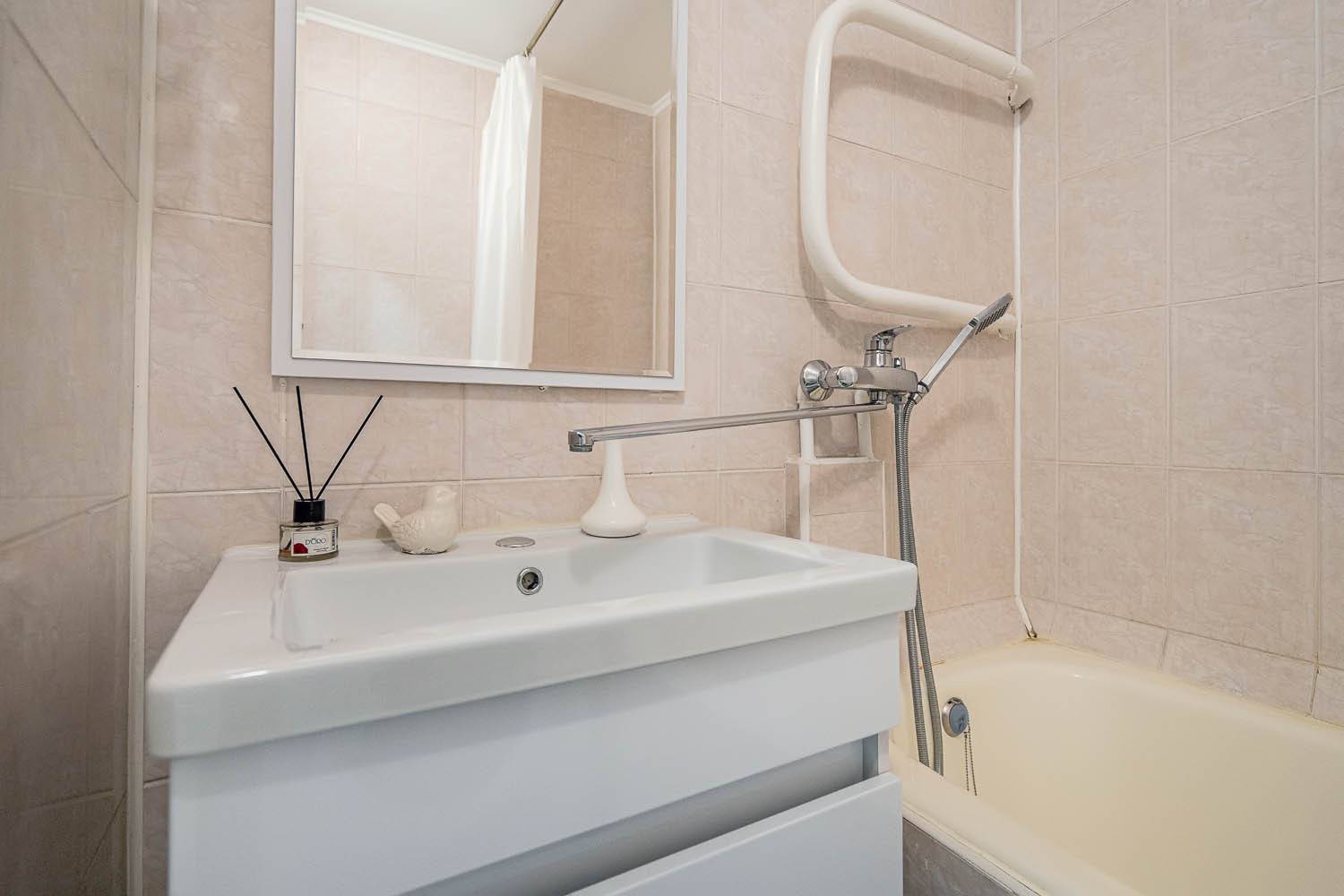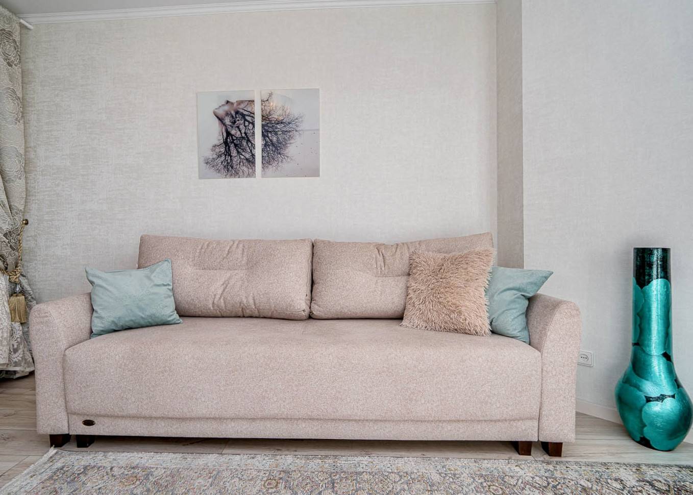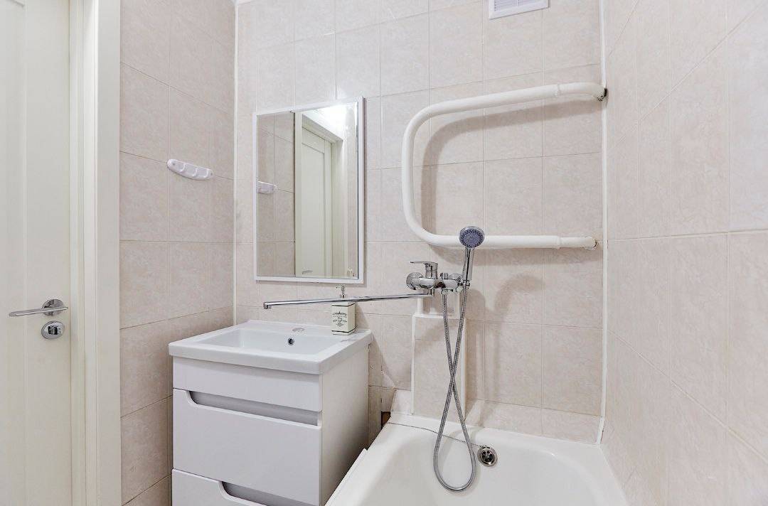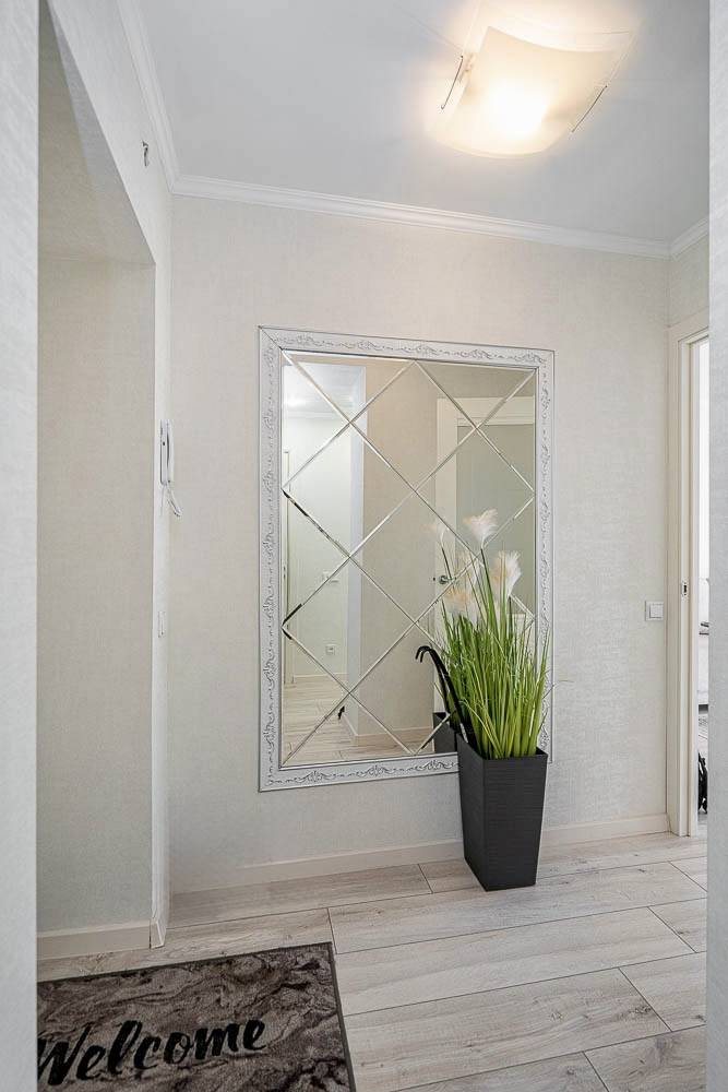 Стильный интерьер выполнен в спокойных тонах. Двуспальная кровать с ортопедическим основанием и большой раскладной диван для удобства гостей представлены в гостиной.