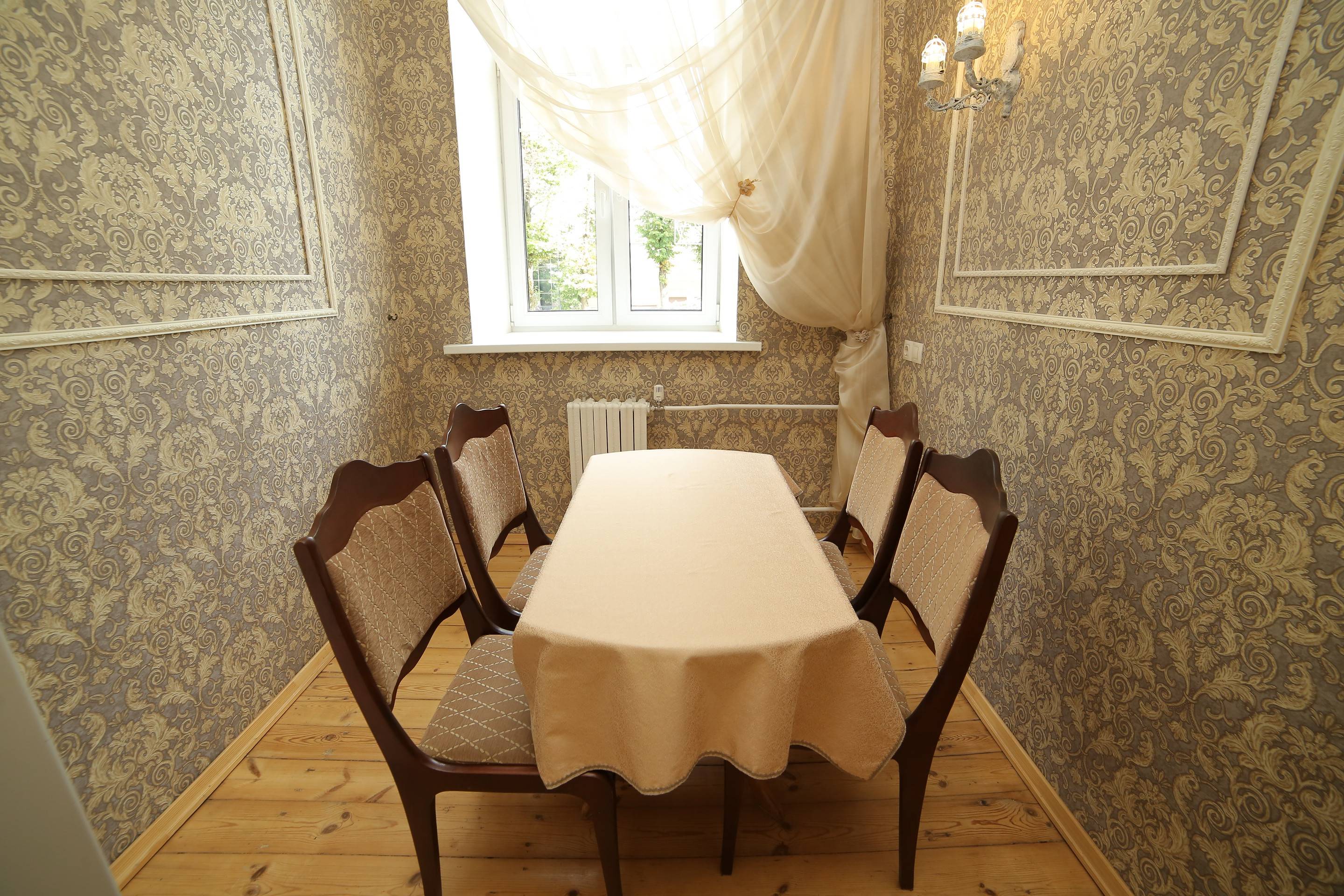 - Кухня: полностью оборудована (посуда, приборы) с обеденной зоной.