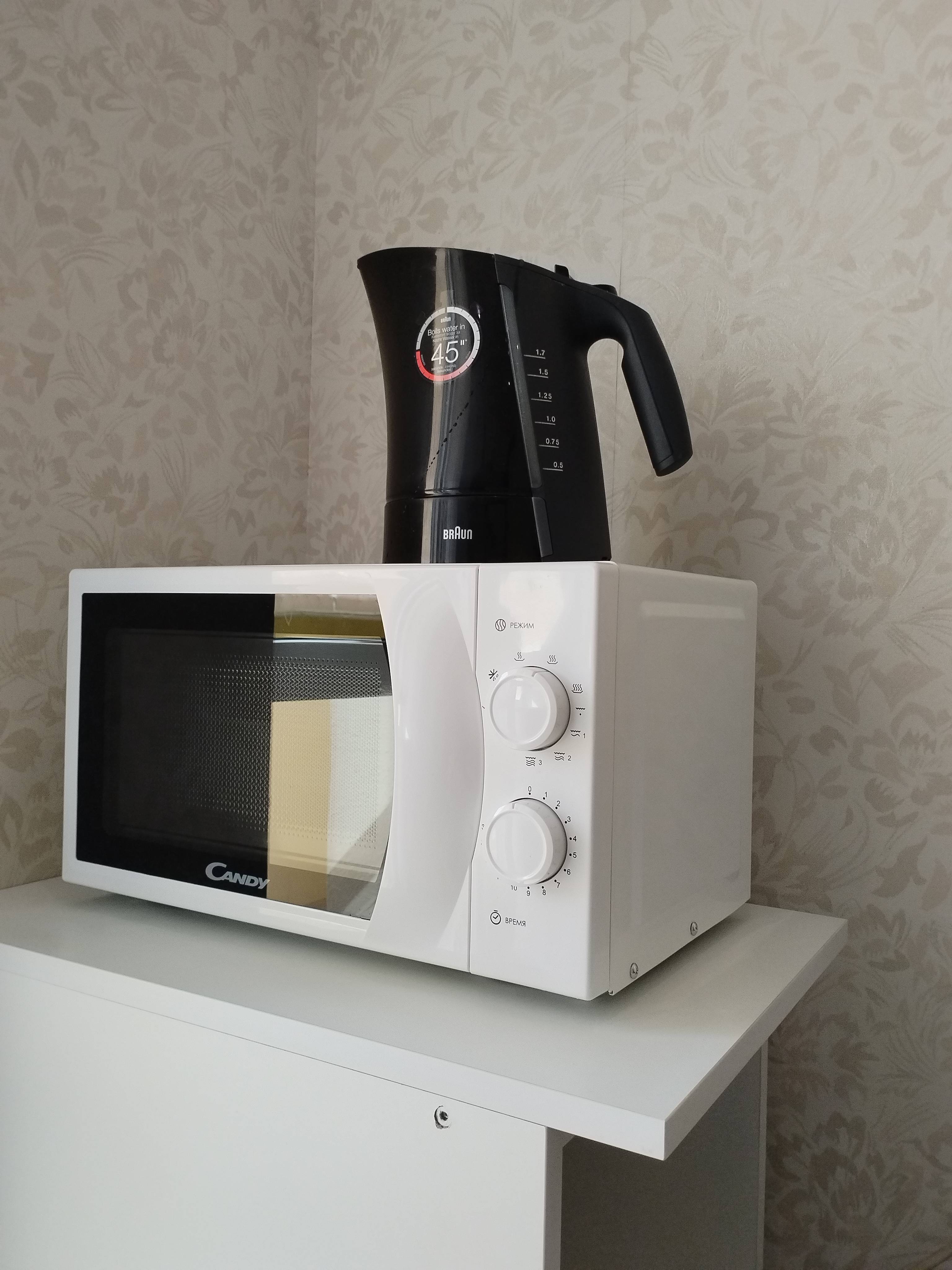 Вся необходимая бытовая техника, кухонная посуда и приборы, сковорода, кастрюли, чайник.