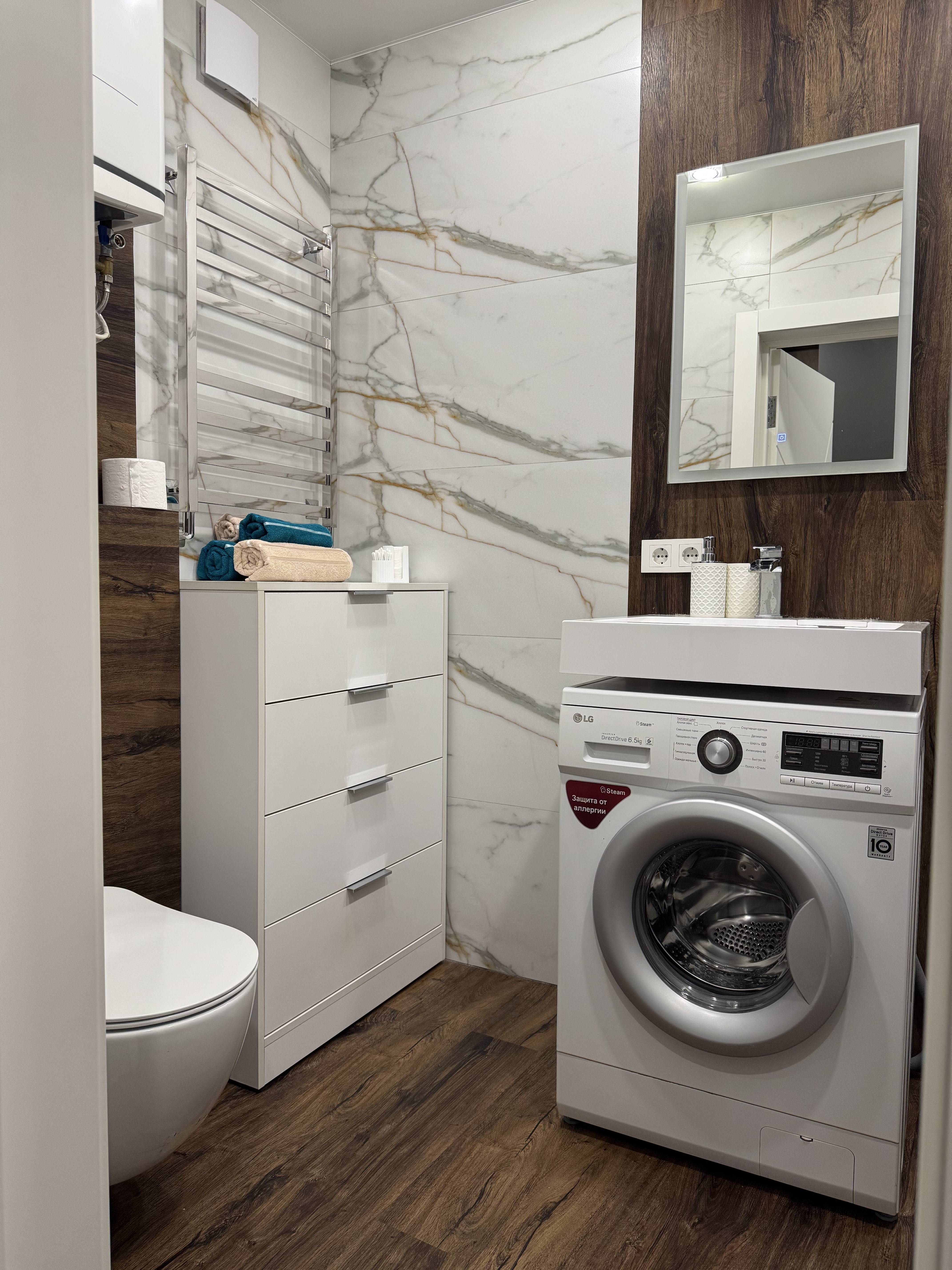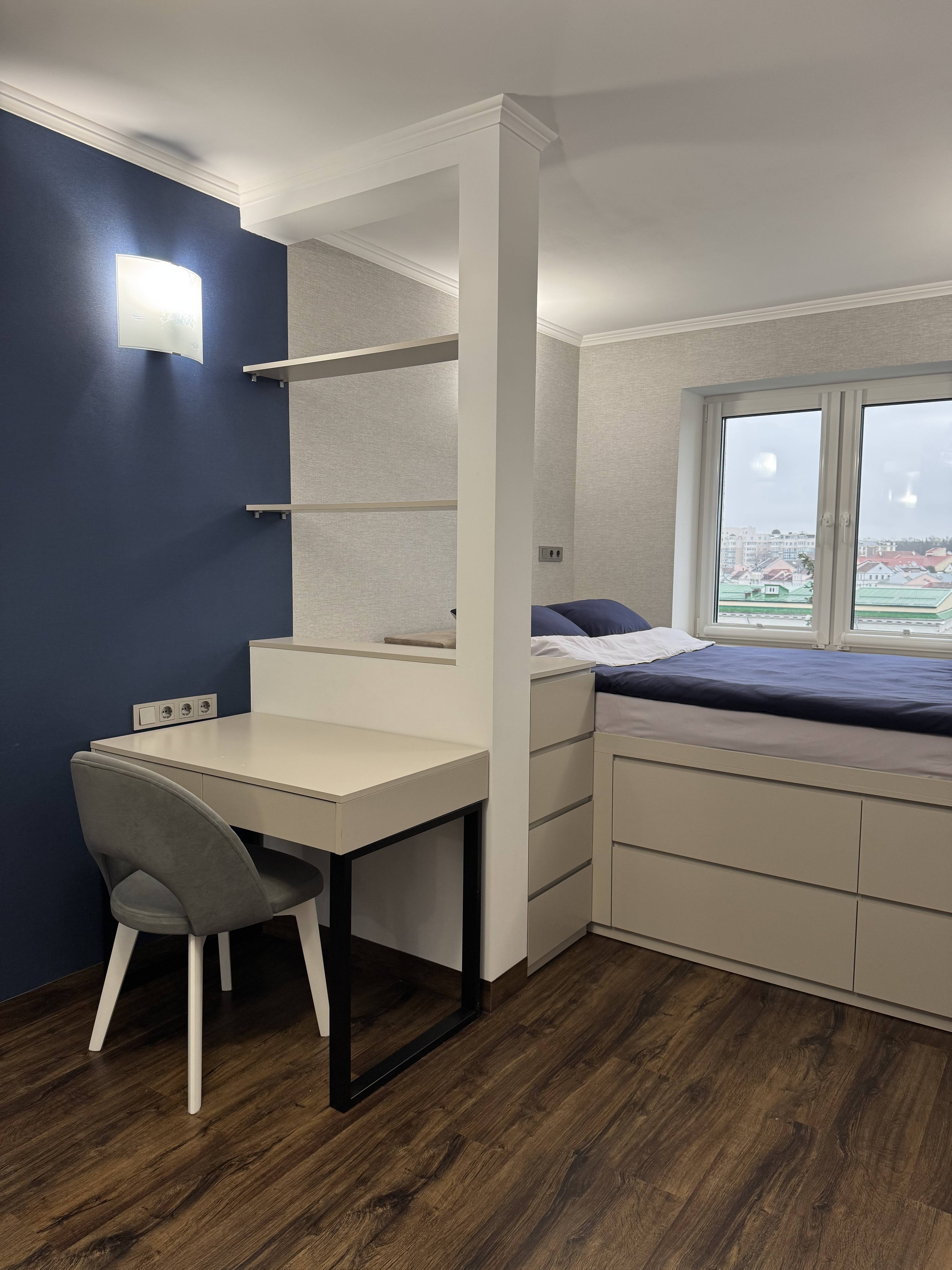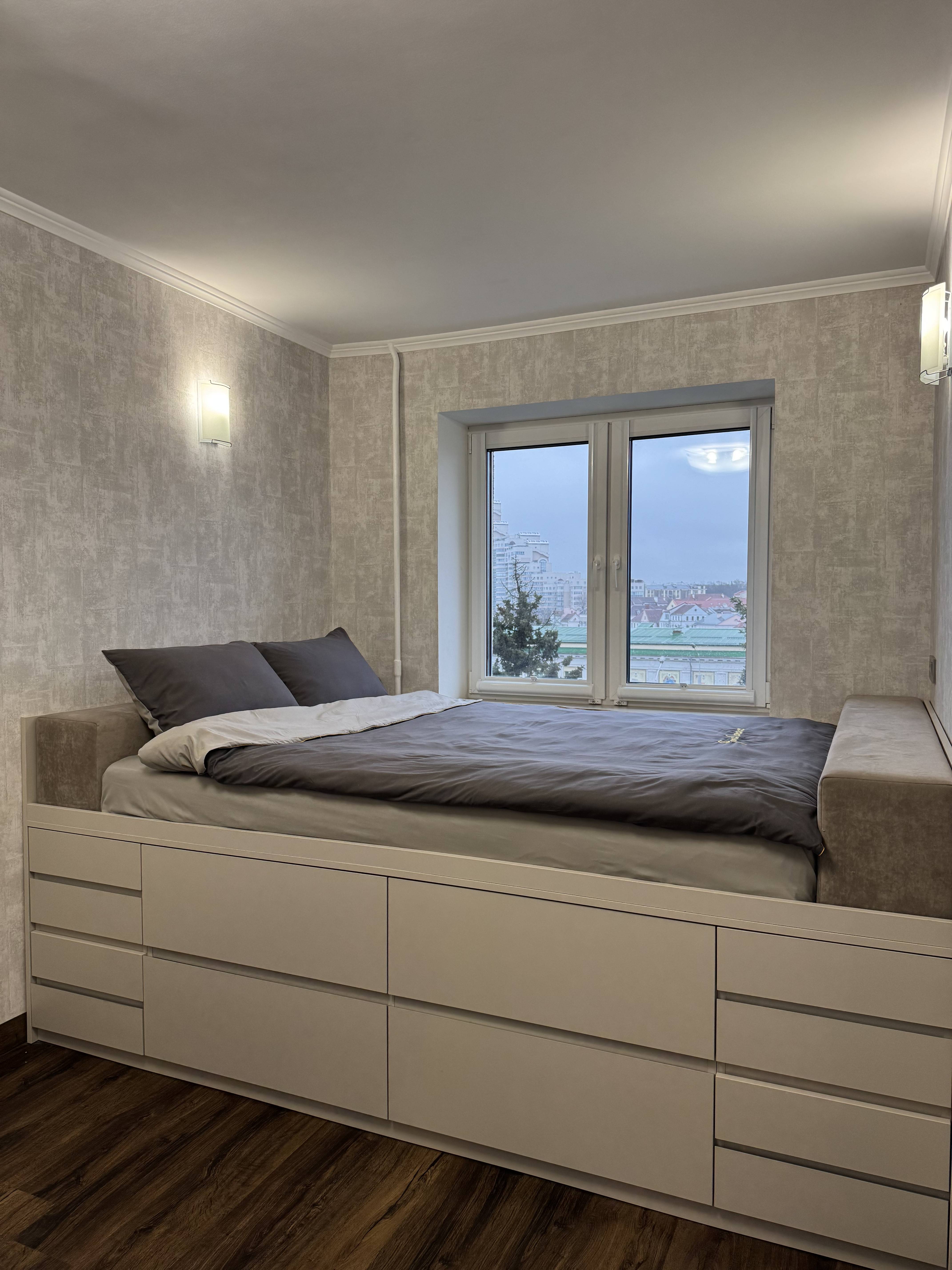 В квартире есть все необходимое для жизни. Кровати в уровень с окнами - можно любоваться городом прямо из постели!