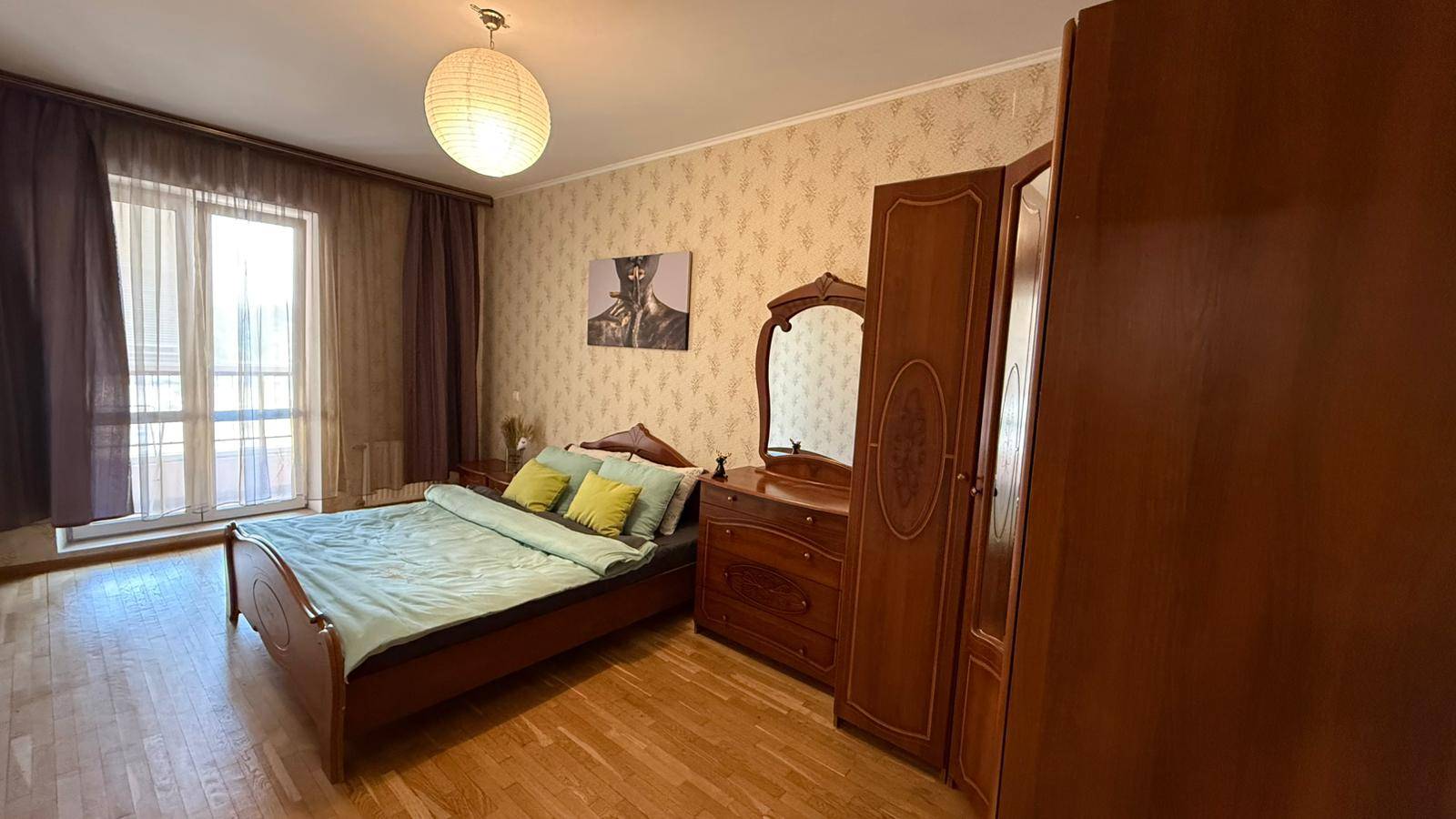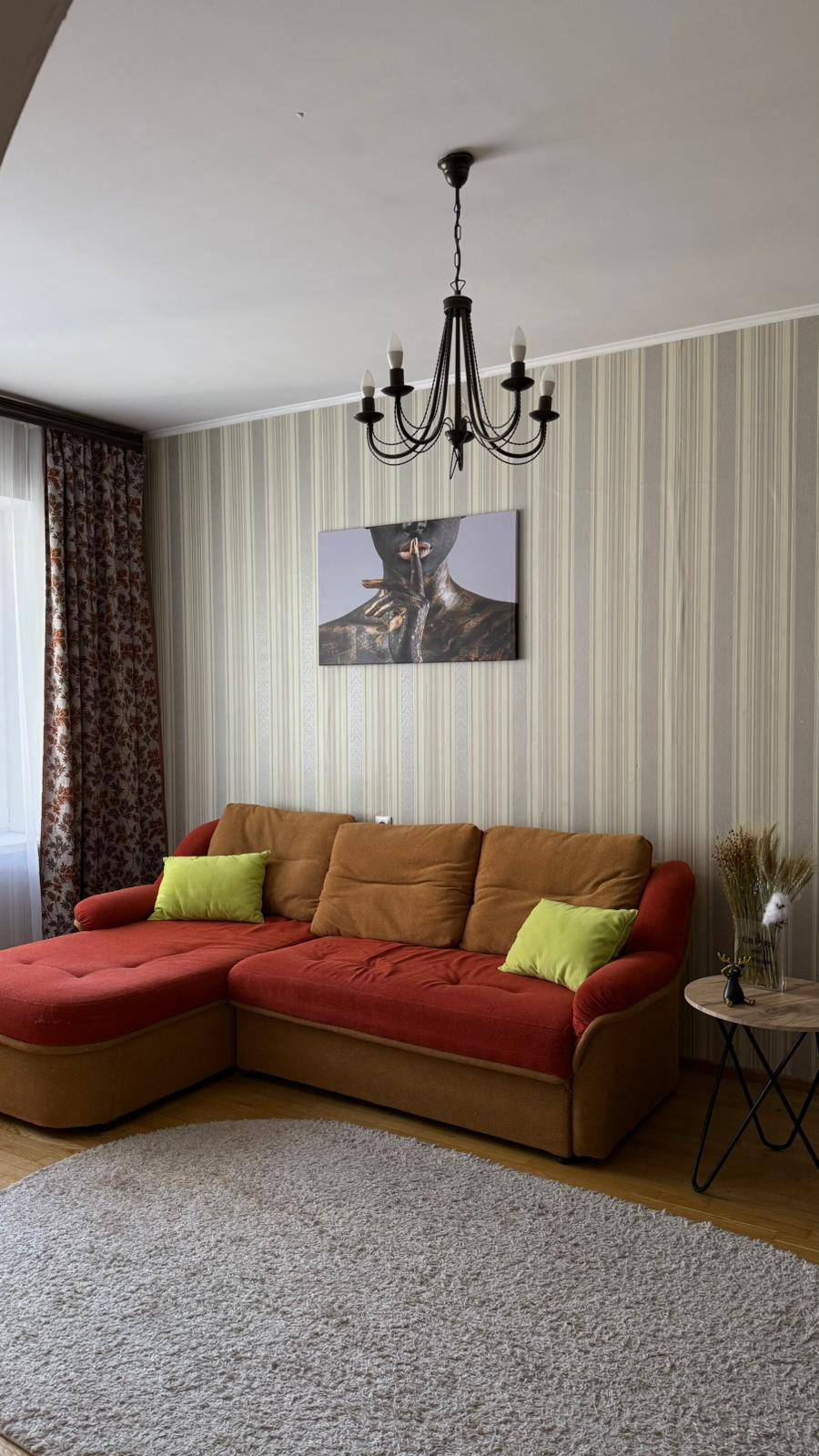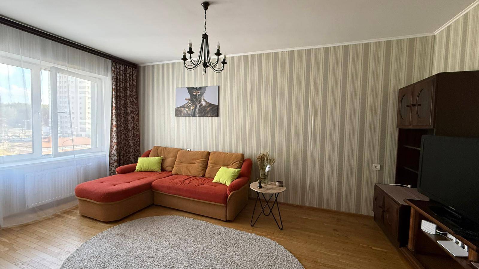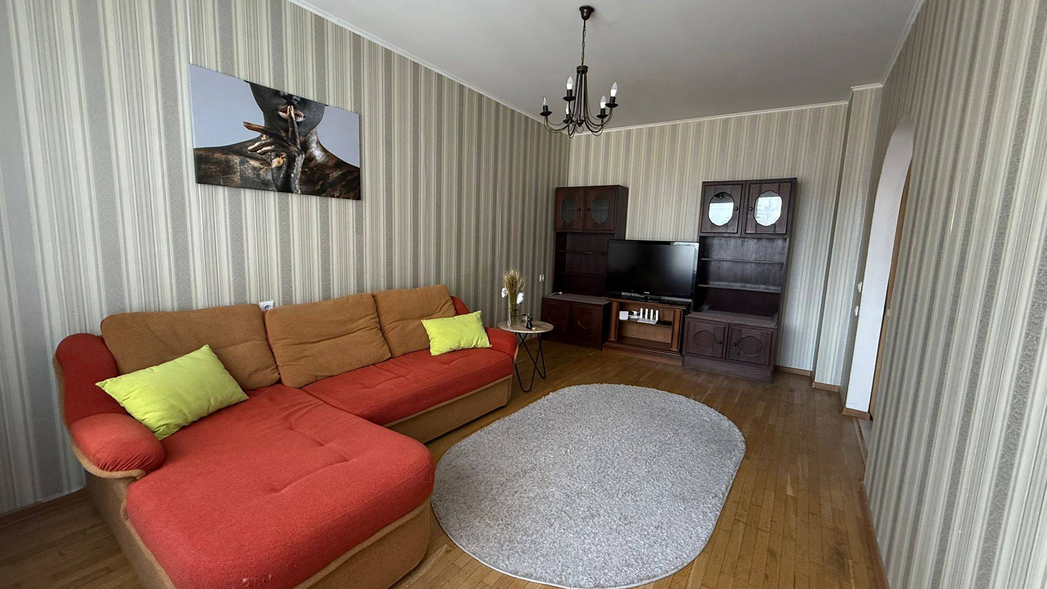 Квартира полностью обустроена качественной мебелью и бытовой техникой . Двухспальная кровать, огромный двухспальный диван, дополнительный двухместный диван ,много мест хранения.