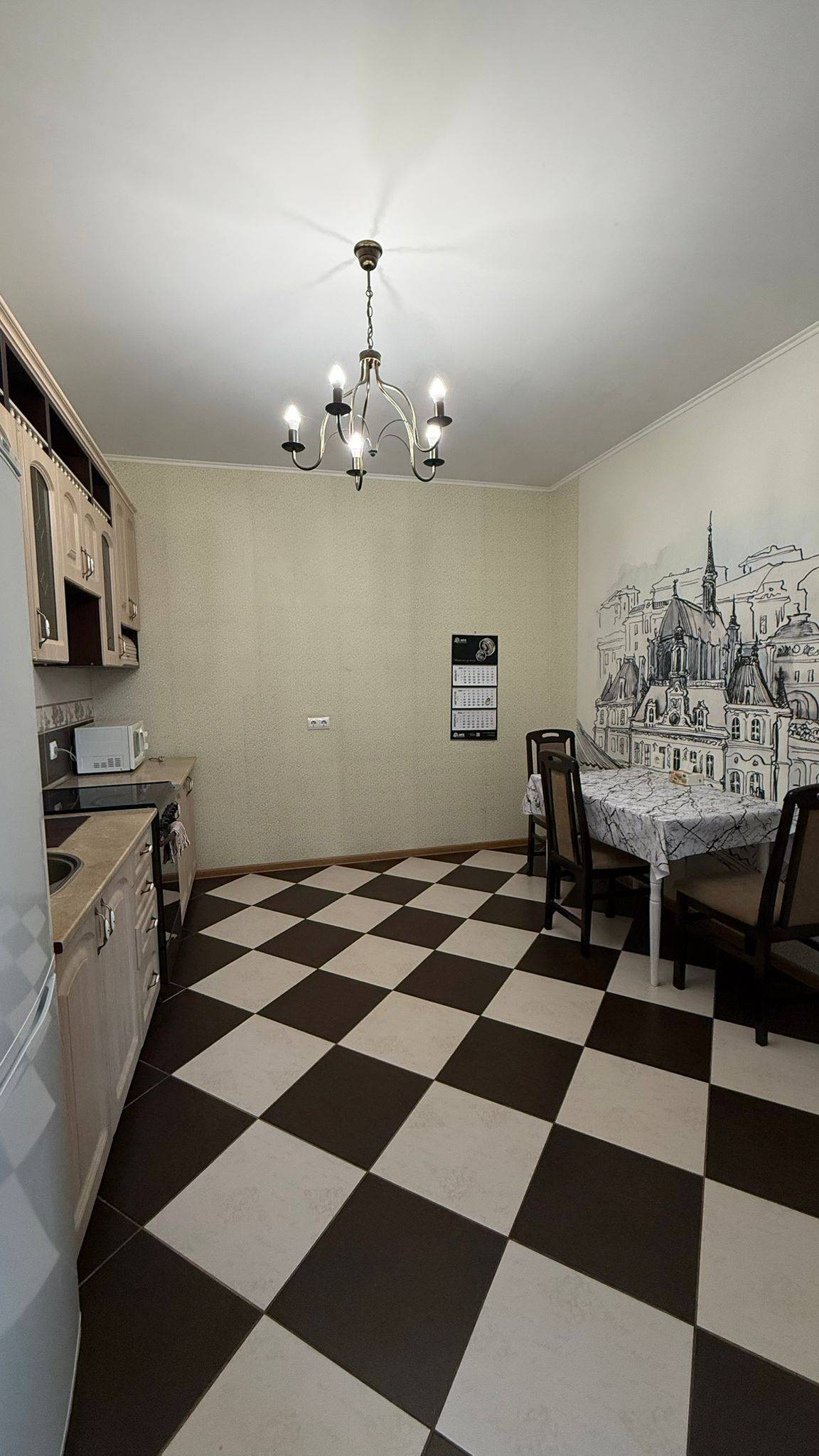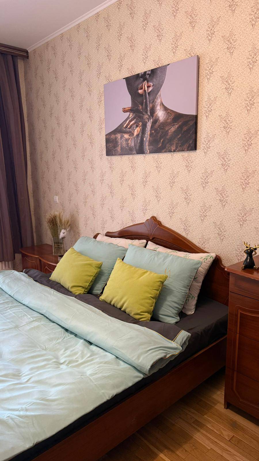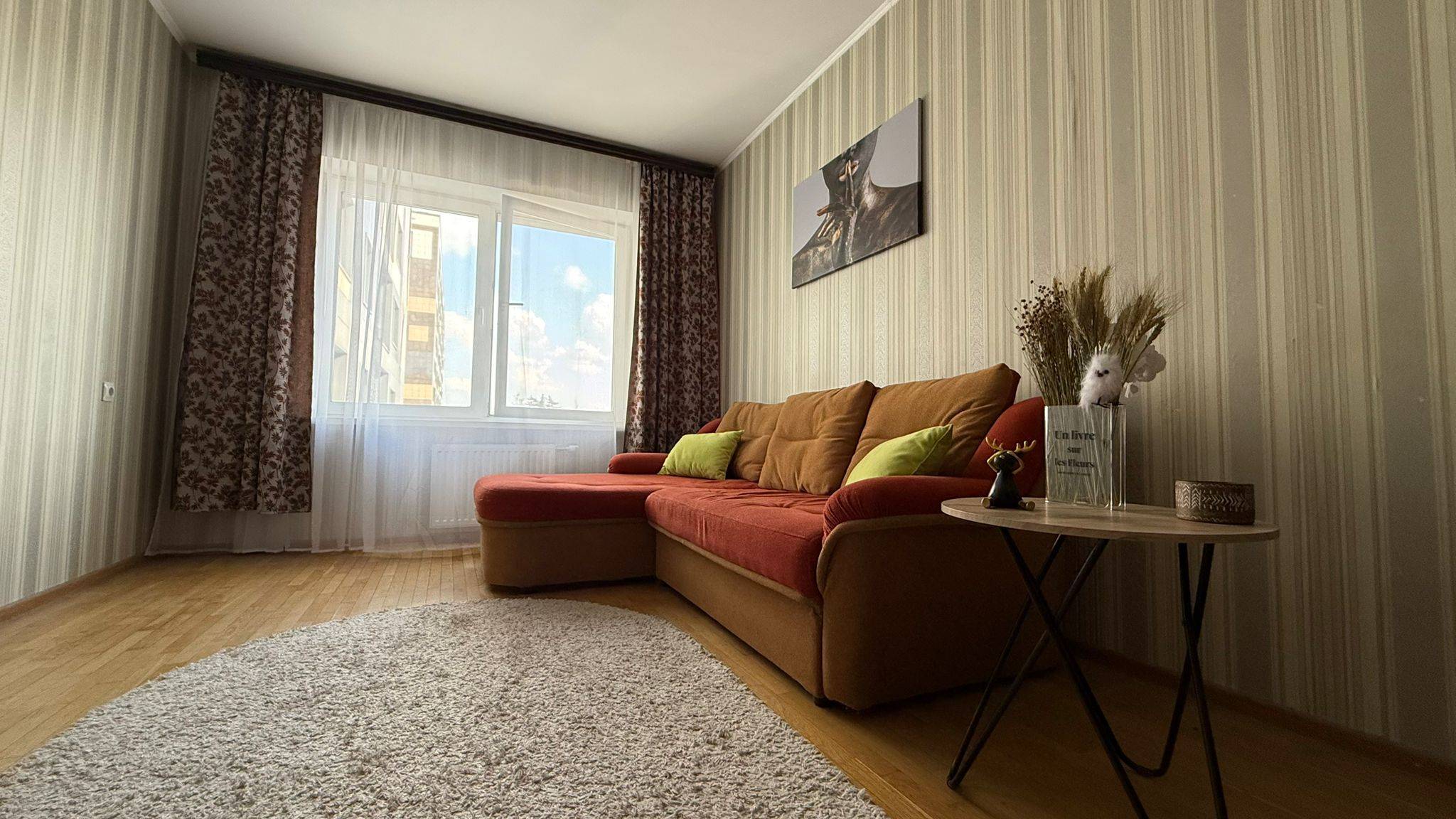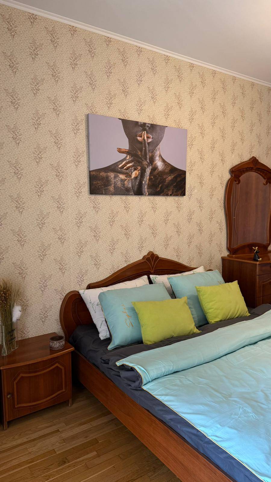 Квартира полностью обустроена качественной мебелью и бытовой техникой . Двухспальная кровать, огромный двухспальный диван, дополнительный двухместный диван ,много мест хранения.