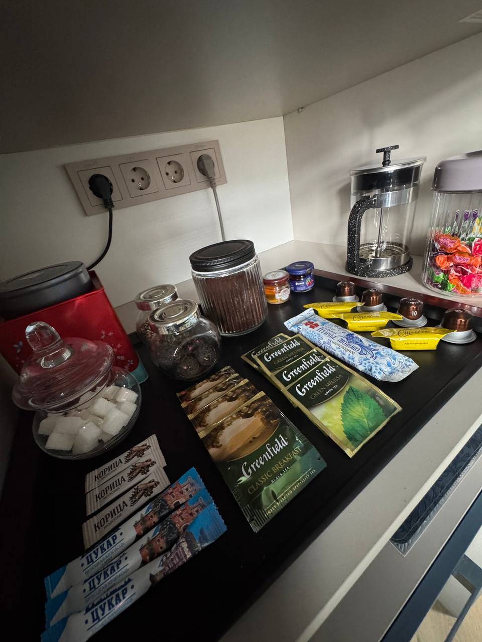 Для удобства гостей есть : фен, утюг, гладильная доска, одноразовые гигиенический принадлежности, набор полотенец и тапочек . Кофе чай и сладости.