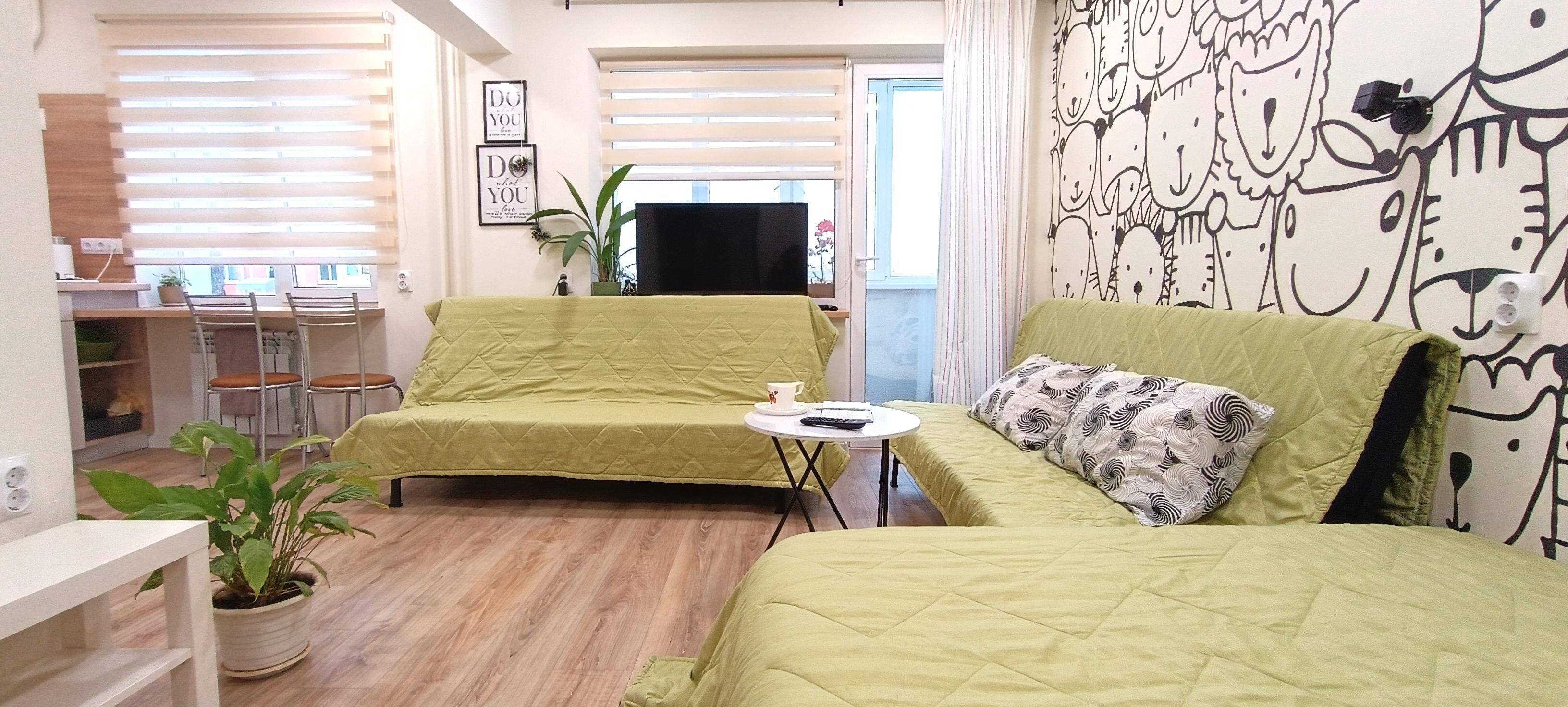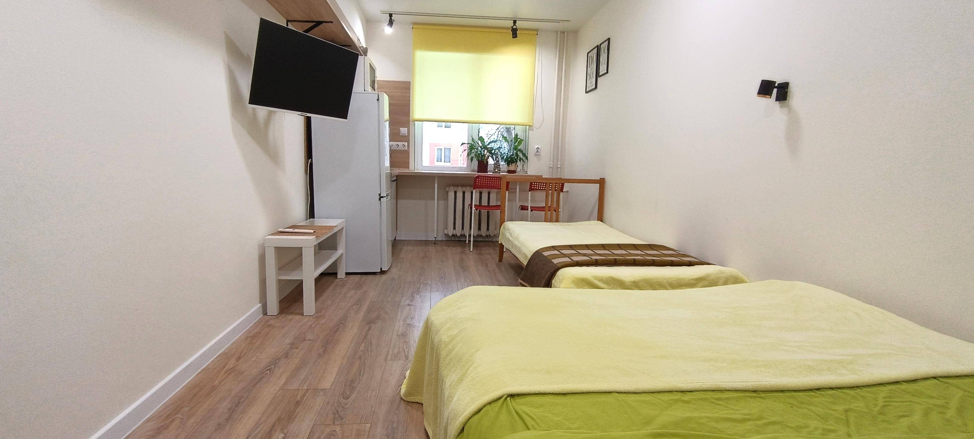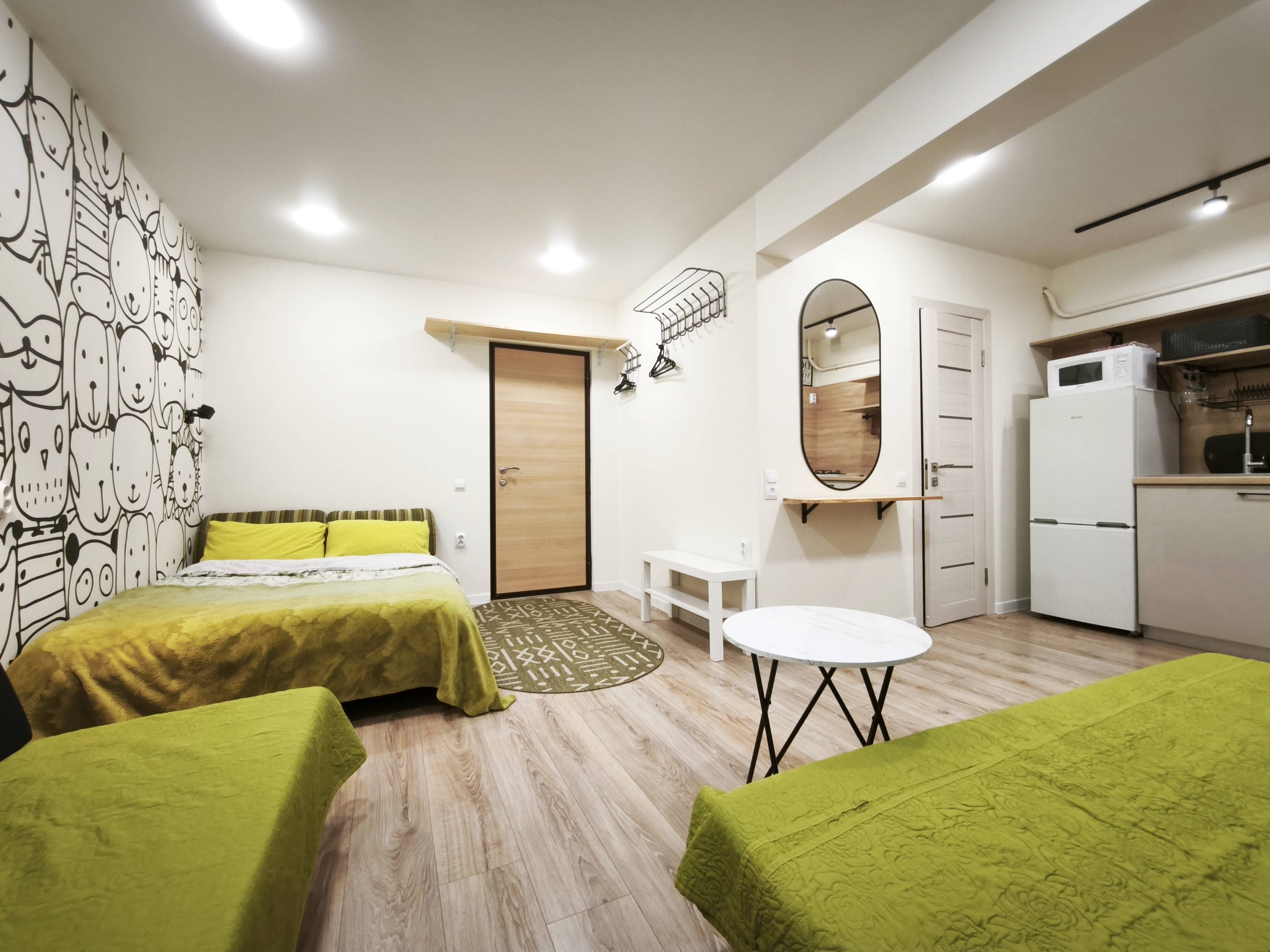 Чисто комфортно, как дома. Квартира-студия с отдельной спальней и большой лоджией. Два санузла, два телевизора. 5 раздельных спальных мест. Современный ремонт.