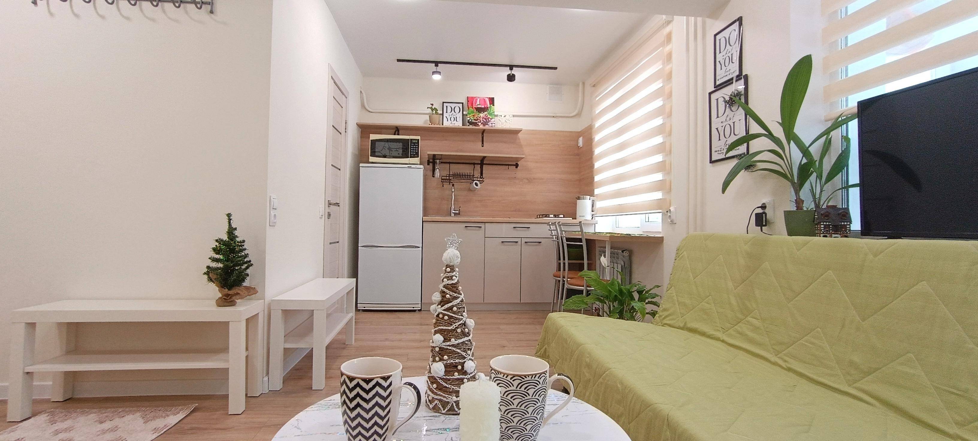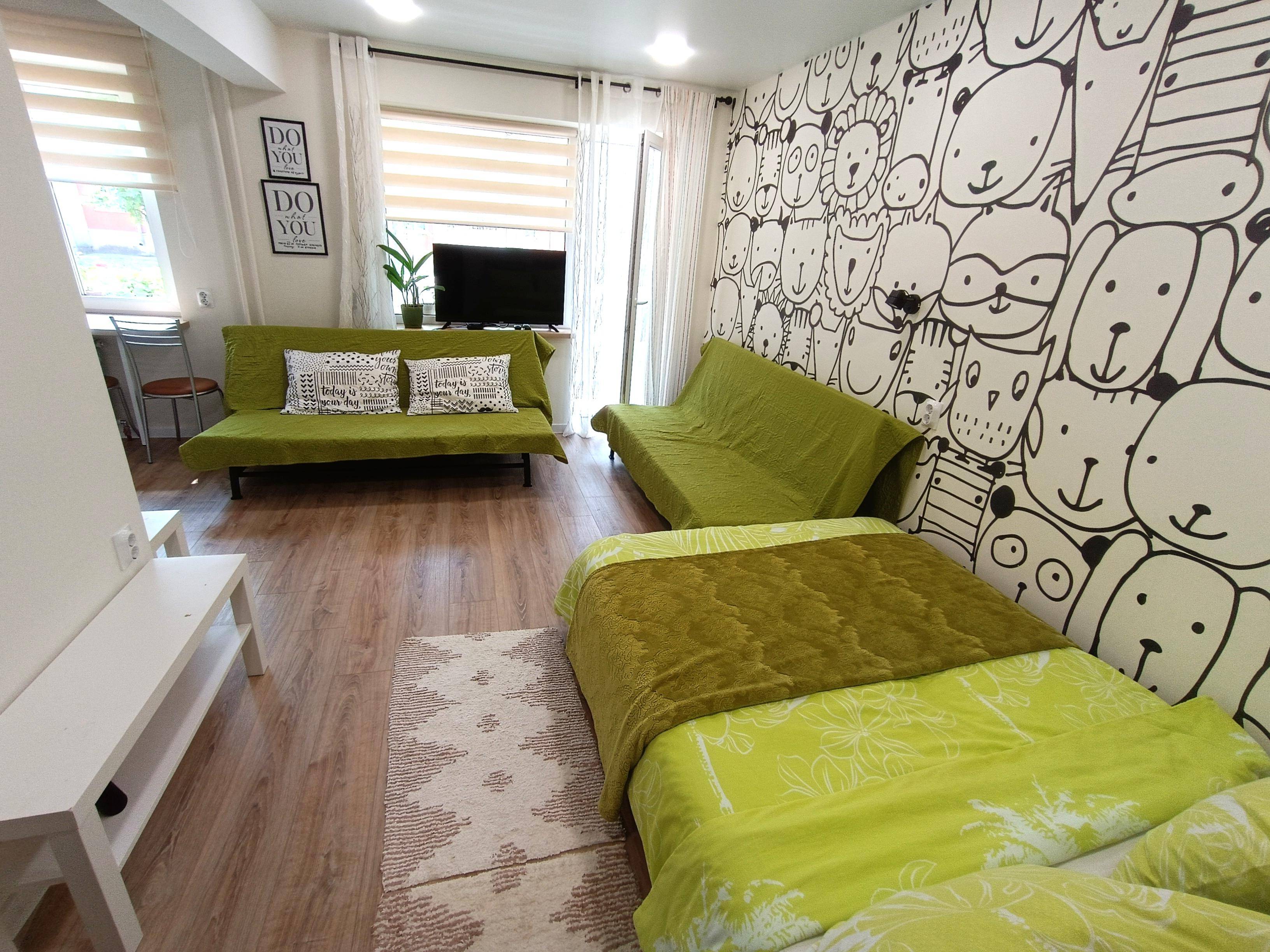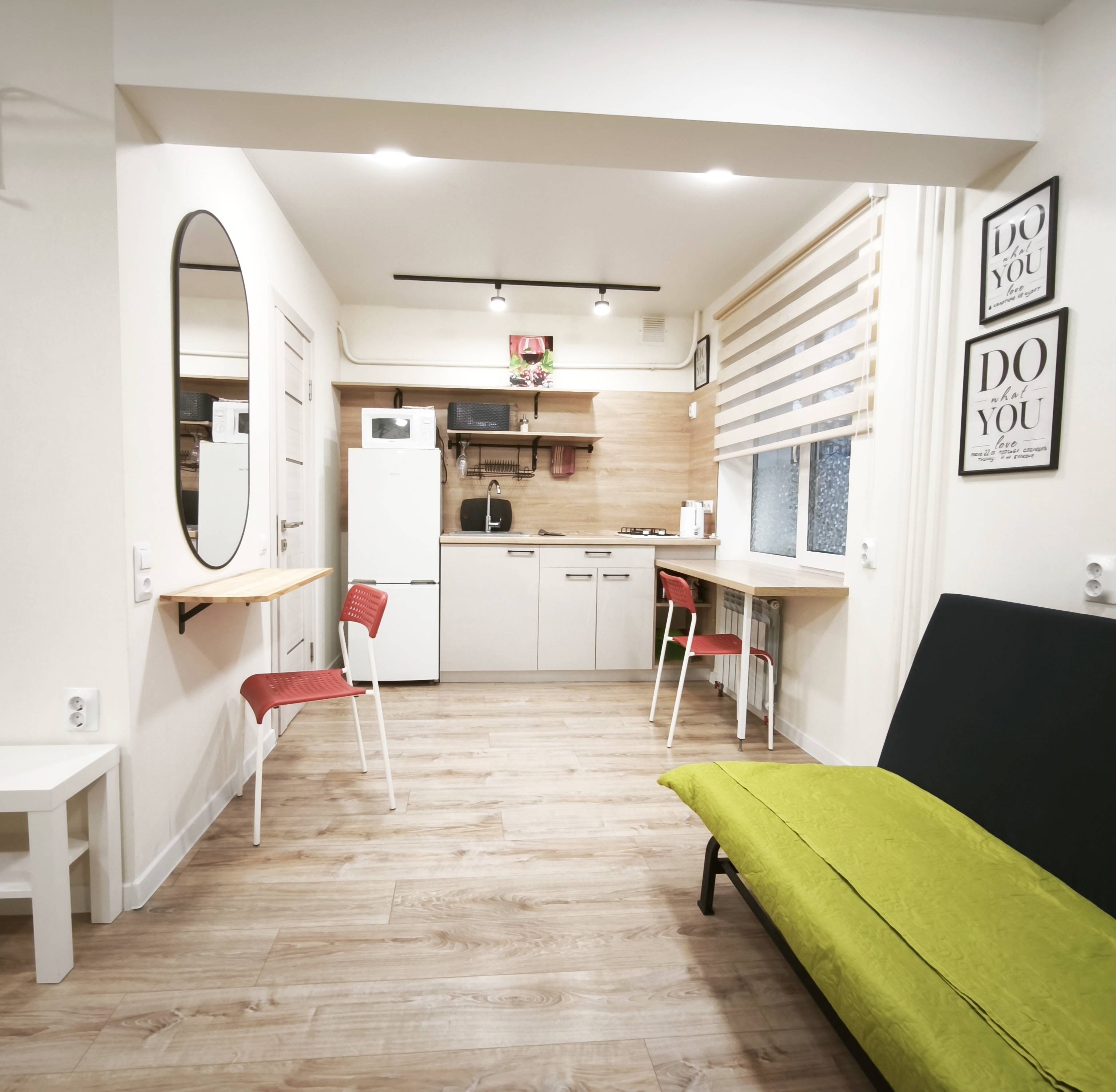 Чисто комфортно, как дома. Квартира-студия с отдельной спальней и большой лоджией. Два санузла, два телевизора. 5 раздельных спальных мест. Современный ремонт.
