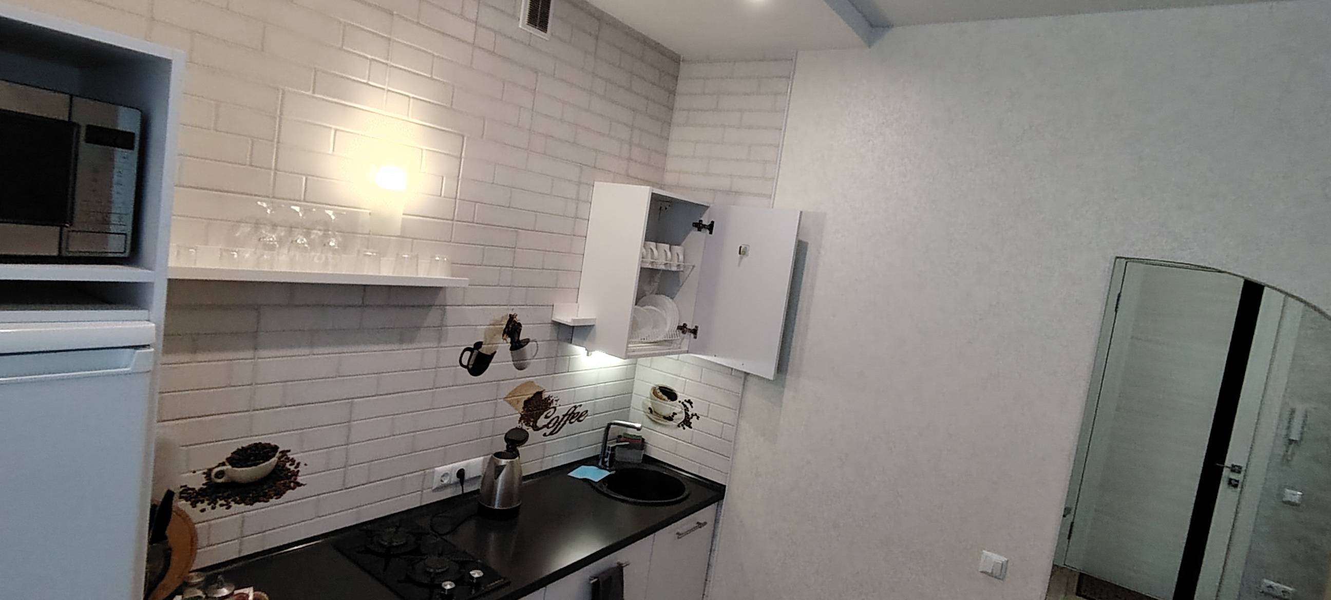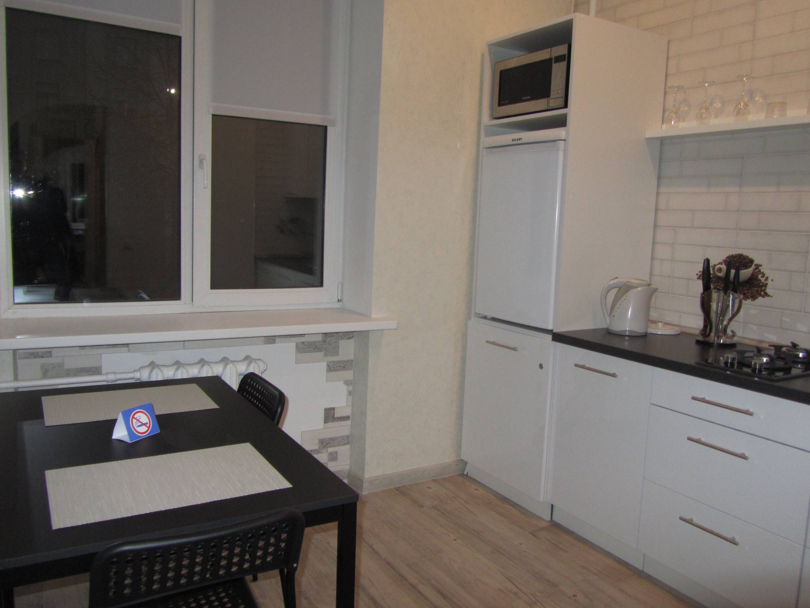 - Полностью укомплектованная кухня: посуда, чайник, микроволновка