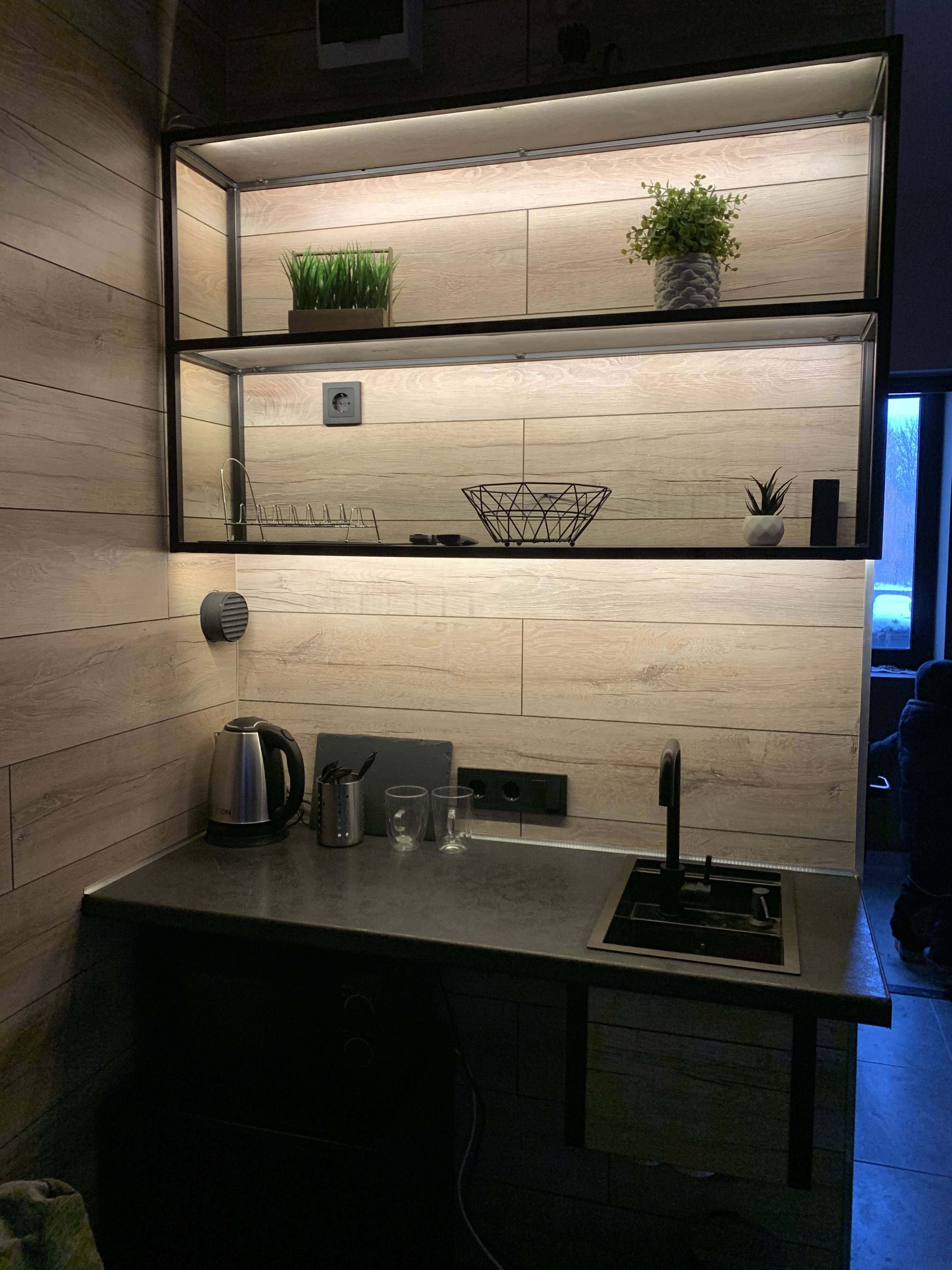 Кухонная зона с микроволновкой, холодильником и индукционной плиткой.