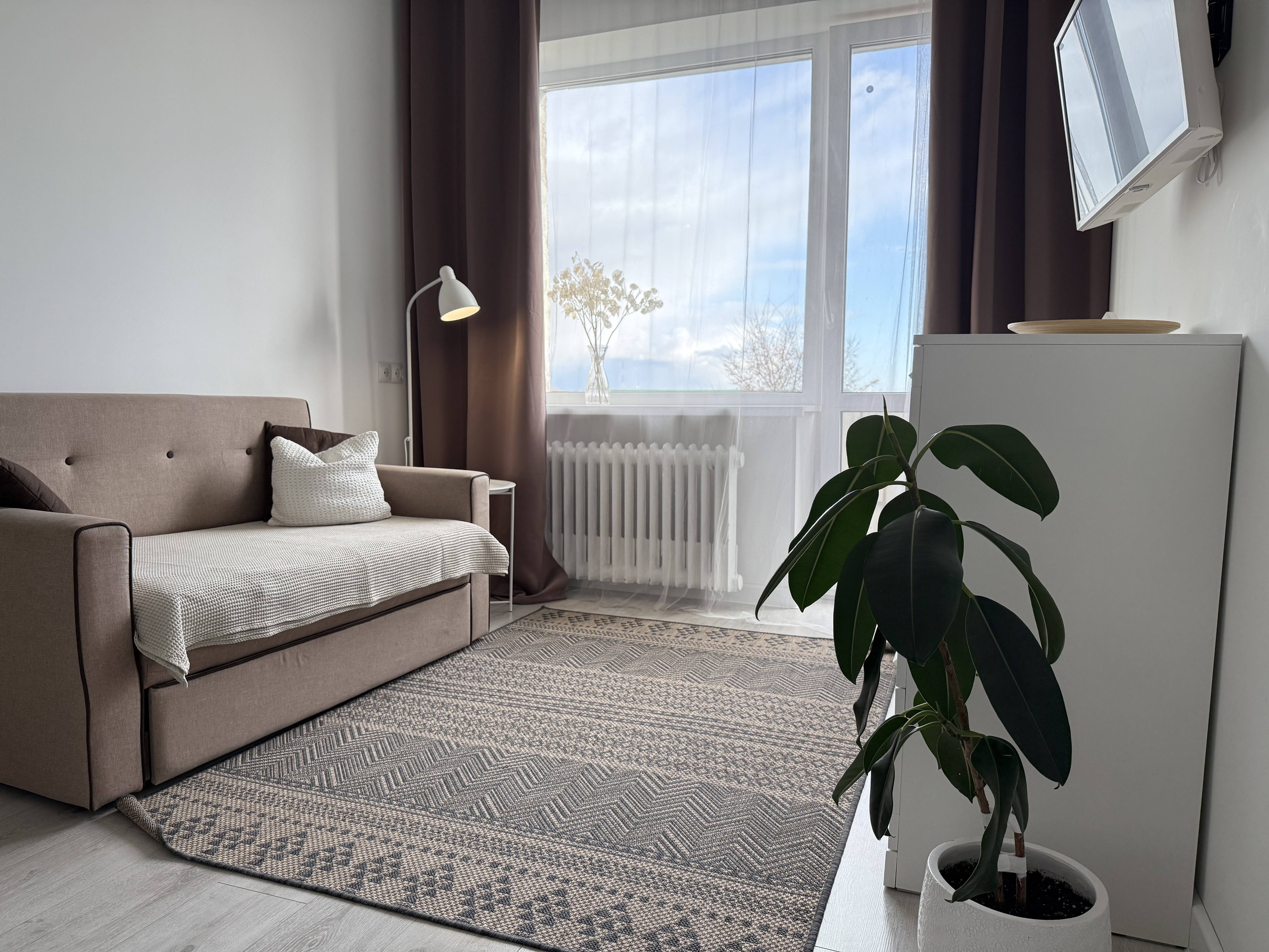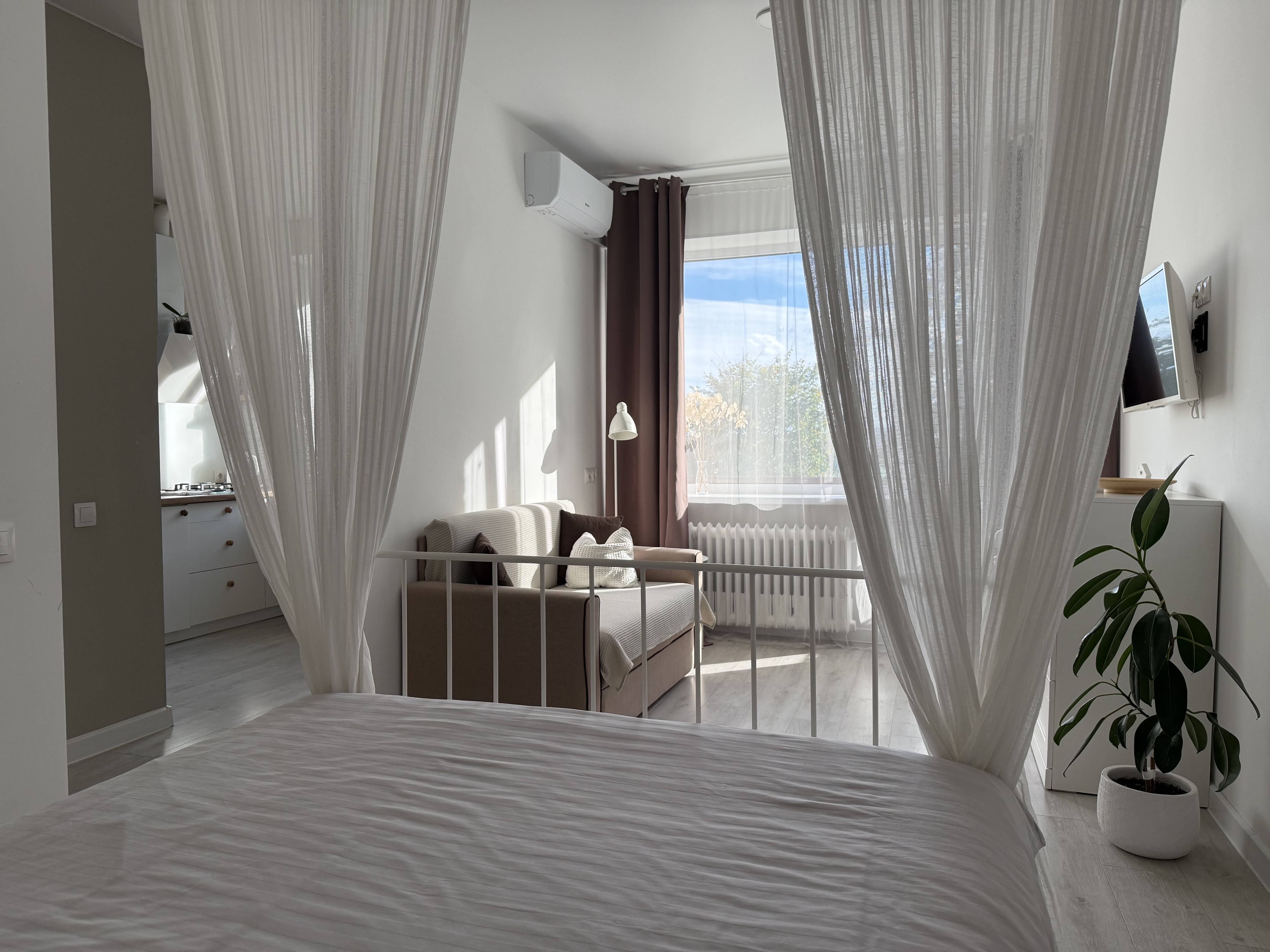 Стильная квартира на верхнем 4-м этаже с высокими потолками, Идеальна для пары, индивидуального гостя, фотосессии. В самом центре , возможно с бесконтактным входом, окна не на проспект, светлая, теплая, кондиционер, SMART-TV, нижний свет, водонагреватель, москитные сетки, балкон, 100% соответствие фотографиям.
