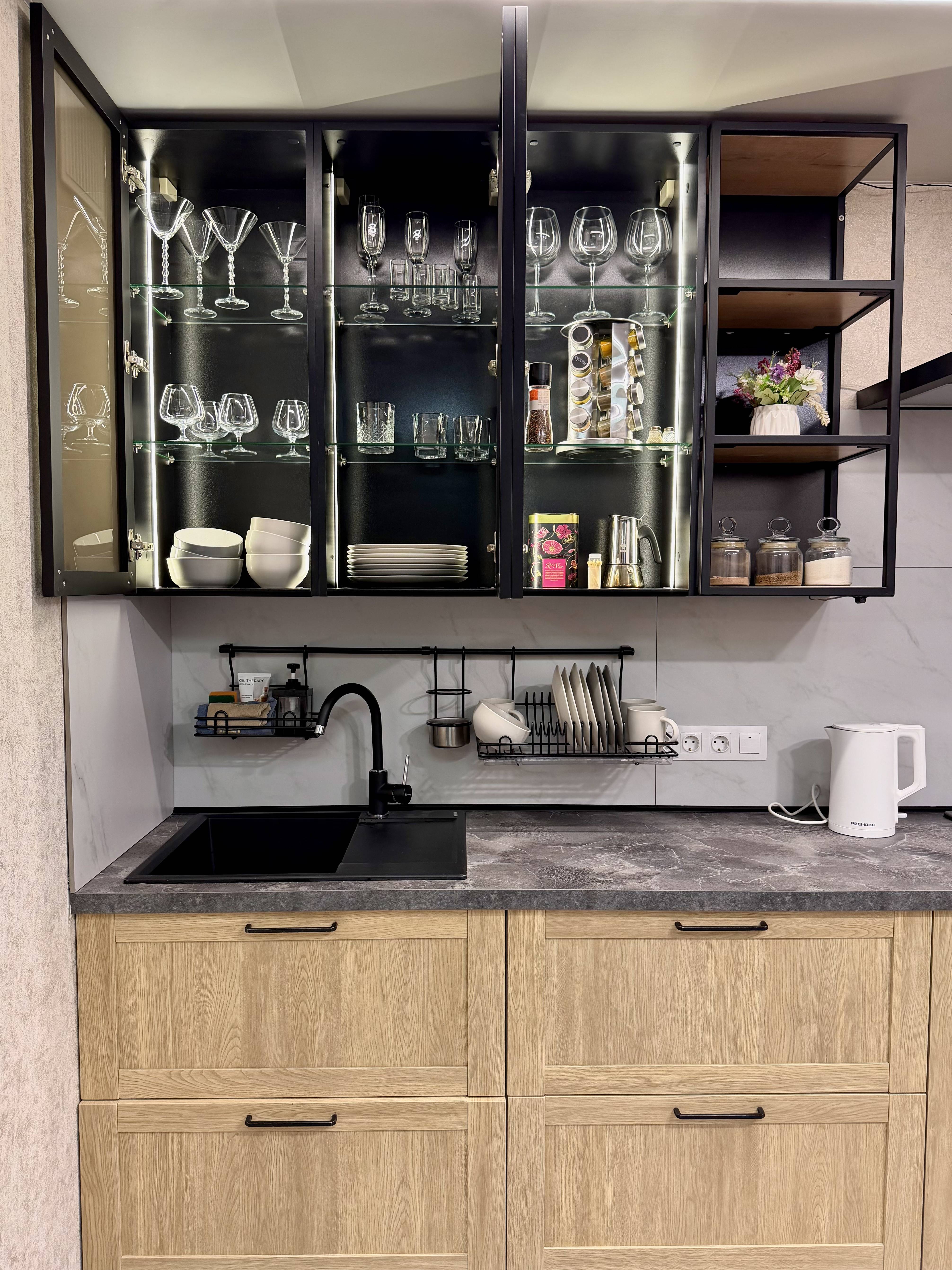 -полностью оборудования кухня (холодильник, электрический чайник, новая посуда, вся бакалея для приготовления блюд, чай 1, кофе бесплатно).
