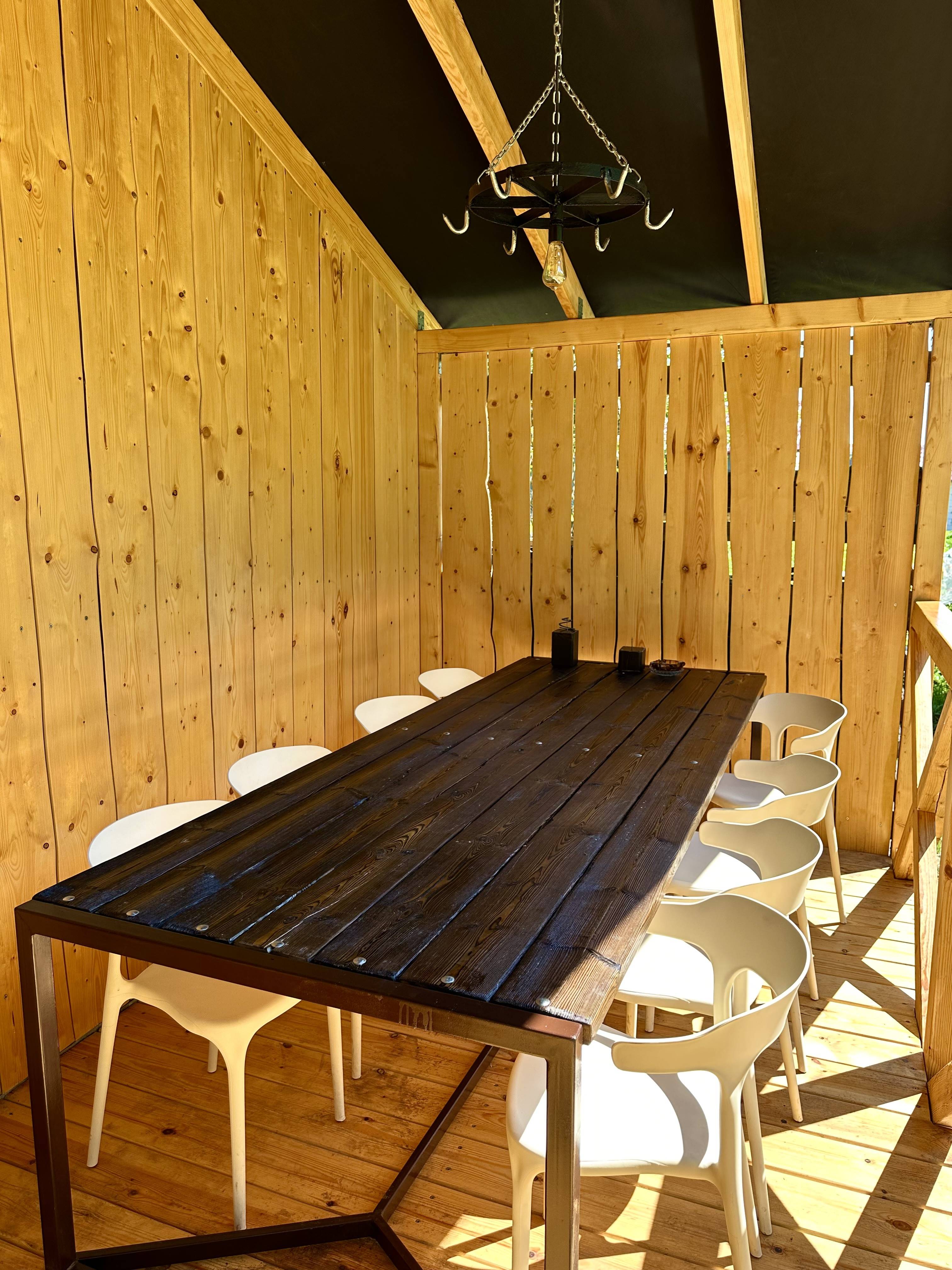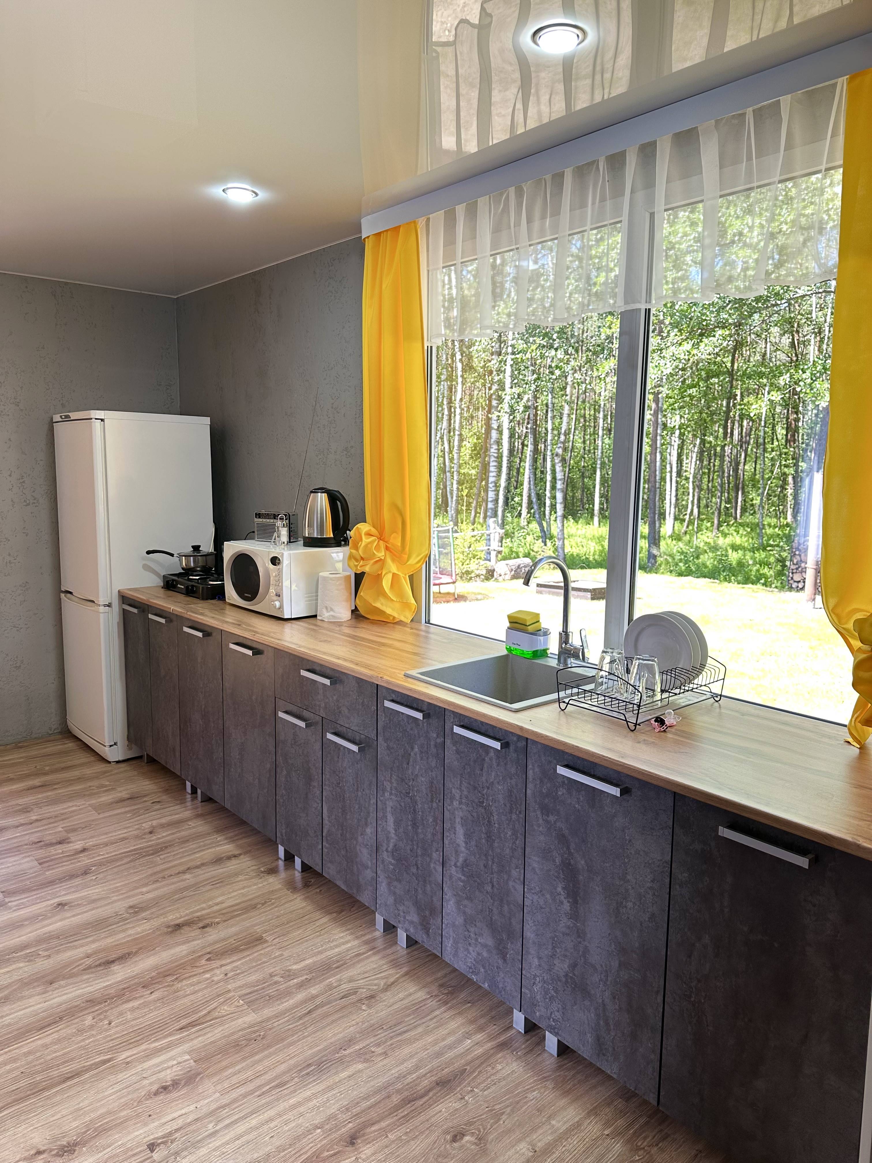 Вместительность 10 человек. В доме есть 4 комнаты в каждой 2-х спальная кровать, прихожая с большим диваном и уличная терраса с качелями. На территории собственная скважина.
