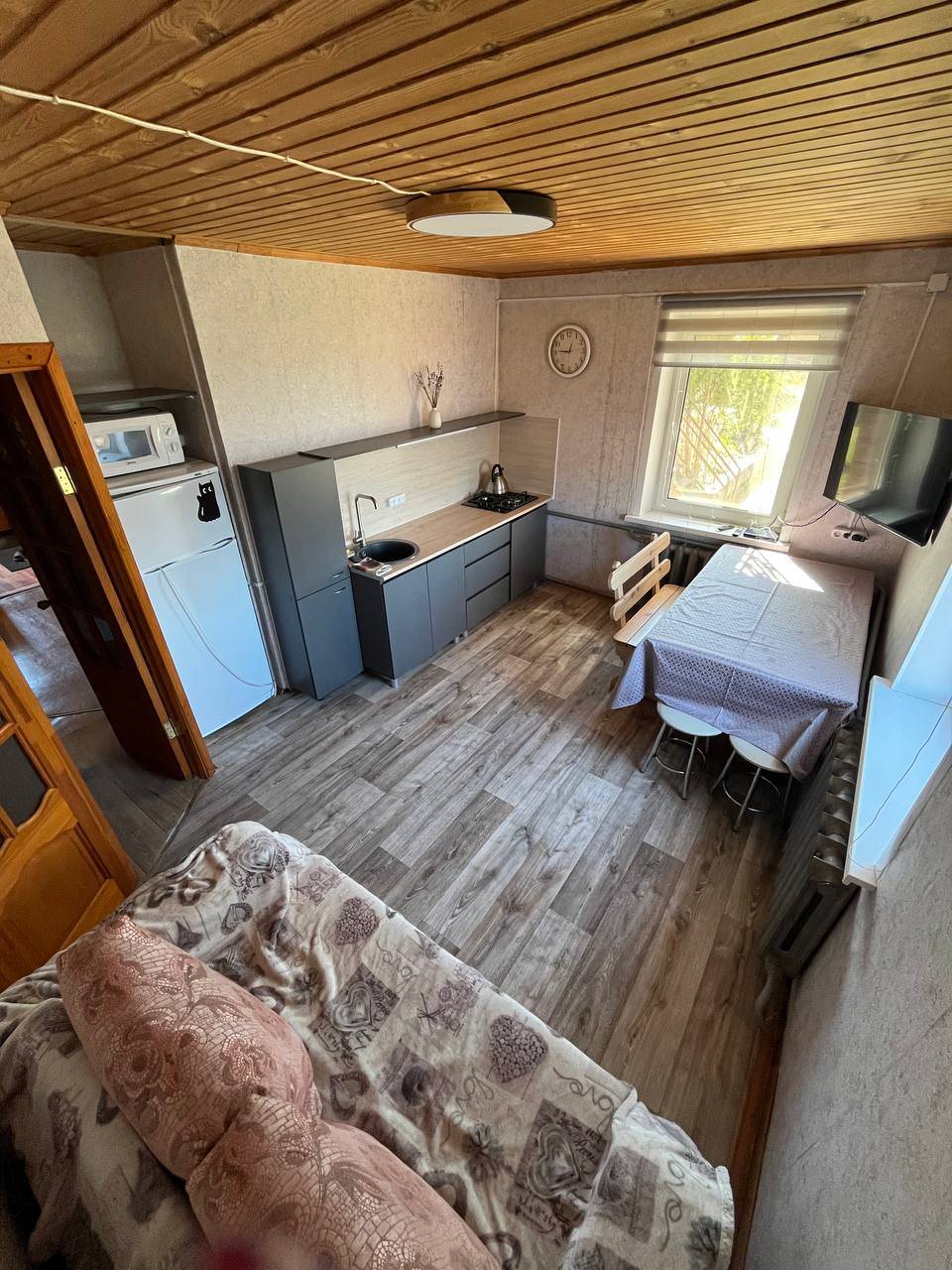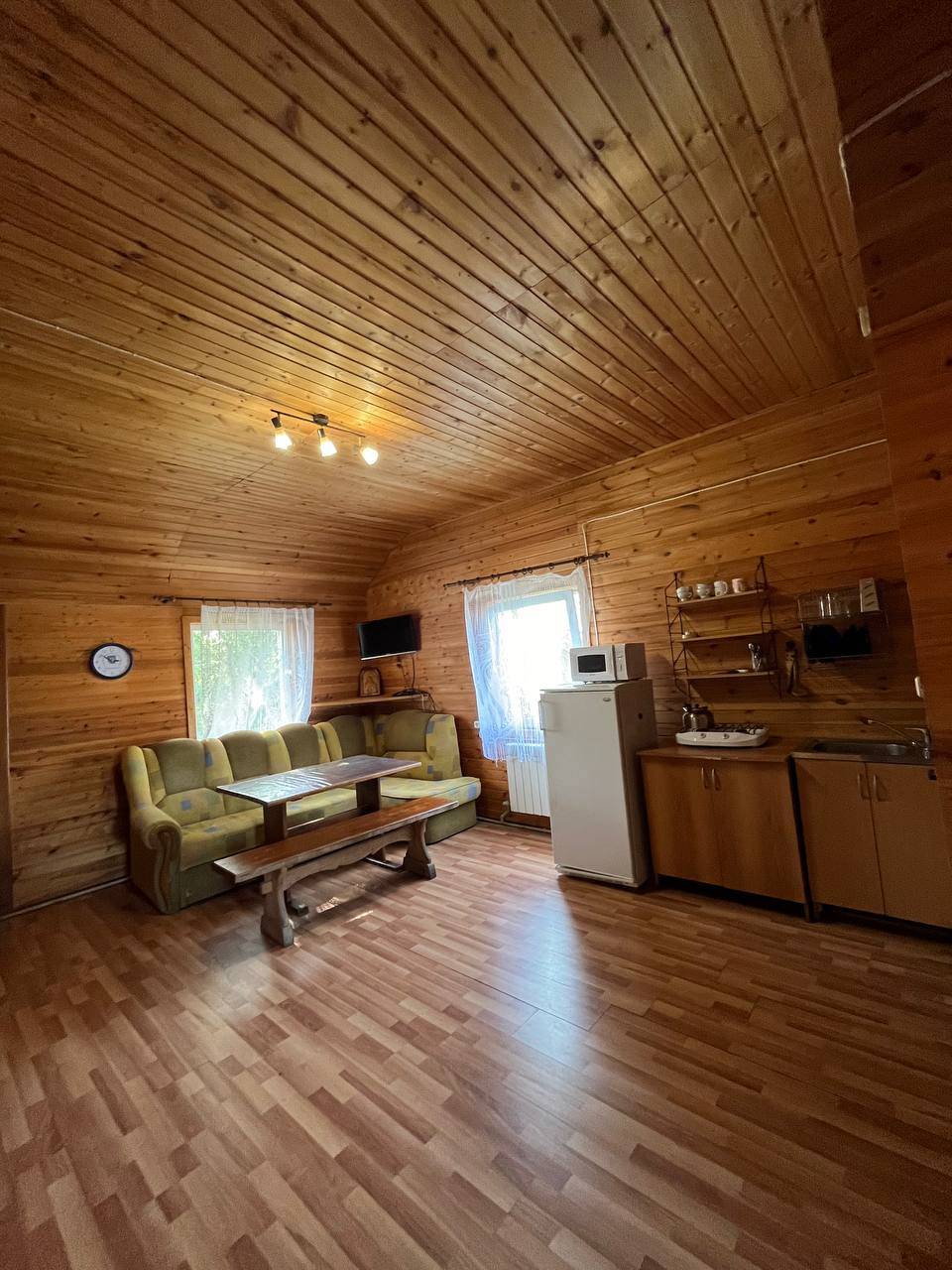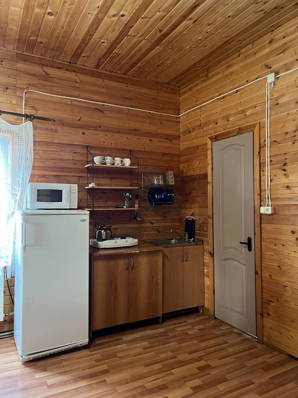 Первый этаж: две спальные комнаты (2 кровати 140х200 и одна 90х200), кухня-столовая со всем необходимым (холодильник, плита, холодная и горячая вода, посуда, микроволновка), санузел с душем. Вместимость 4 чел.